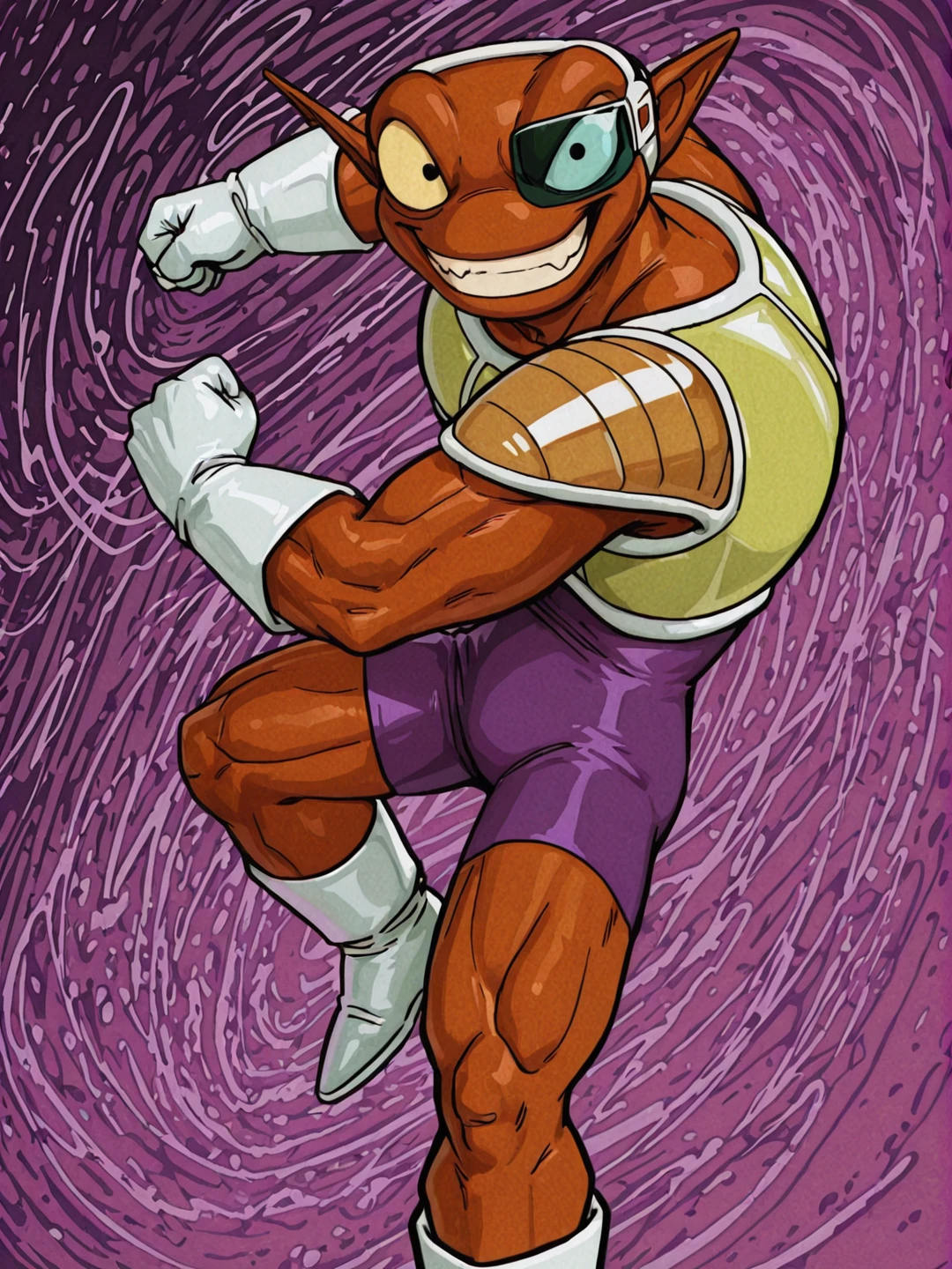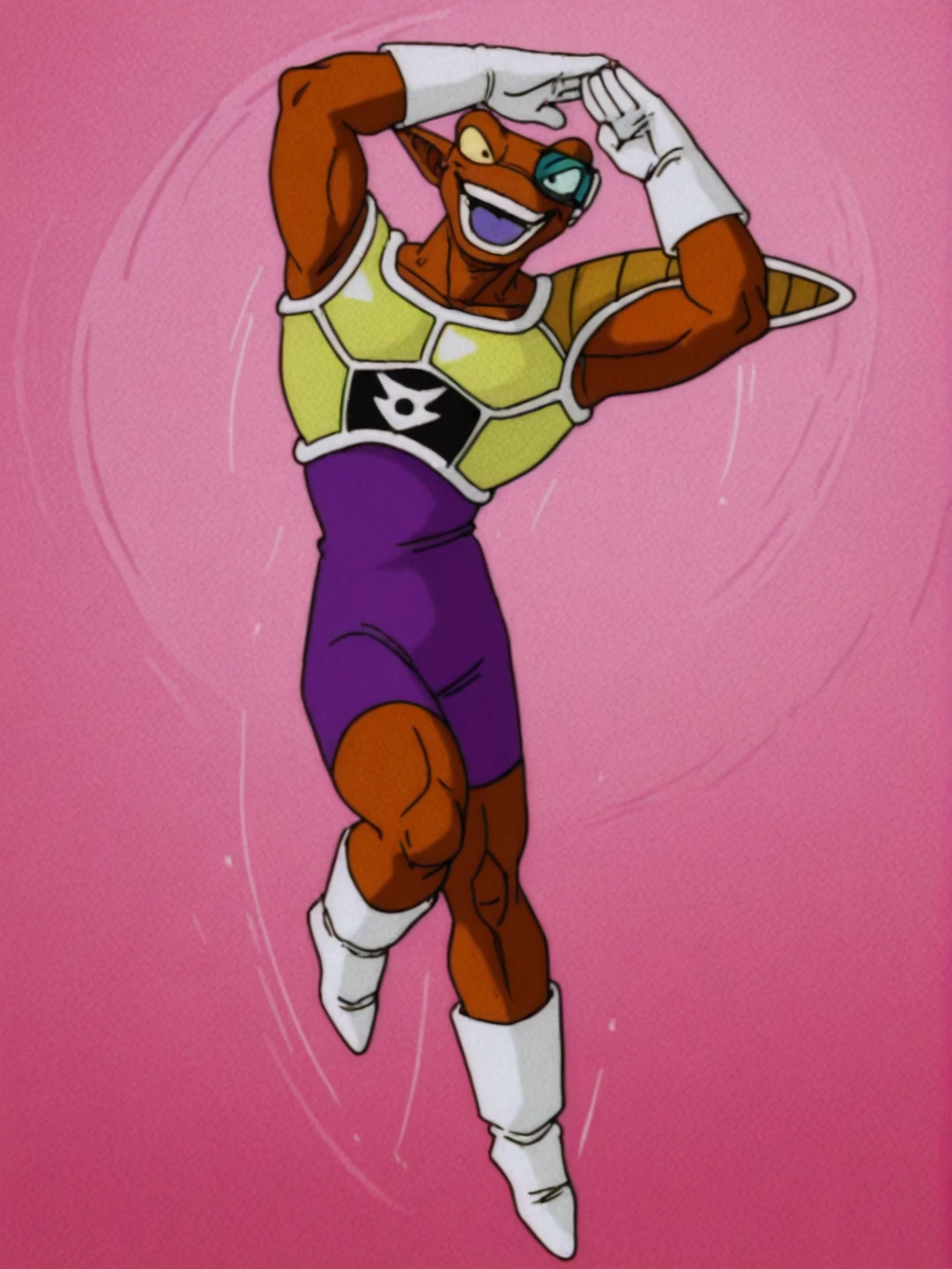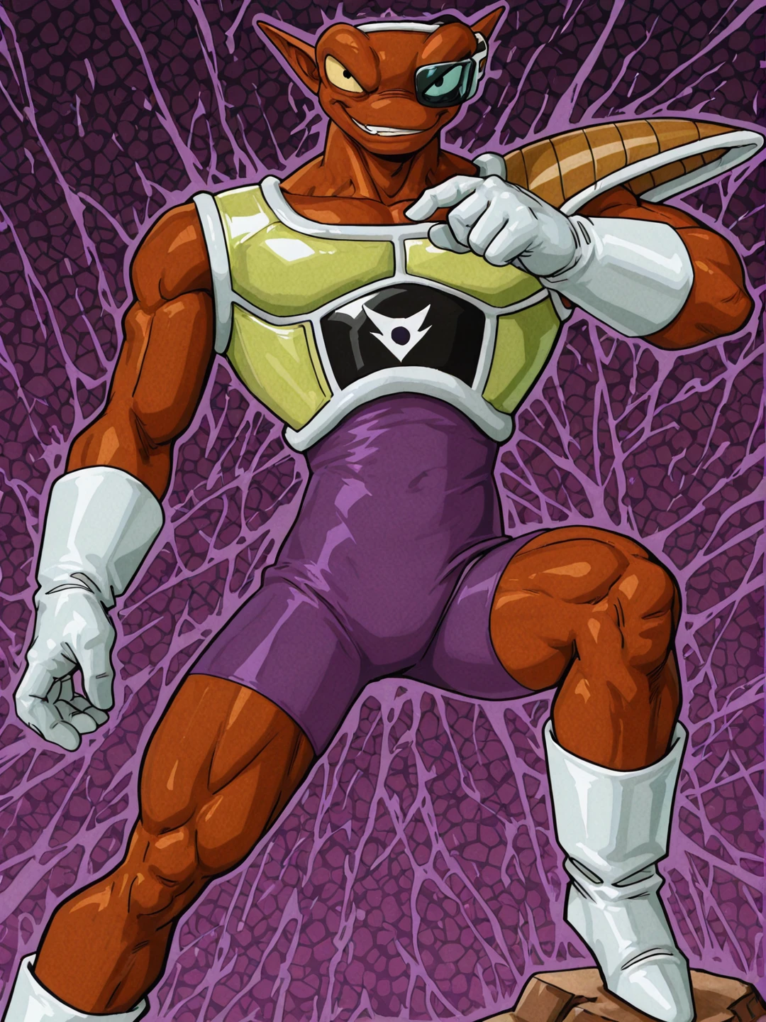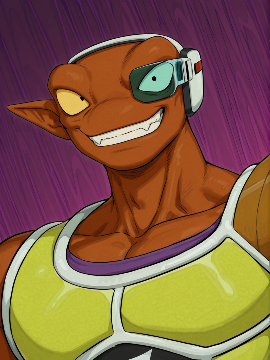 n31zdbz, brown skin, muscular male, manly, pointy ears, thick eyebrows, black eyes,scouter, purple bodysuit, yellow saiyan armor, single pauldron, white gloves, white footwearOTHER TRIGGERS: