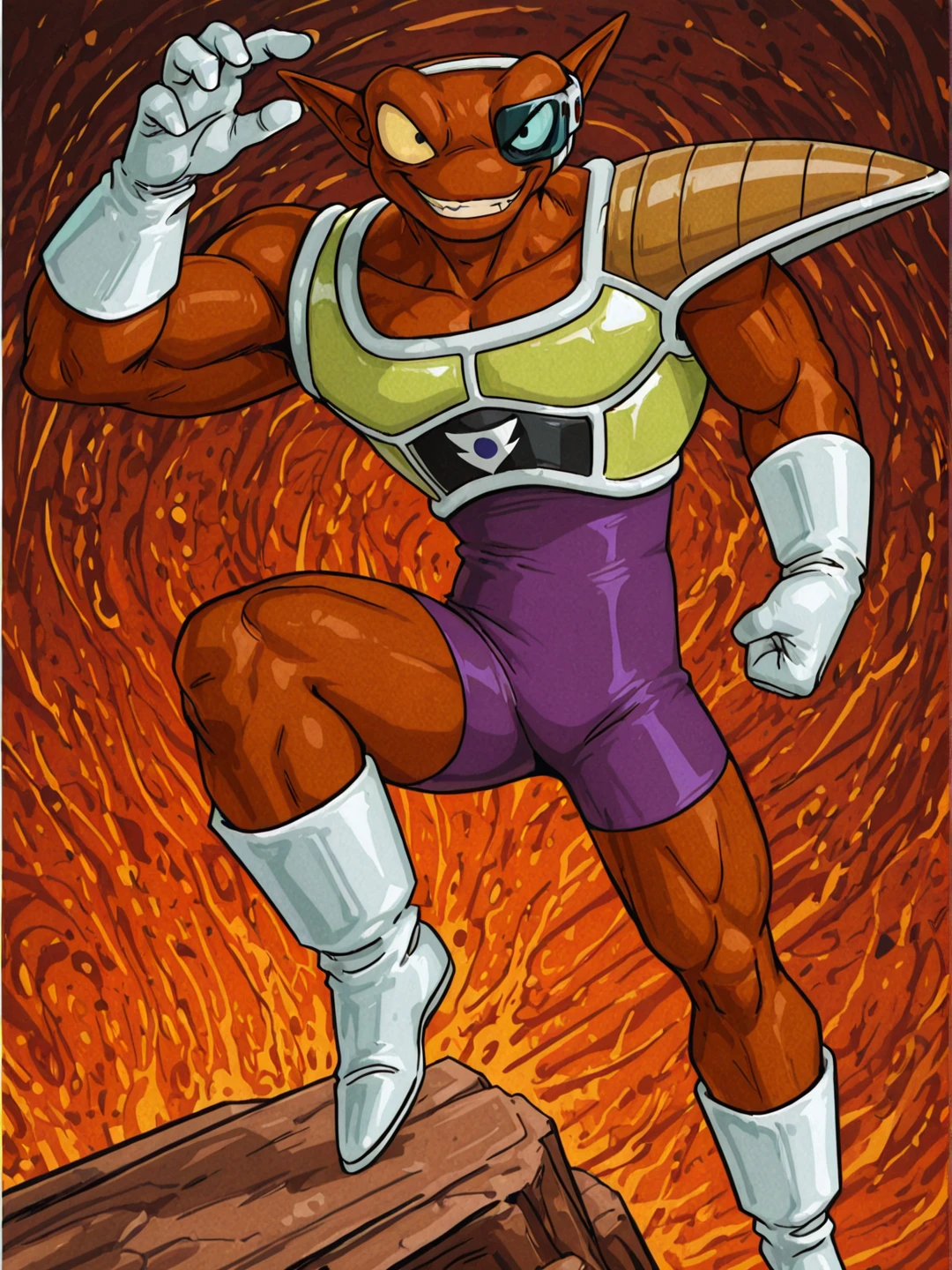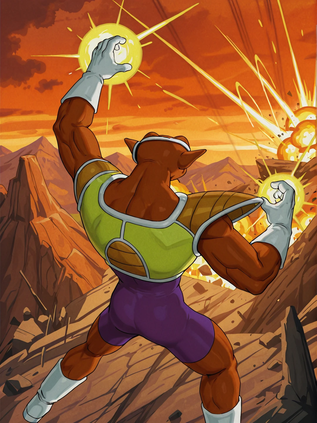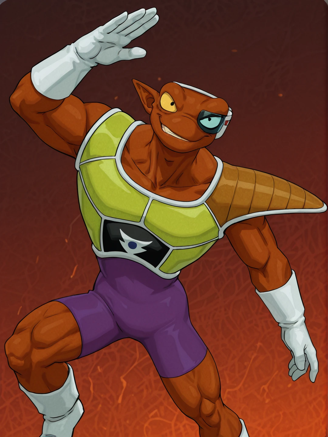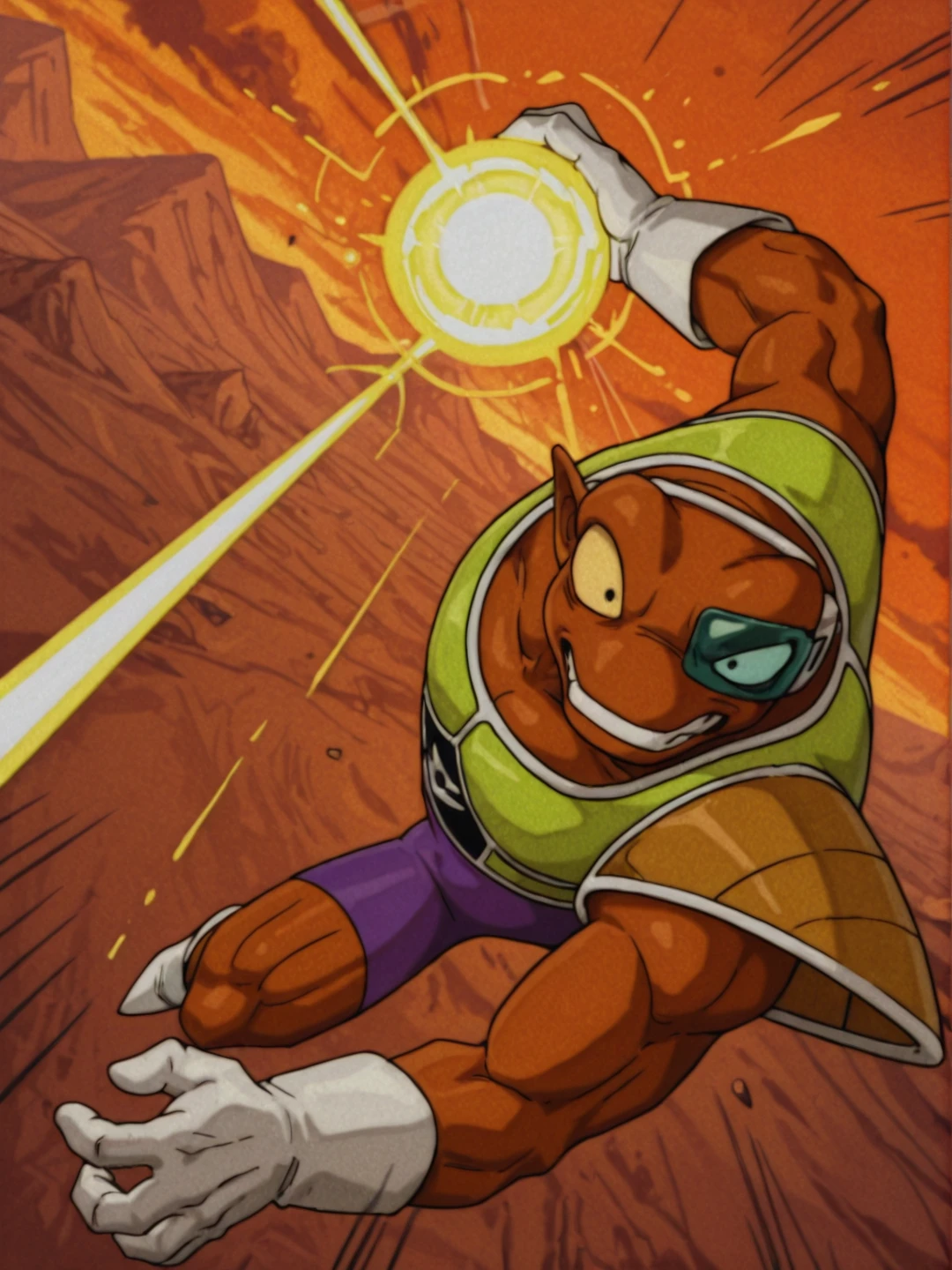 n31zdbz, brown skin, muscular male, manly, pointy ears, thick eyebrows, black eyes,scouter, purple bodysuit, yellow saiyan armor, single pauldron, white gloves, white footwearOTHER TRIGGERS: