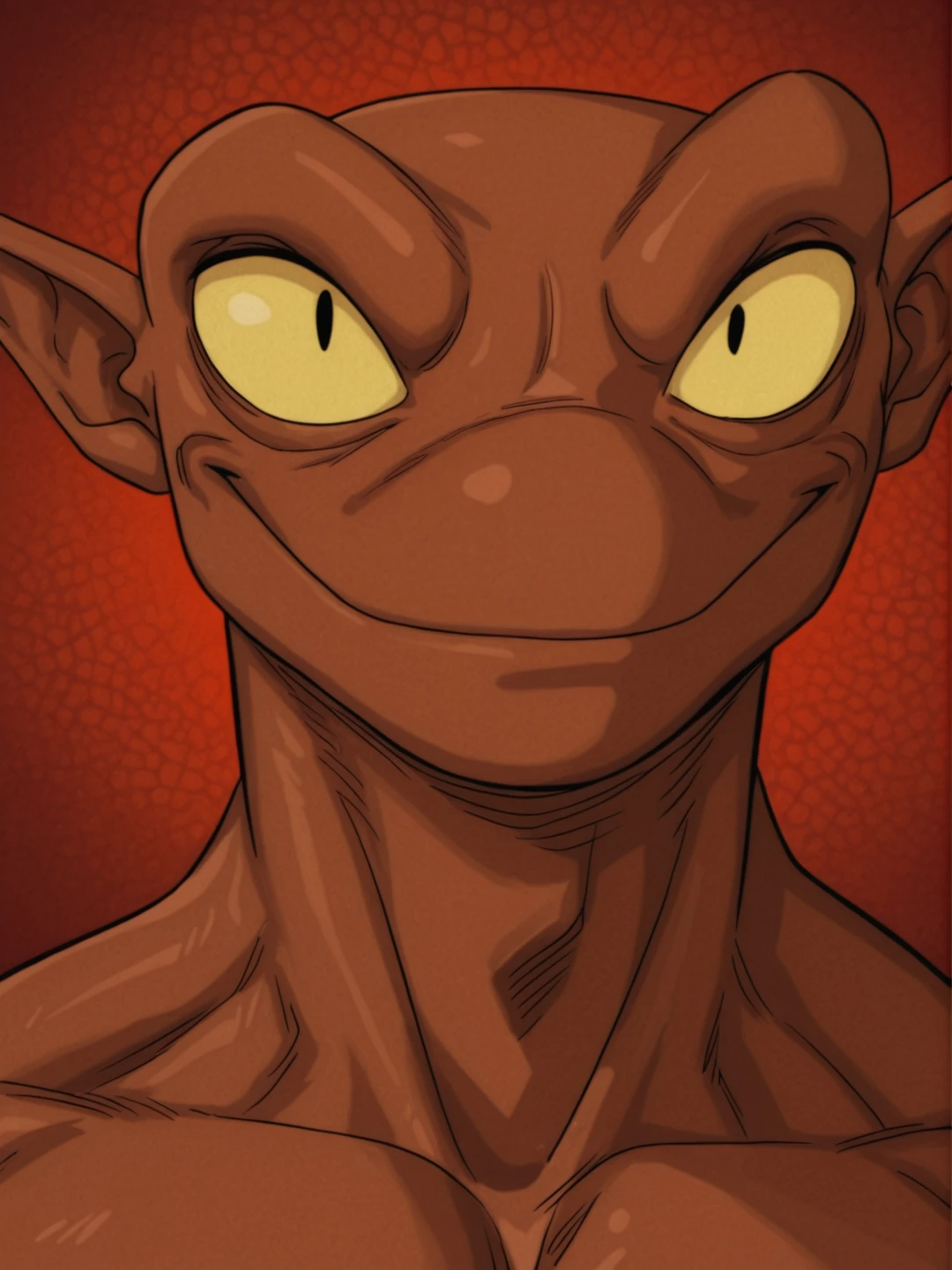 n31zdbz, brown skin, muscular male, manly, pointy ears, thick eyebrows, black eyes