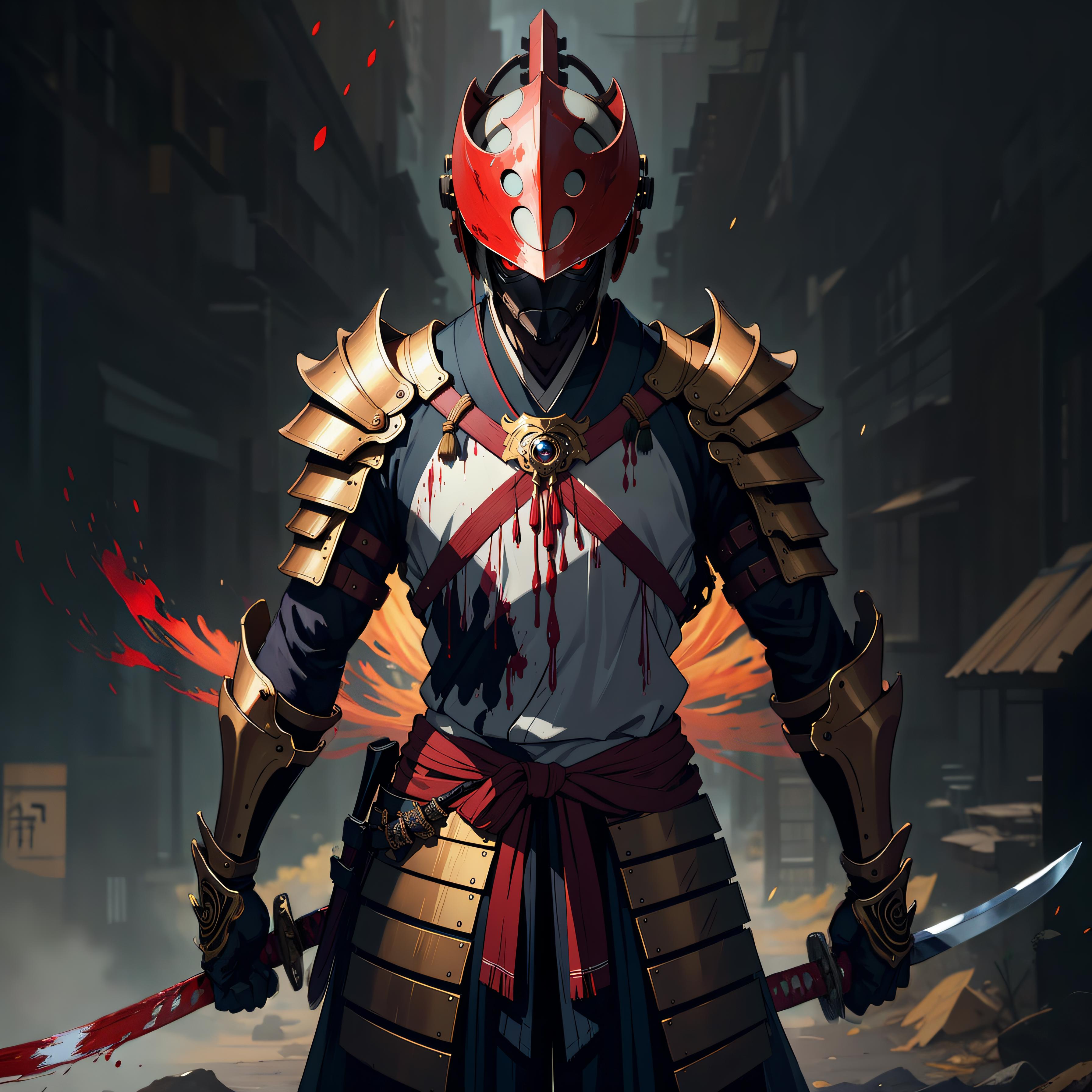 armor, solo, weapon, holding weapon, helmet, shoulder armor, mask, full body,