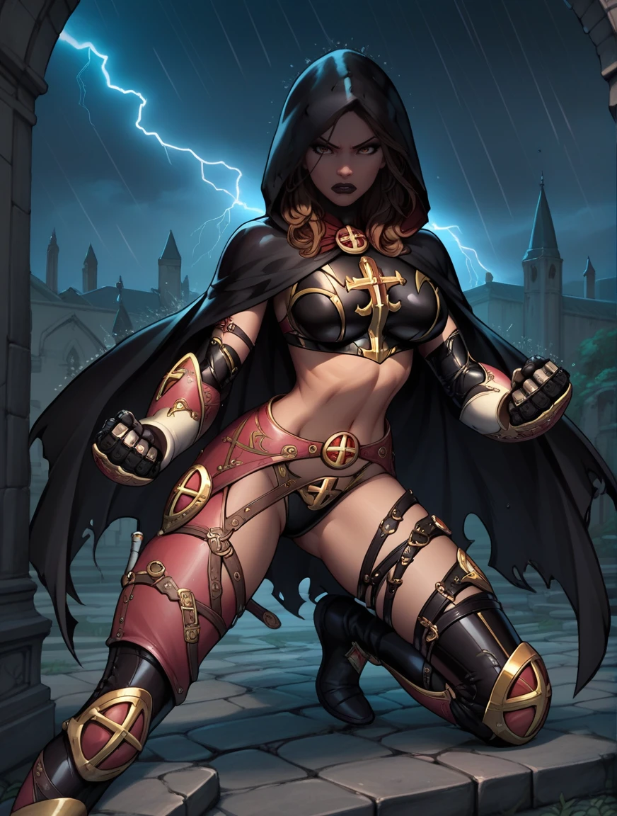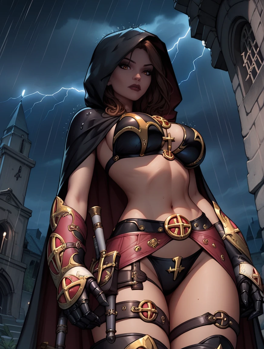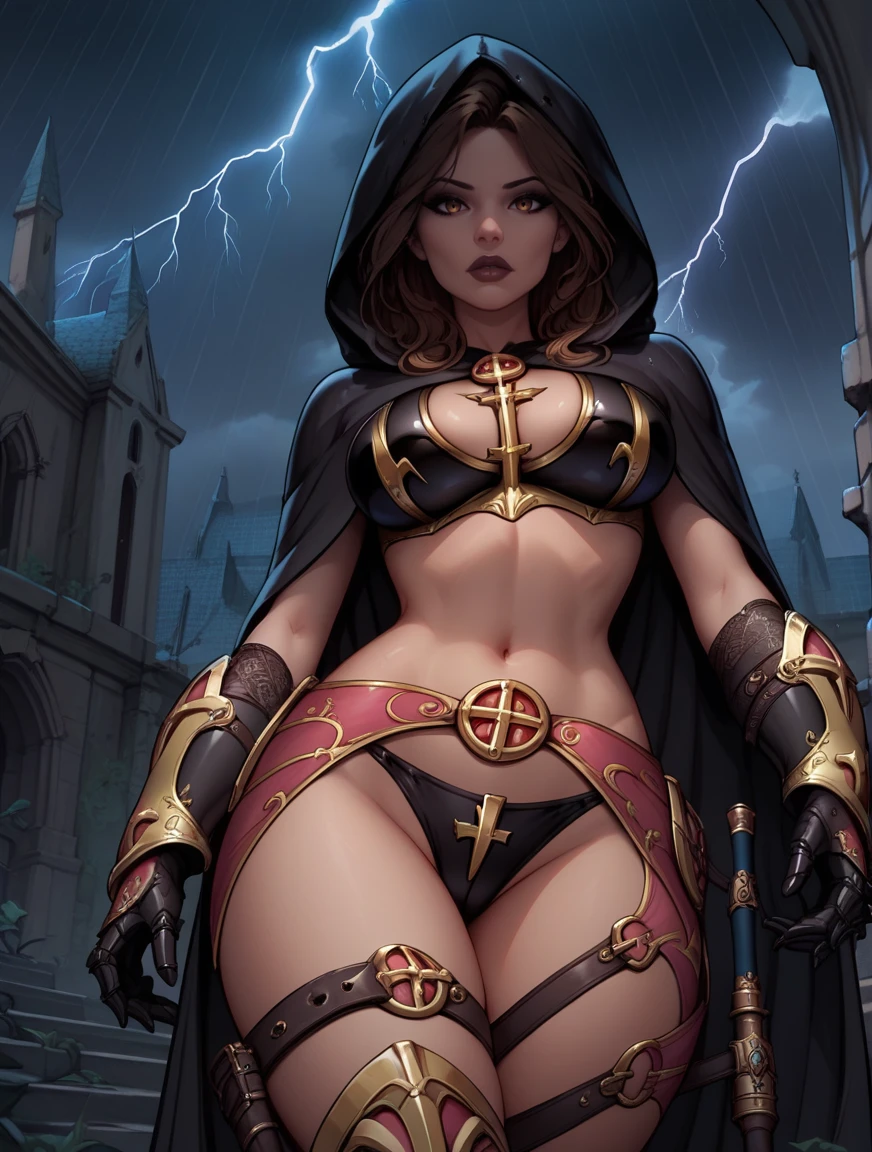 cloak, bikini armor, gauntlets, brown hair, hood, gauntlets, pauldrons, black cape, belt, straps, revealing clothes,