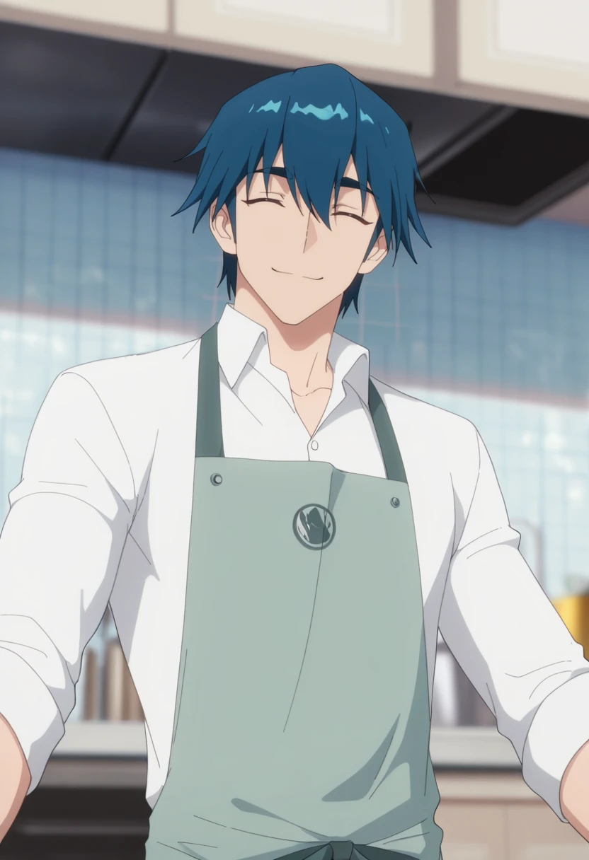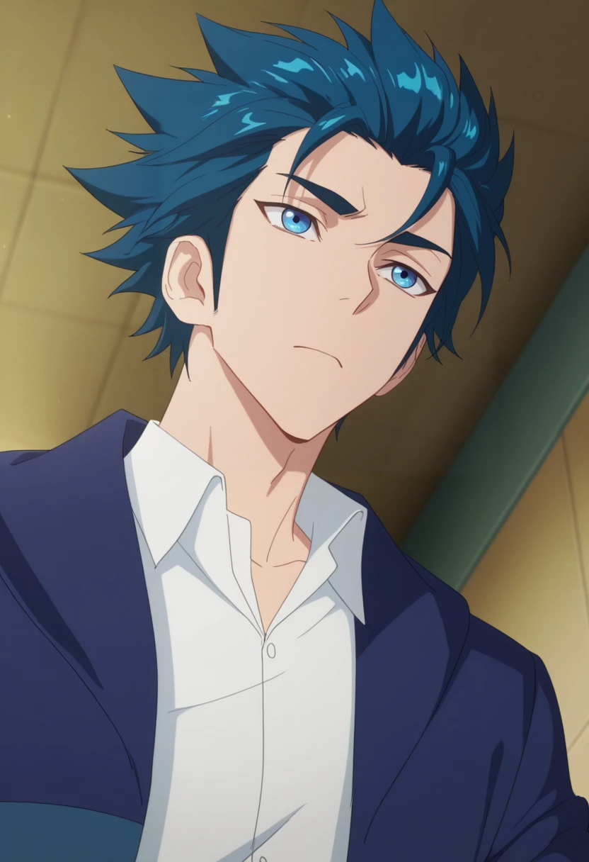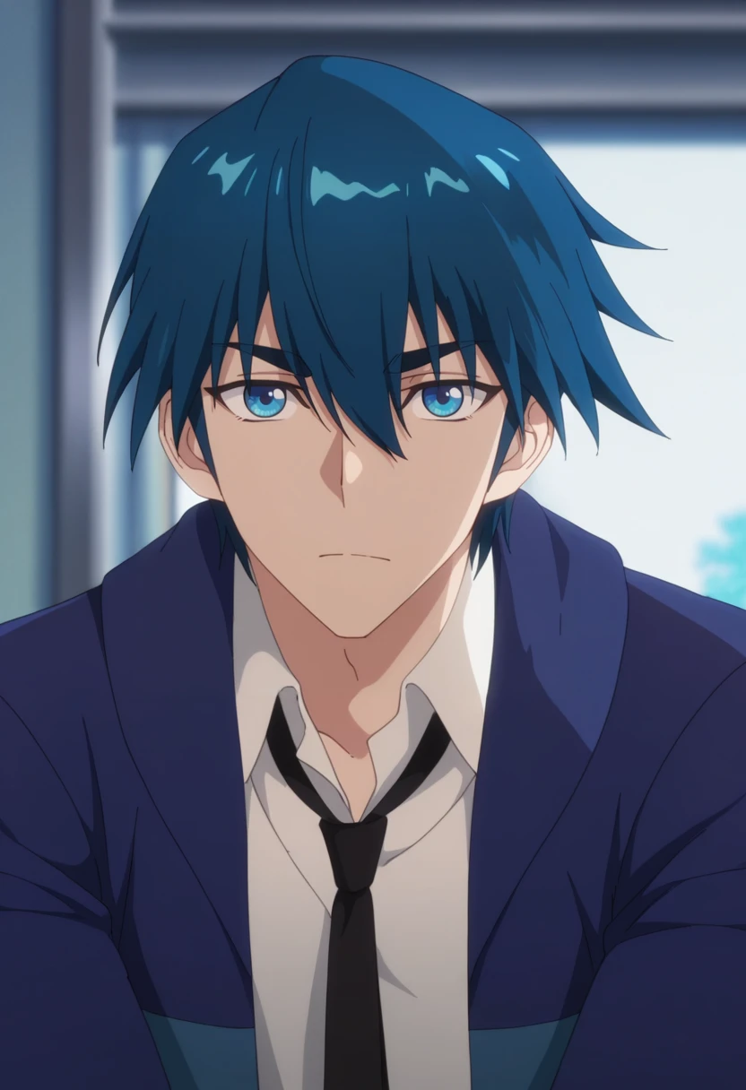ah jie, blue eyes, blue hair, short hair, bangs