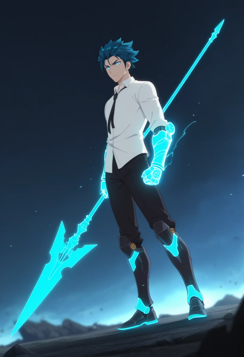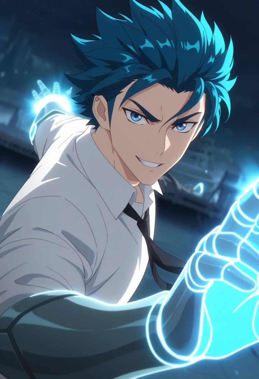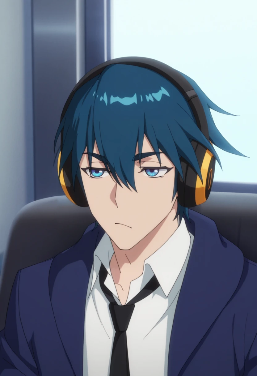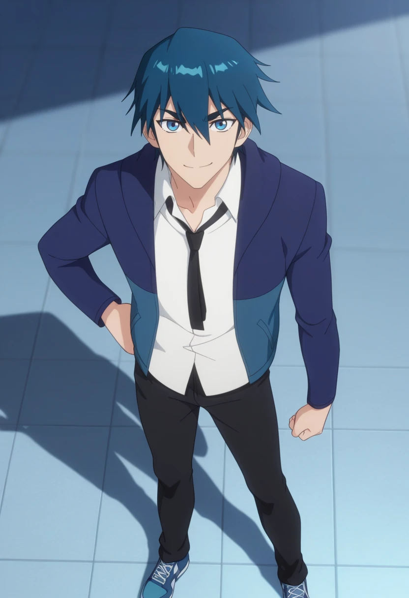 ah jie, blue eyes, blue hair, short hair, bangs