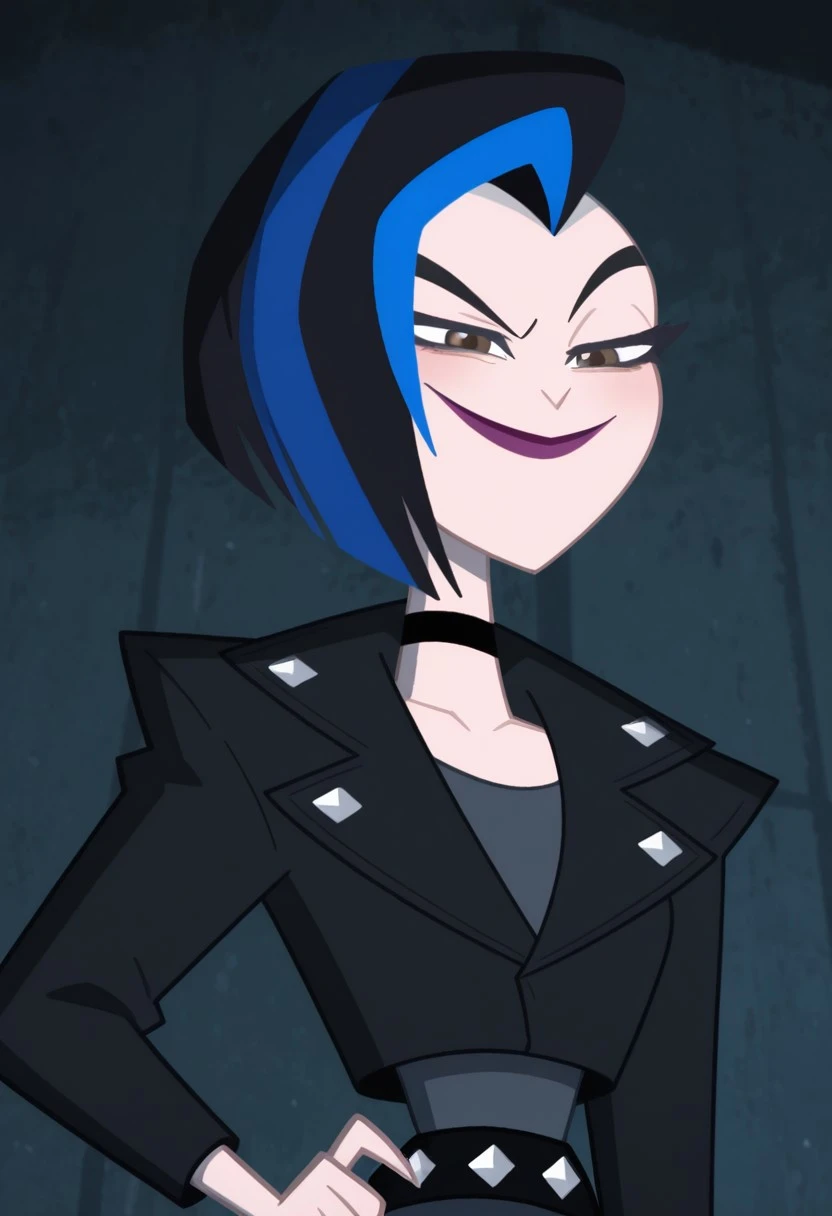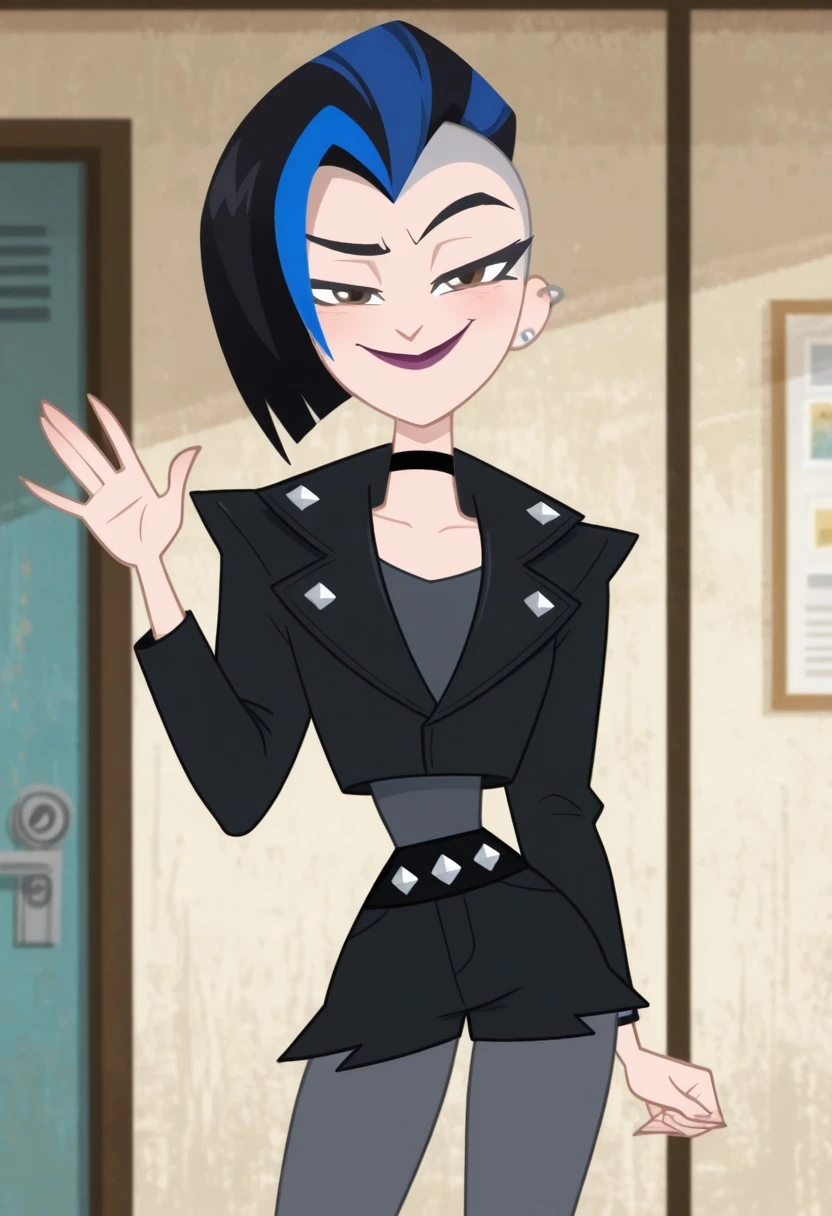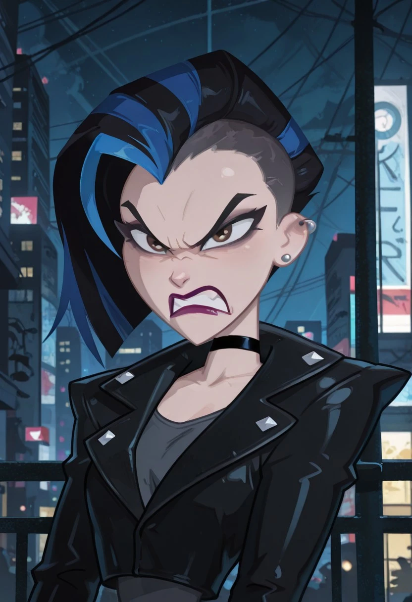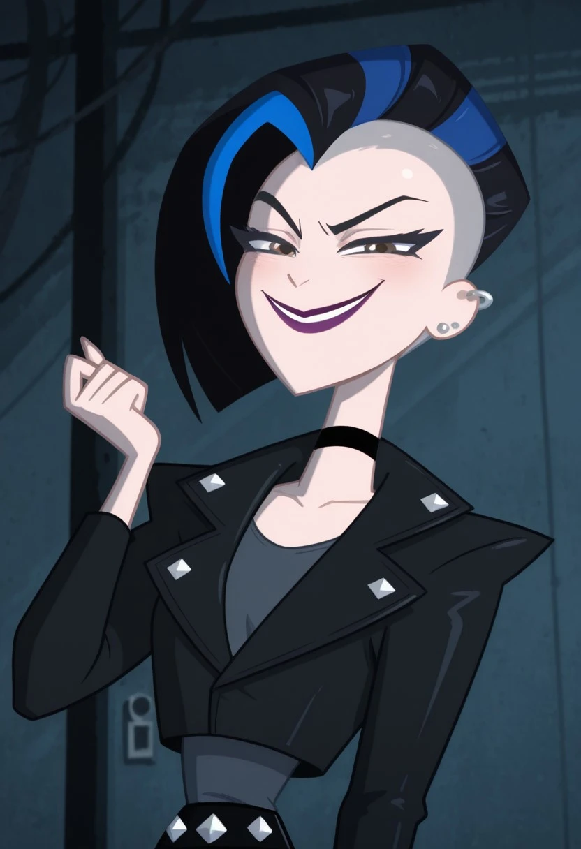 LeslieWillisdc,1girl, mohawk, black hair,chin-length black hair with blue streaks, short hair, brown eyes, lipstick, ear piercing, fair skin