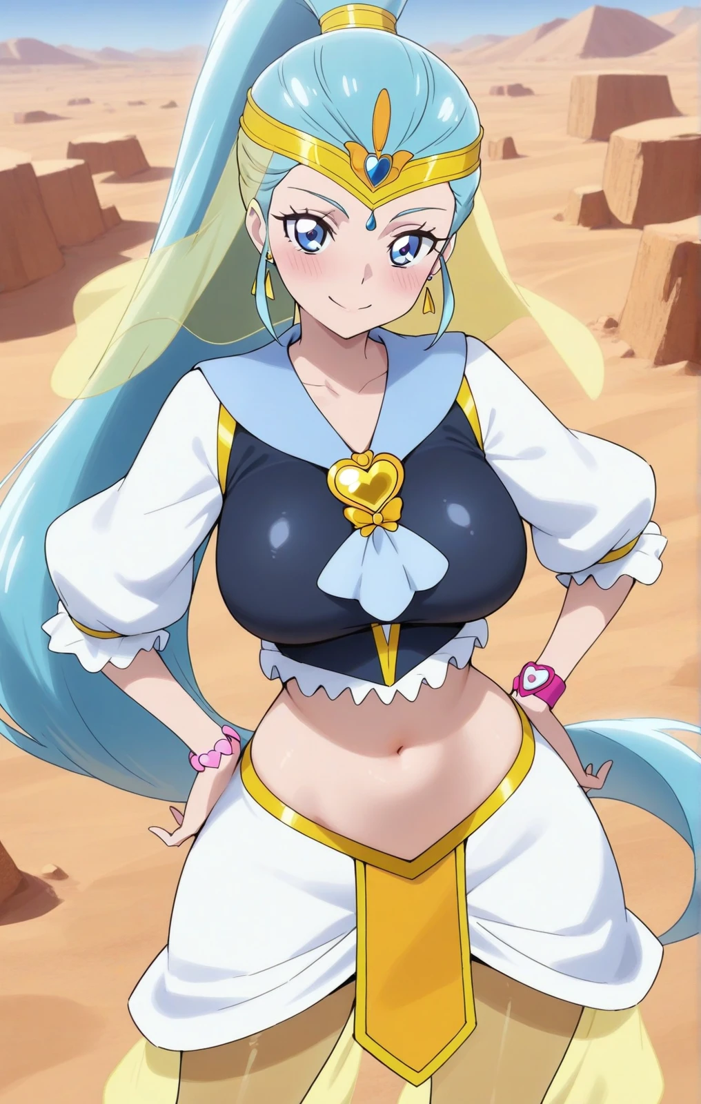 cure nile,light blue hair,very long hair,ponytail,hair slicked back,blue eyes,gold circlet,see-through veil,yellow veil,blu jewel,gold earrings,cure nile cos,black shirts,cropped shirts,midriff,navel,white sleeves,puffy sleeves,sleeves past elbows,light blue sailor collar,gold heart chest ornament,light blue chest ribbon,pink heart bracelet,white skirt,yellow pelvic curtain,arabian pants under skirt,see-thorough arabian pants,yellow arabian pants,gold high heels