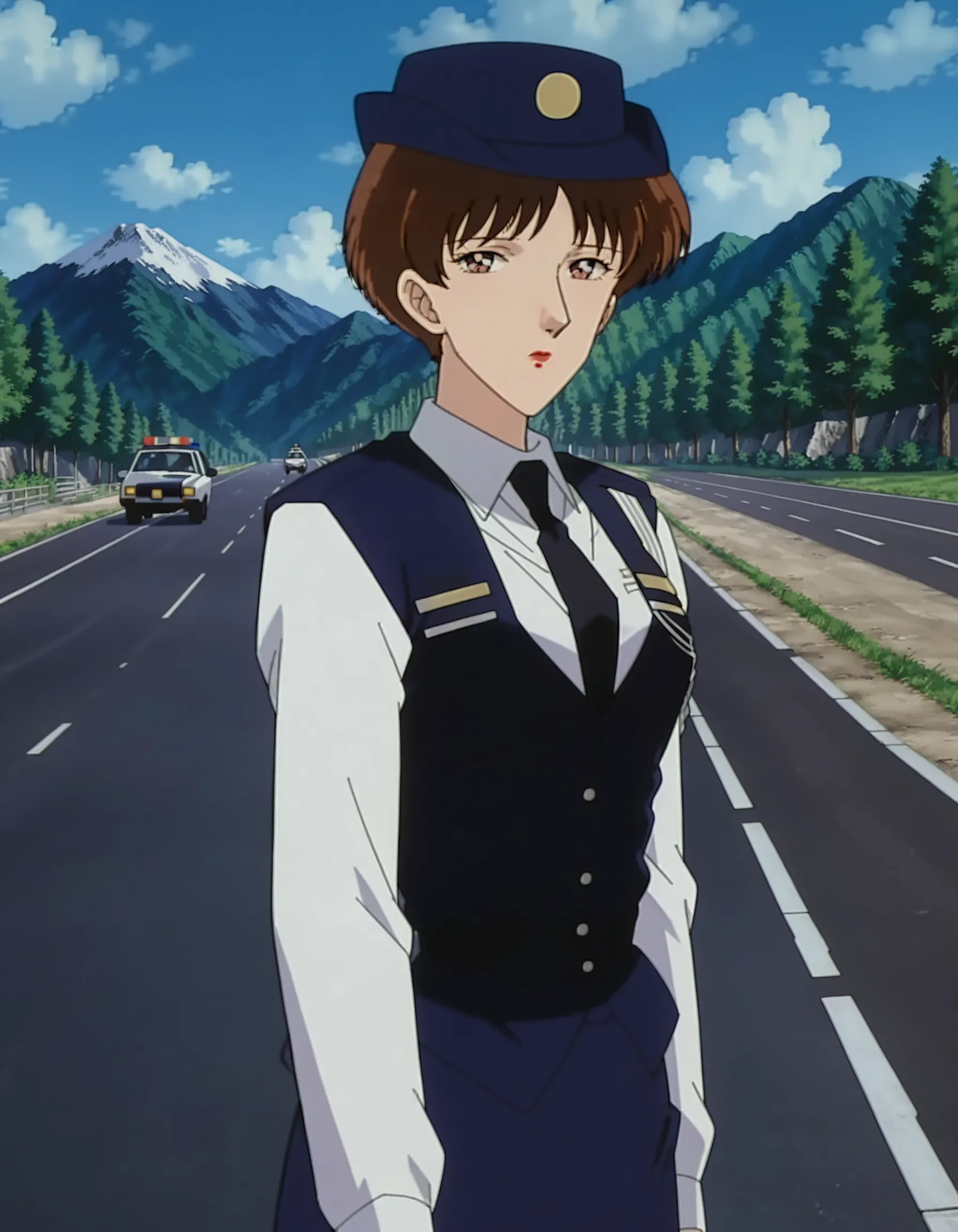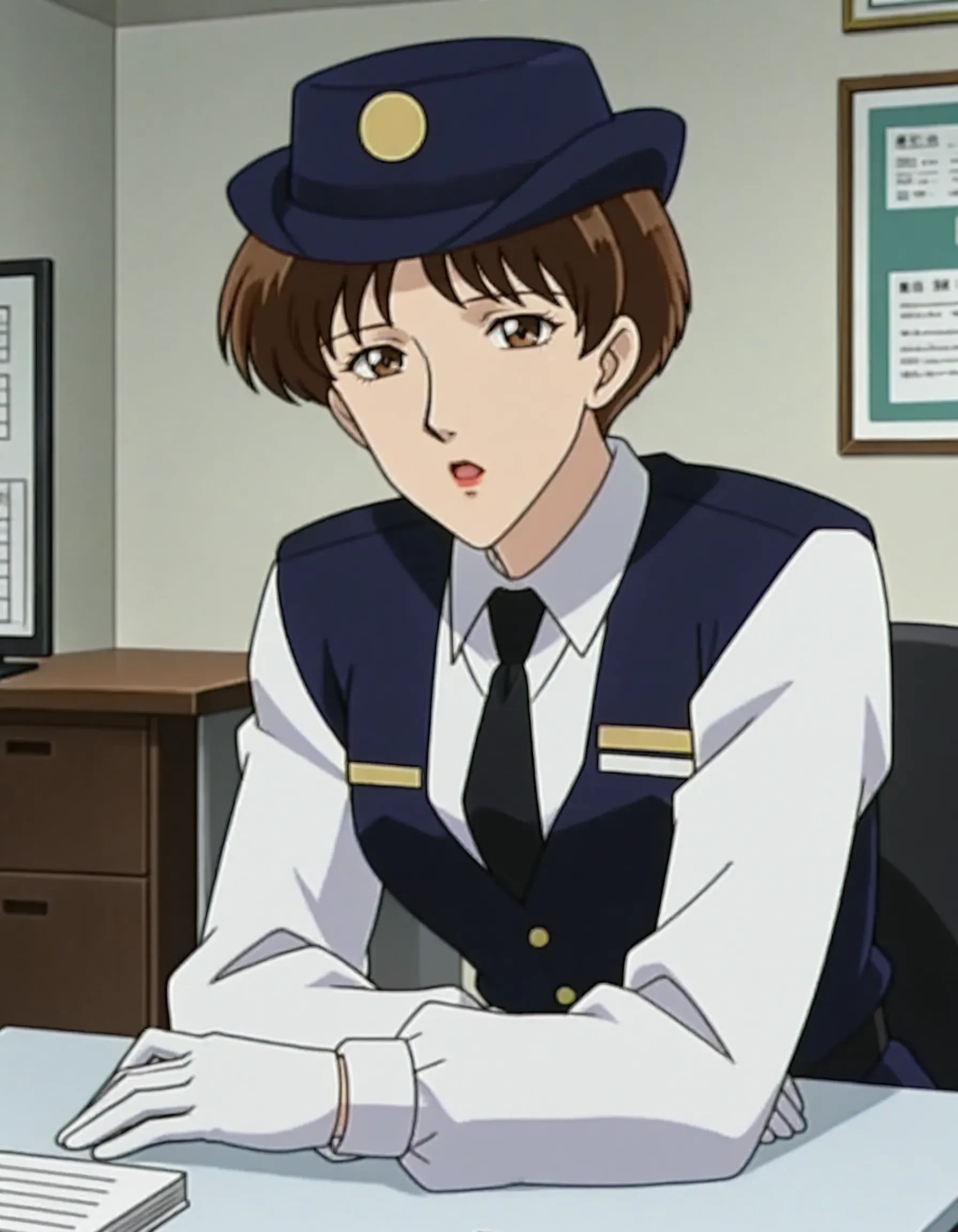 brown hair,very short hair,red lipstick,police hat,dark blue vest,white collared shirt,long sleeves,black necktie,dark blue long skirt,policewoman,