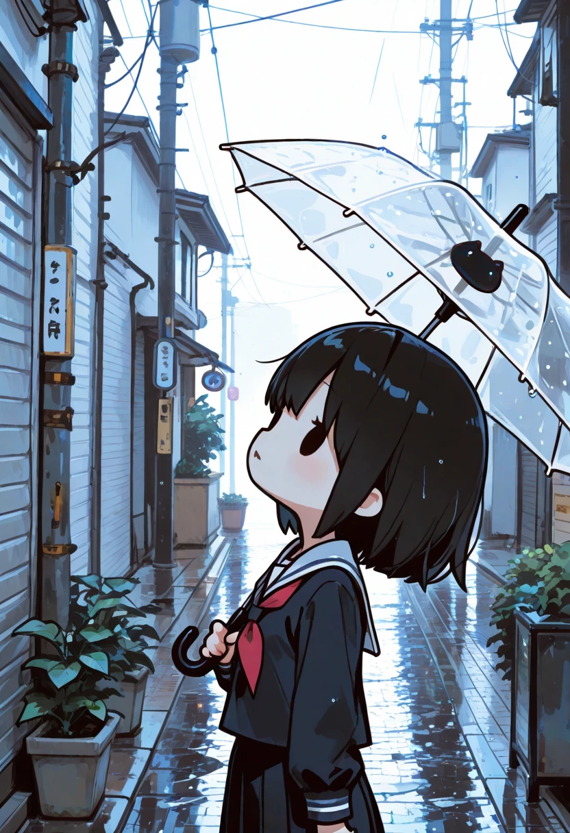 1girl, renwser, chibi, solid oval eyes, black hair, swept bangs, short hair,
