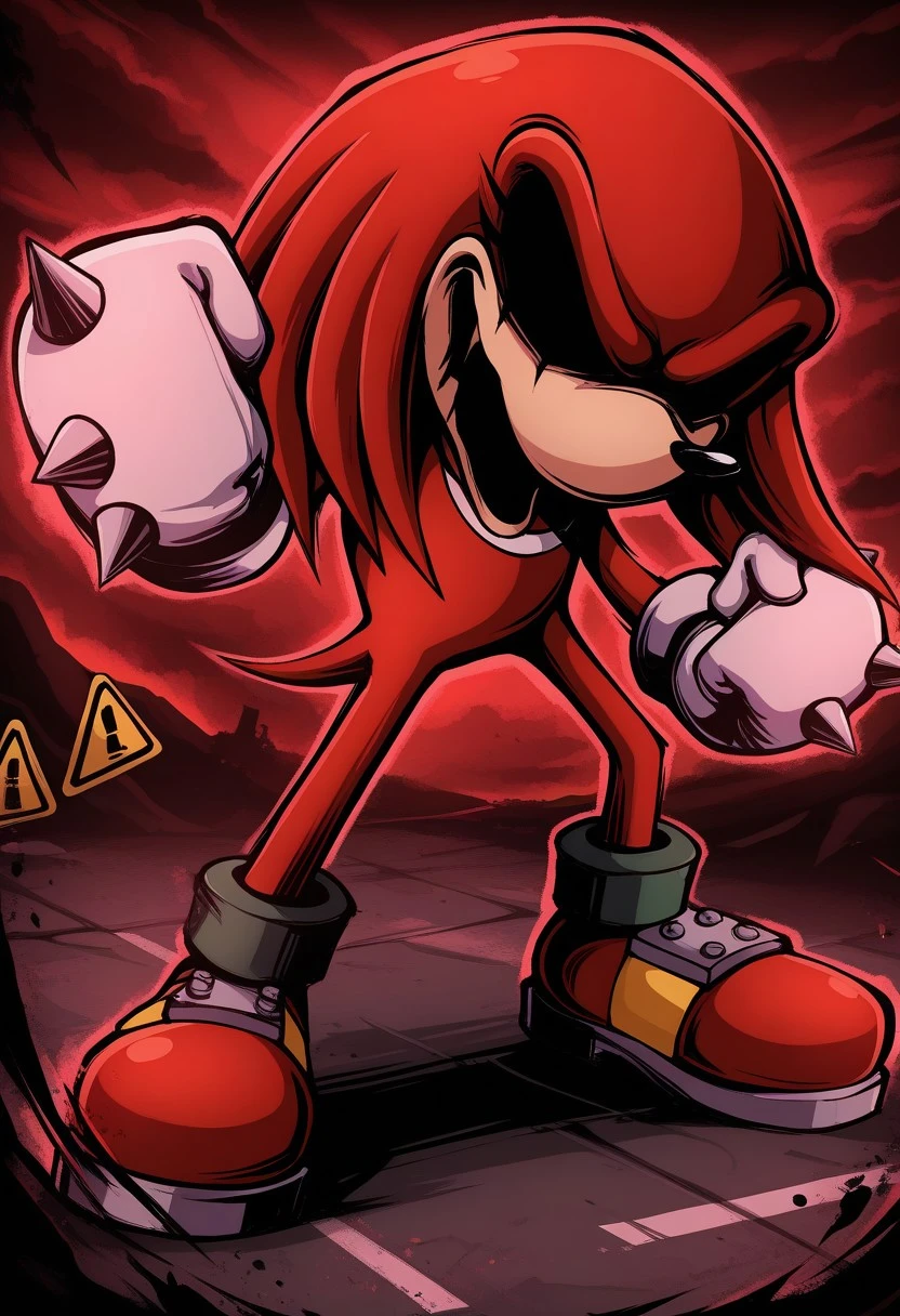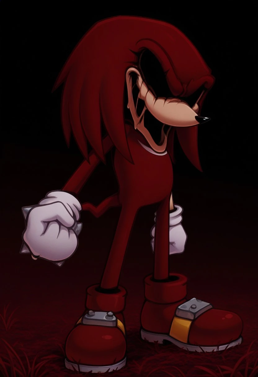 Soul Knuckles, echidna, dark red fur, hollow eyes, empty eye sockets, black nose, melted jaw, missing left arm, white glove, dark red shoes
