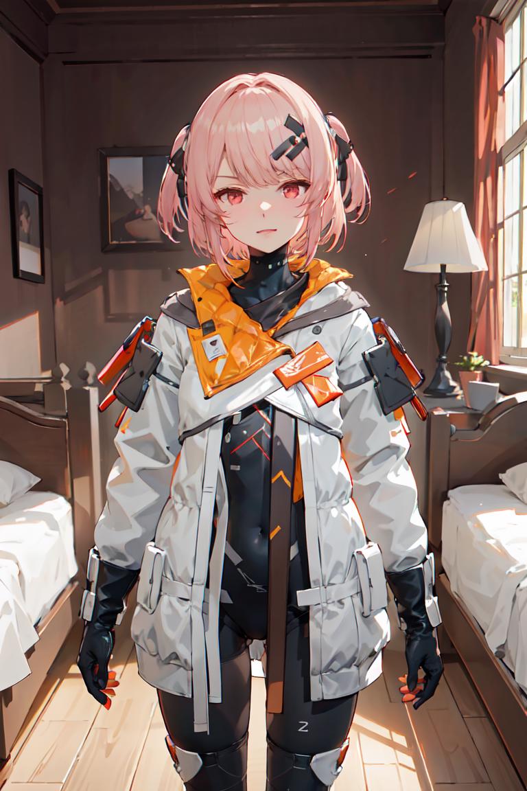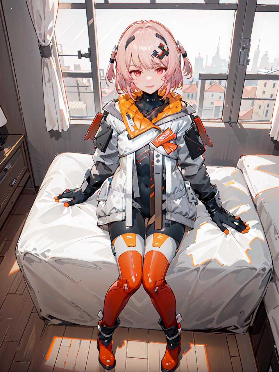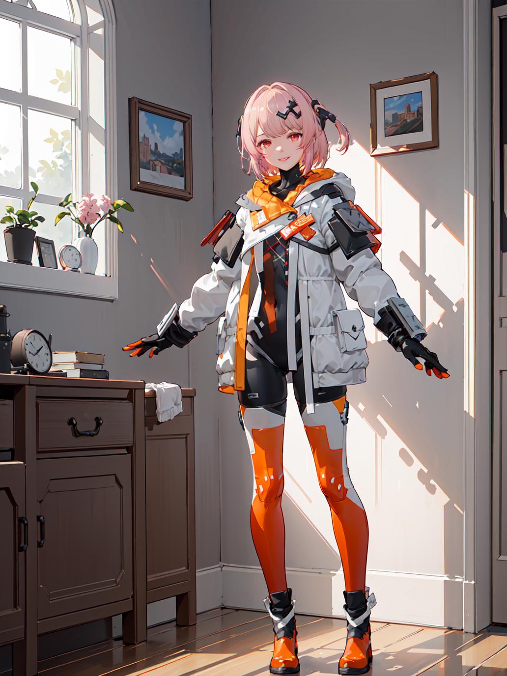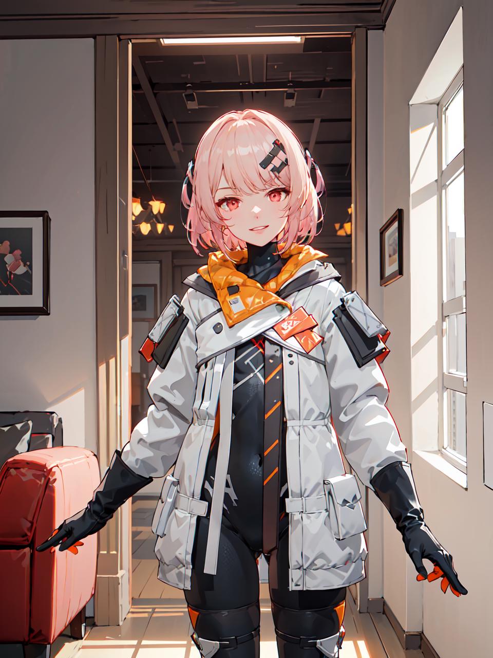 futiyaCB, white_jacket, bodysuit, gloves, boots, badge, hair_ornament, pink_hair, short_hair, red_eyes, 1girl