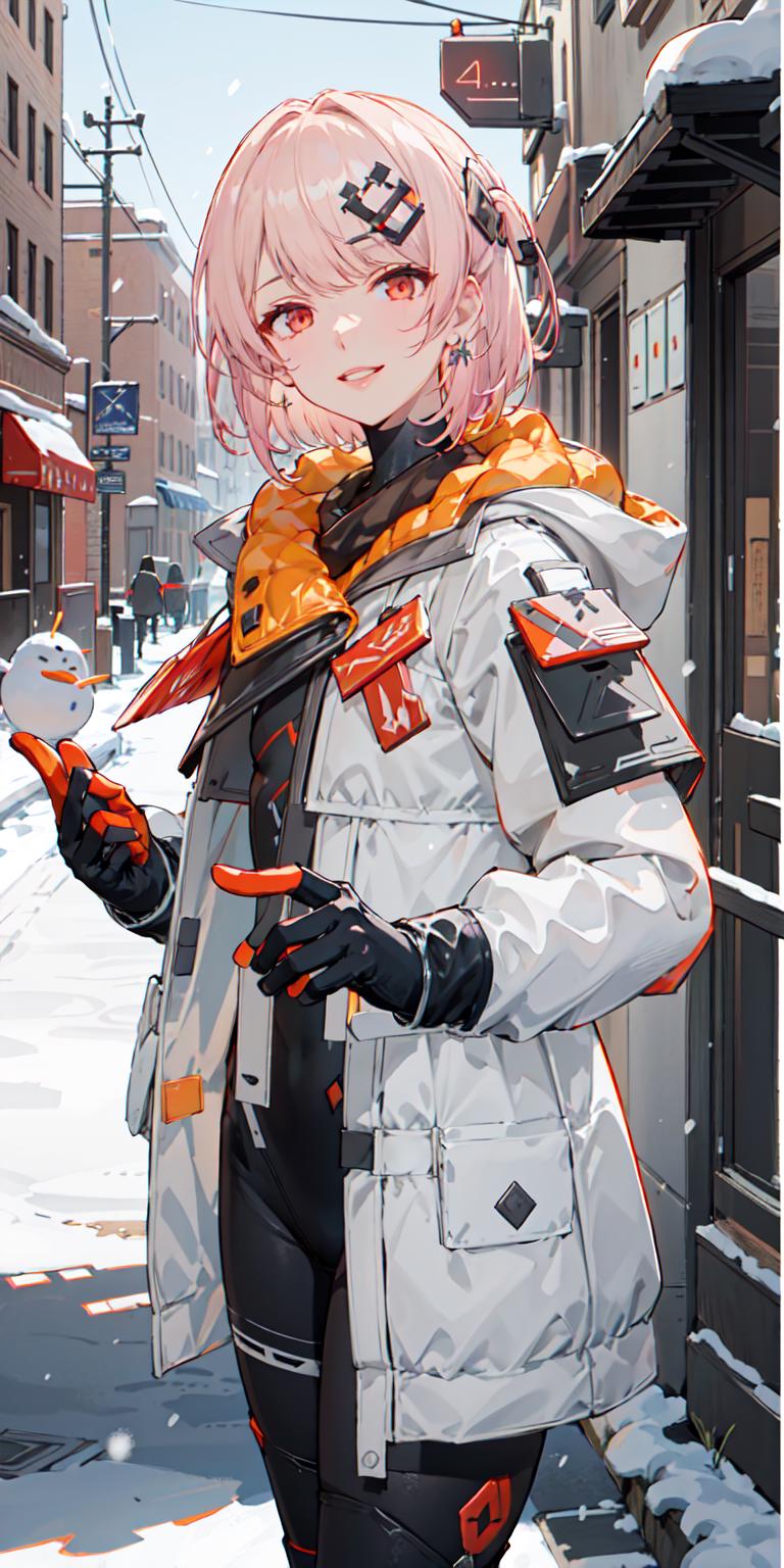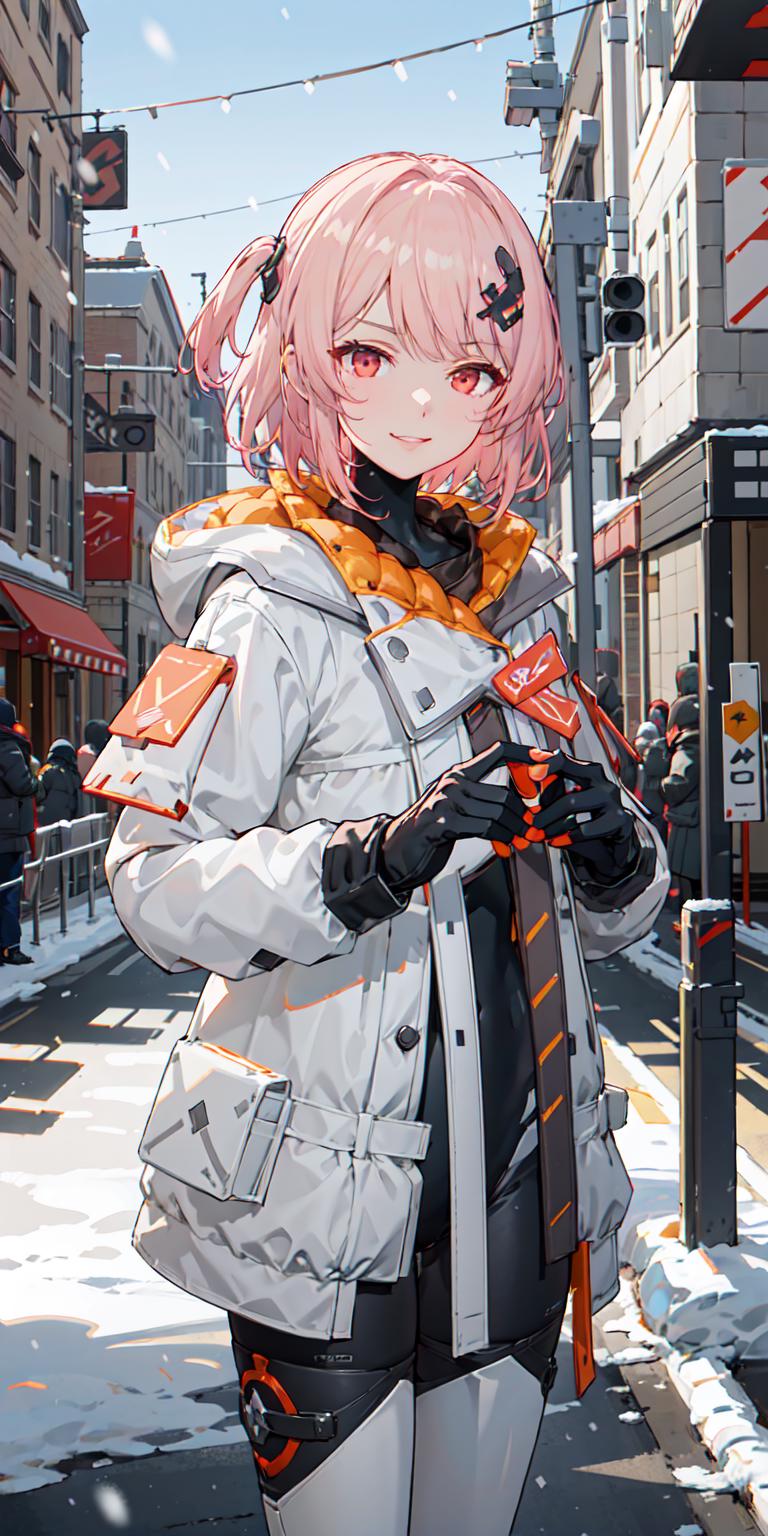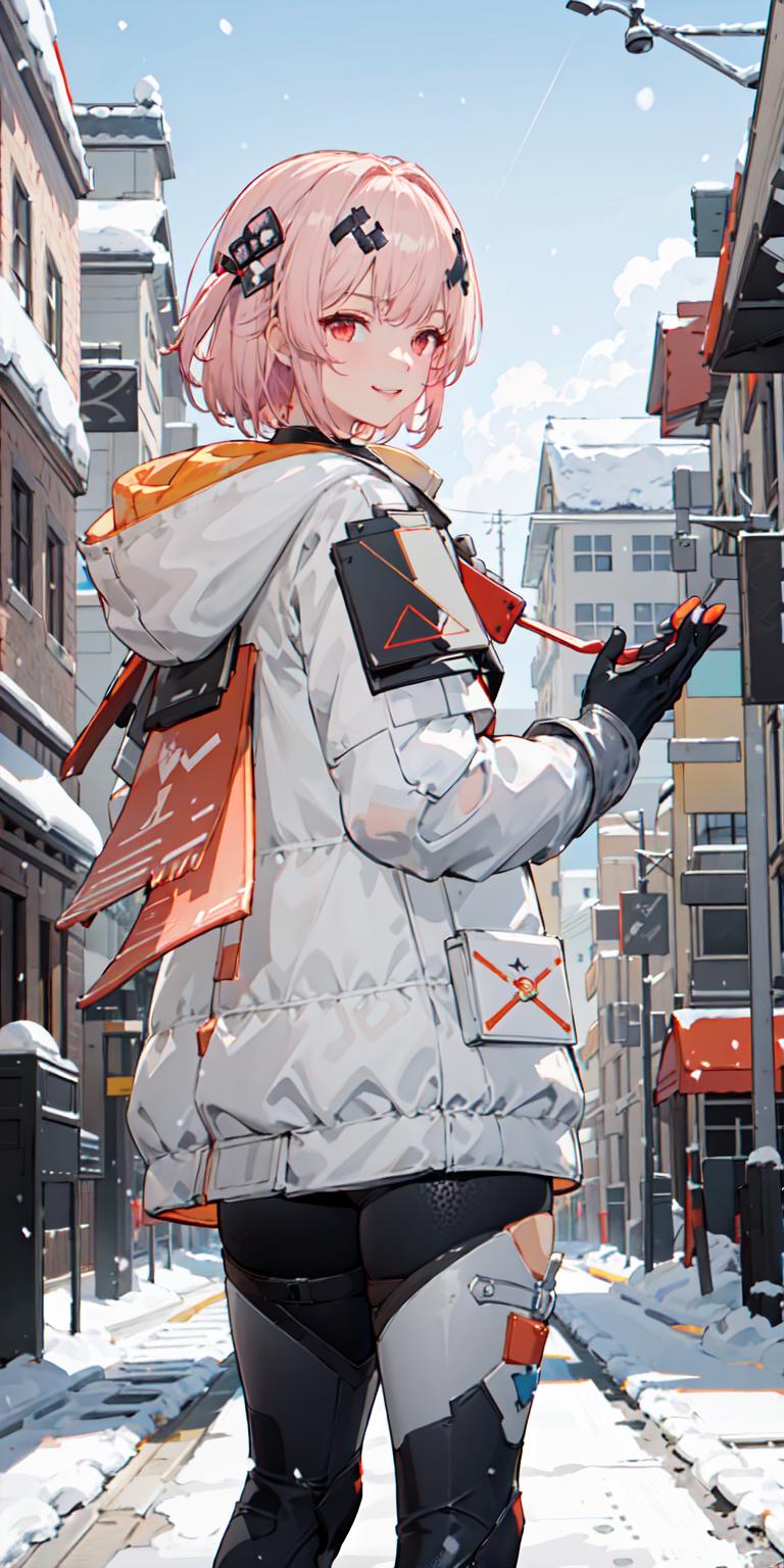 【正面提示词Positive prompt】:futiyaCB, white_jacket, bodysuit, gloves, boots, badge, hair_ornament, pink_hair, short_hair, red_eyes, 1girl, cowboy shot, looking at viewer, light smile, solo, day, dappled sunlight, outdoors, park, snowing, snow, blue sky, (masterpiece,best quality,beautiful and aesthetic:1.2), <lora:FUTIYA-1129-1-000007:0.7>