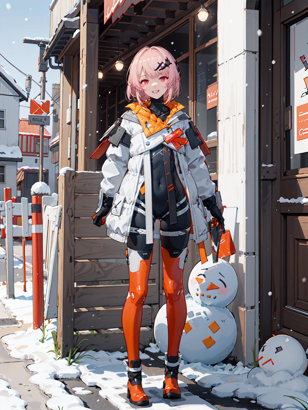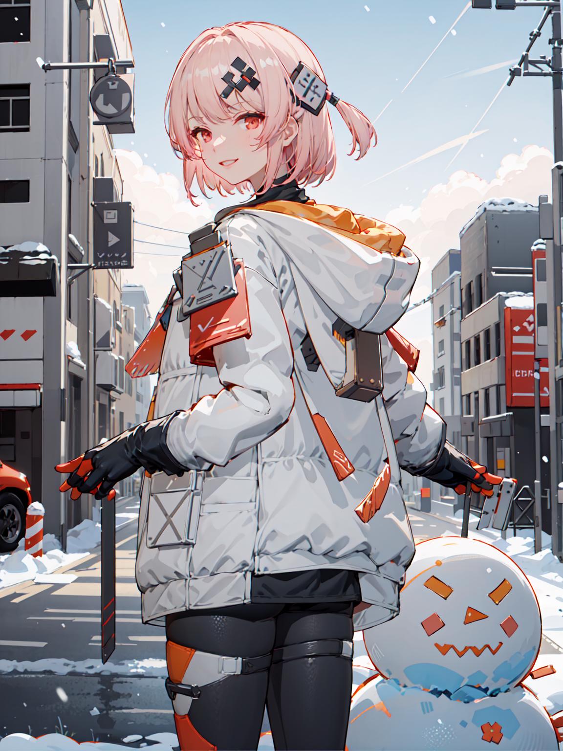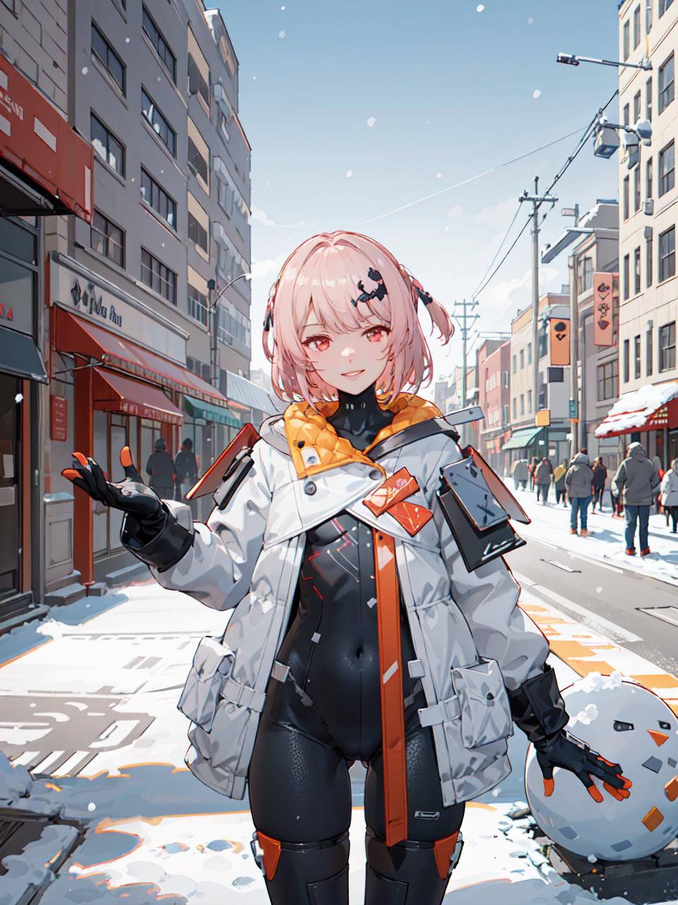 【正面提示词Positive prompt】:futiyaCB, white_jacket, bodysuit, gloves, boots, badge, hair_ornament, pink_hair, short_hair, red_eyes, 1girl, cowboy shot, looking at viewer, light smile, solo, day, dappled sunlight, outdoors, park, snowing, snow, blue sky, (masterpiece,best quality,beautiful and aesthetic:1.2), <lora:FUTIYA-1129-1-000007:0.7>