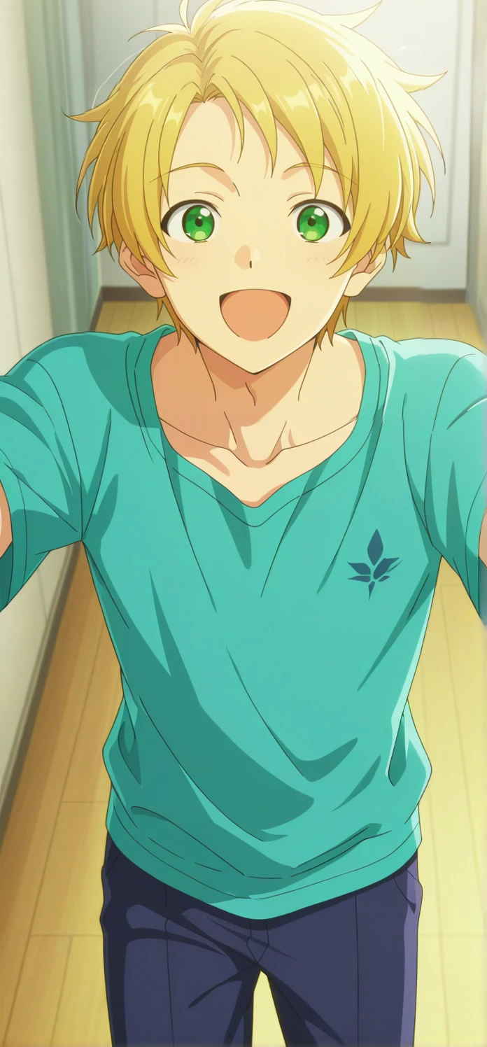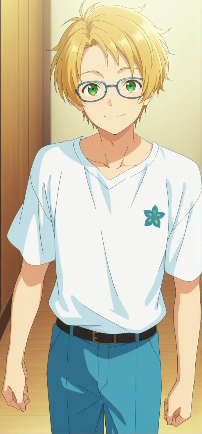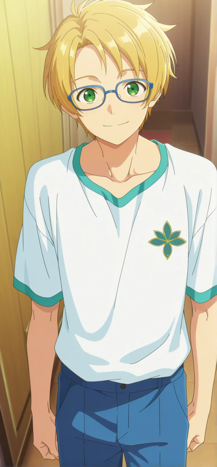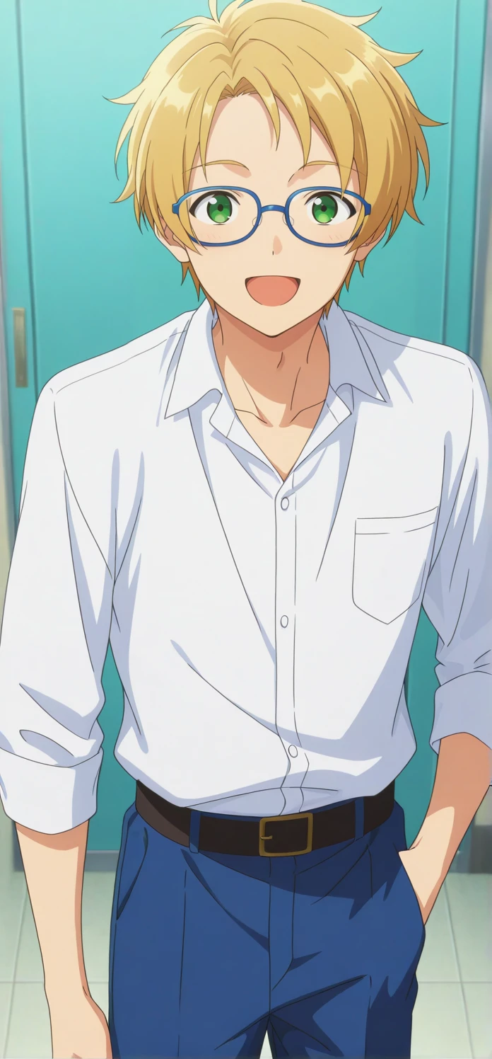 makoto yuki,blonde hair,short hair,green eyes,glasses,blue-framed eyewear