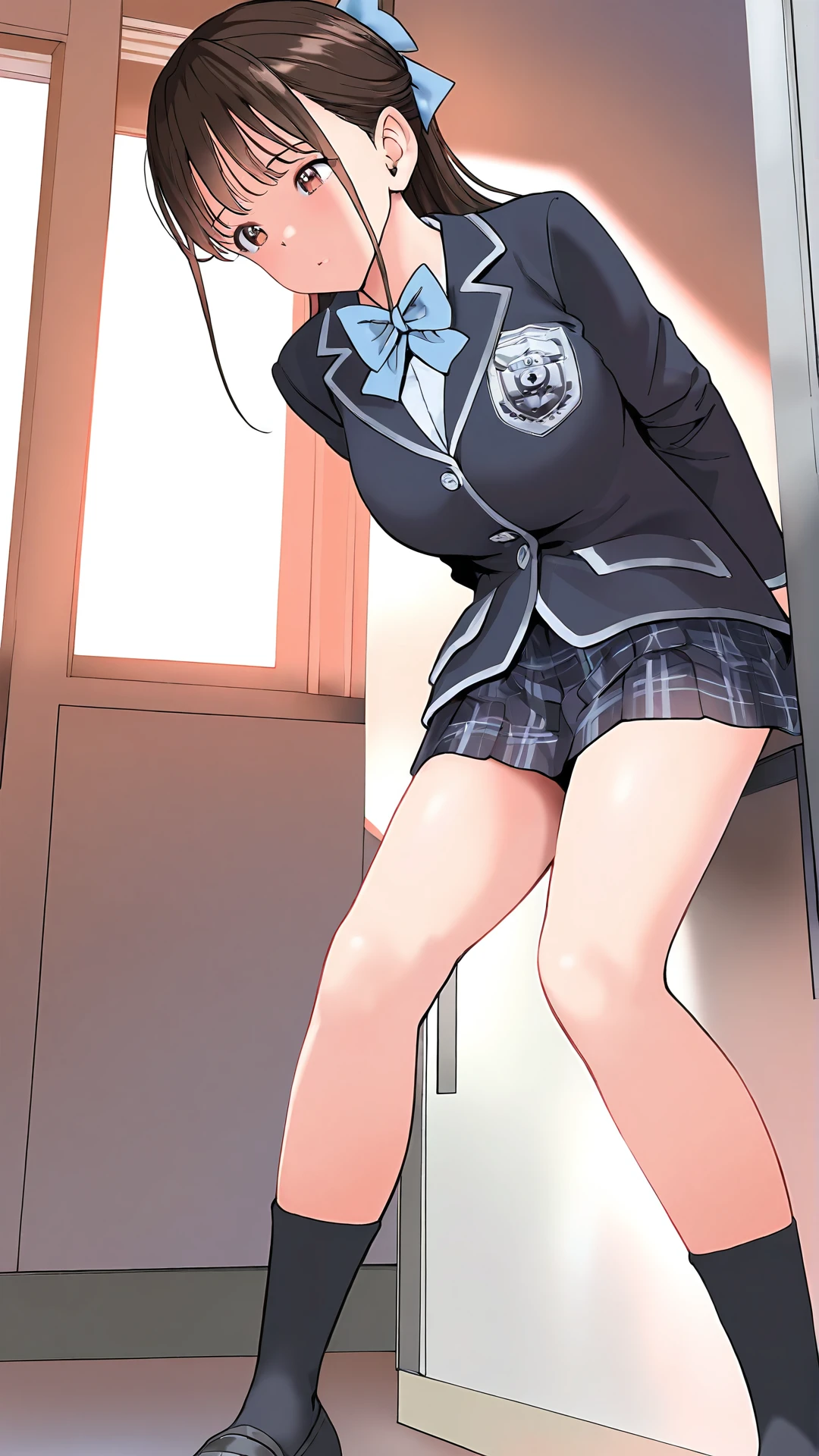 Shiokawa Akari,1girl,solo,school uniform,brown hair,skirt,long hair,brown eyes,jacket,blazer,socks,bow,plaid skirt,blue bow,pleated skirt,