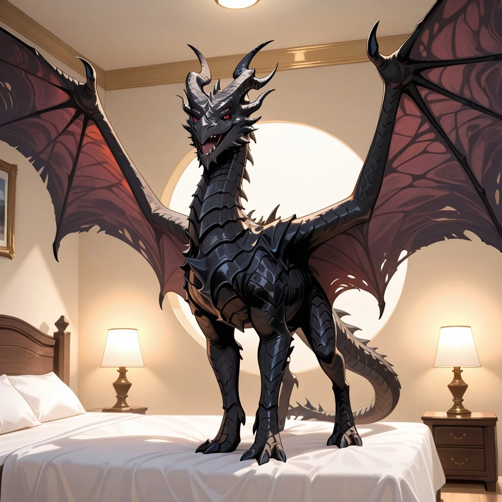 Additional prompts: dragon, black scales, wings, horns, tail, male, 1boy, red sclera, red eyes, claws