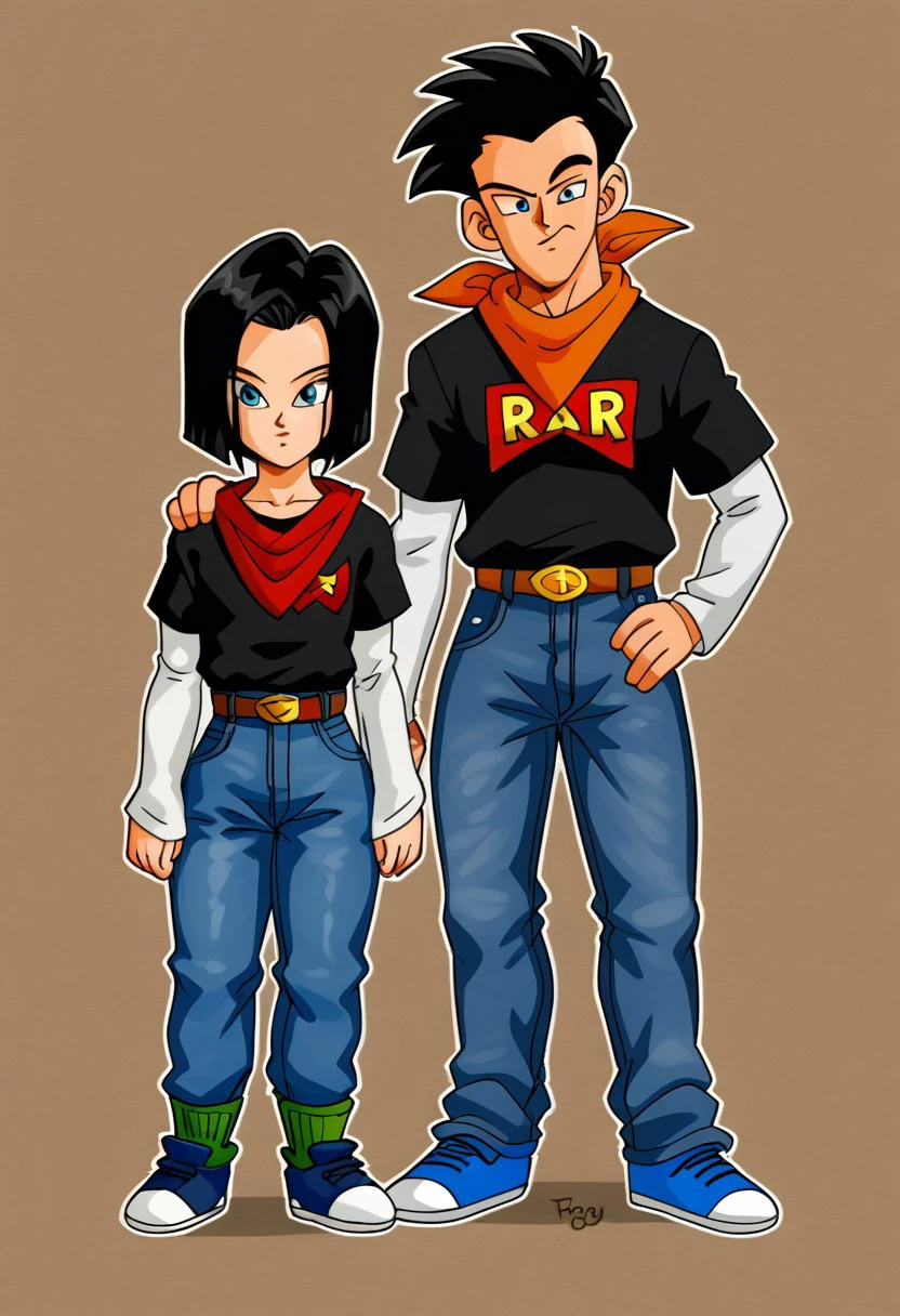 android 17, blue eyes, black hair,parted hair,short hair, black shirt, jeans, layered shirt, white sleeves,orange bandana, blue sneakers, green socks, brown belt, red patch