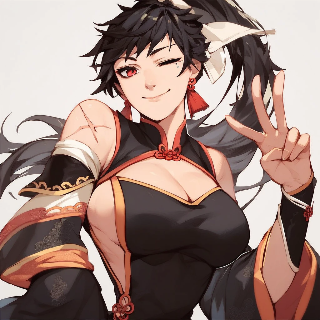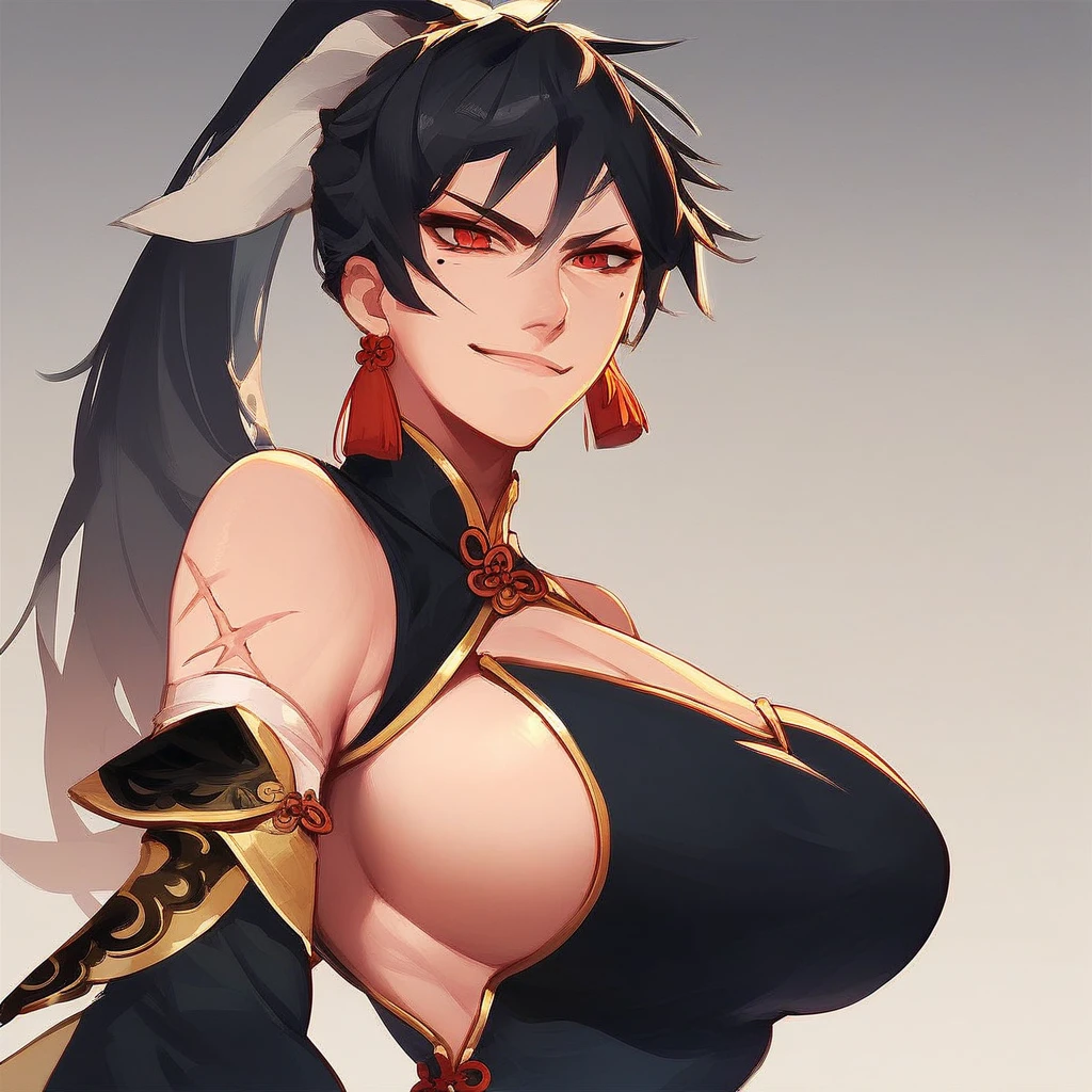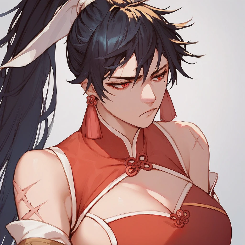 chunyanep, long hair, red eyes, mole under eye, ponytail, scar on arm, black hair,