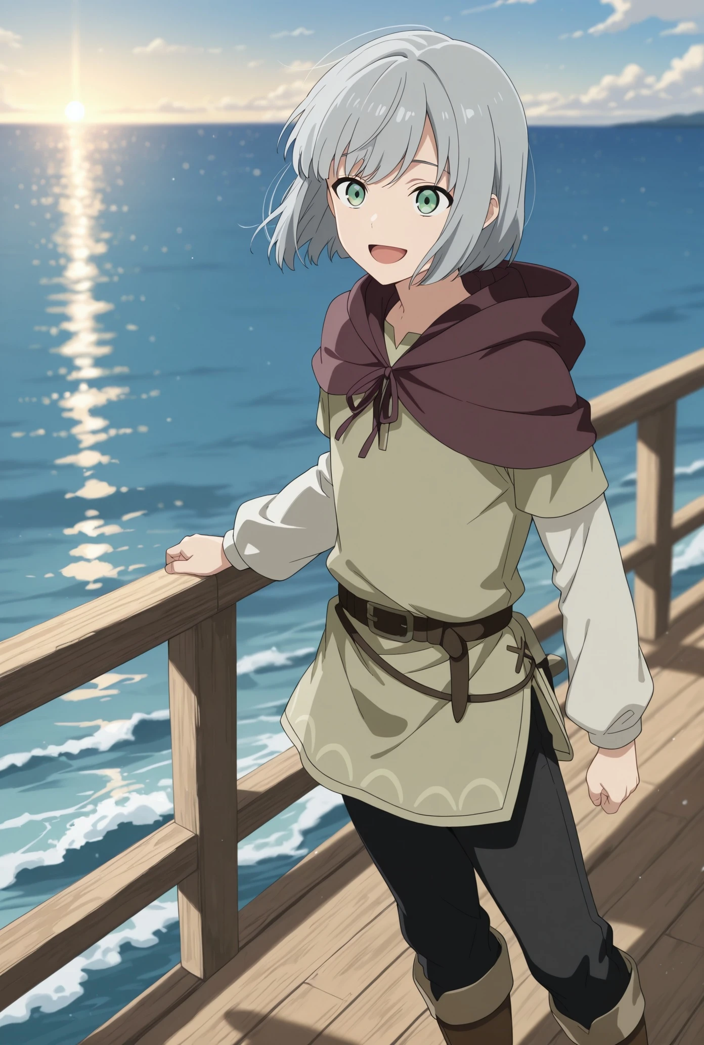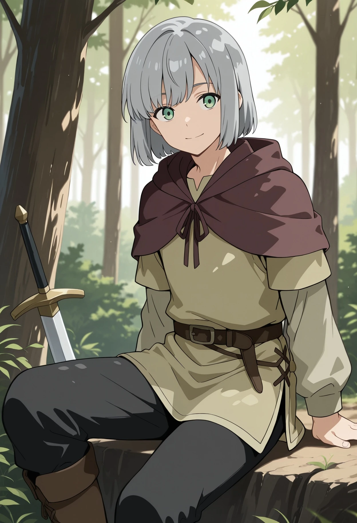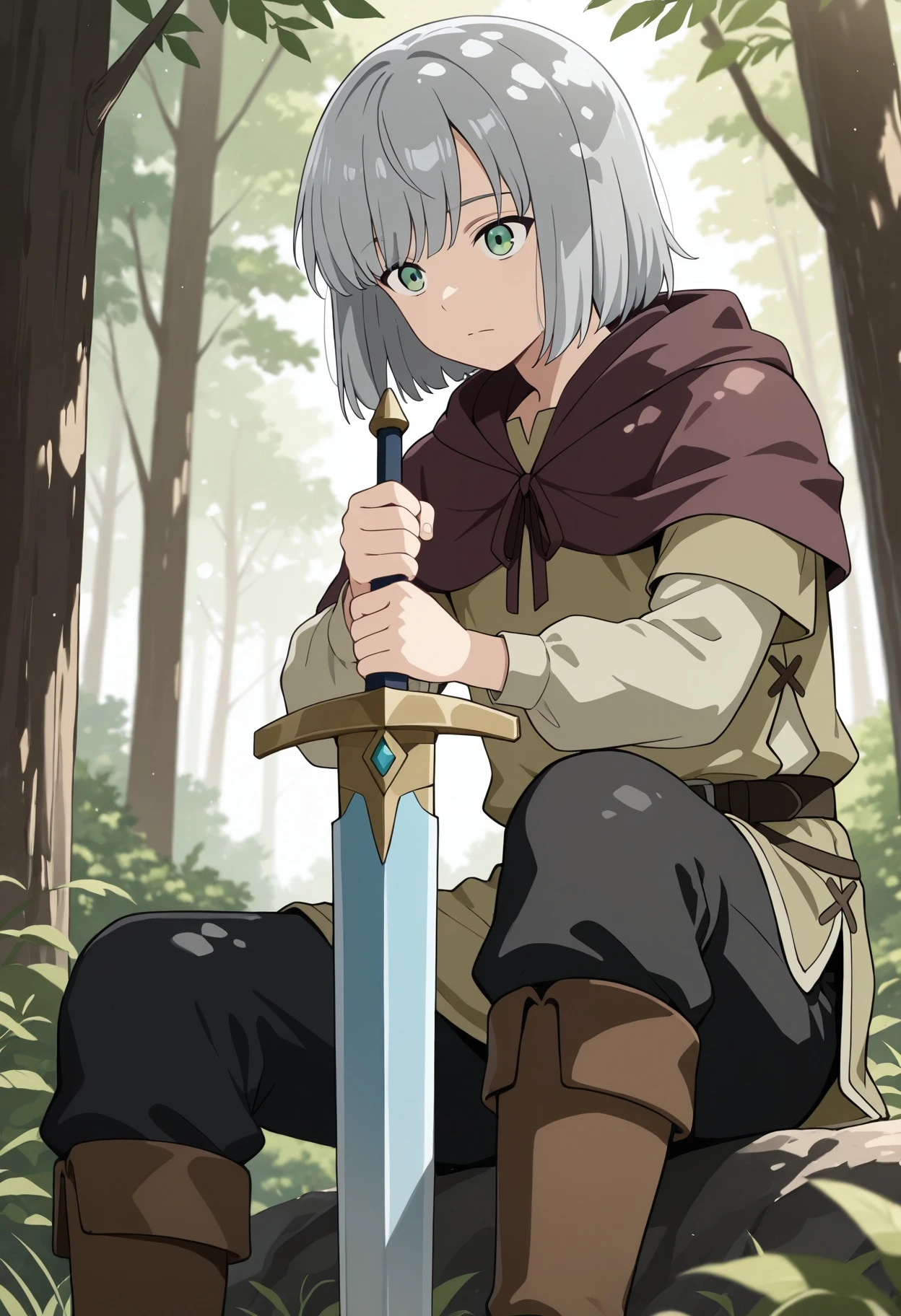 white sleeves,brown caplet,short slit tunic,olive tunic,belt,black pants,brown boots,sheathed sword,sword,