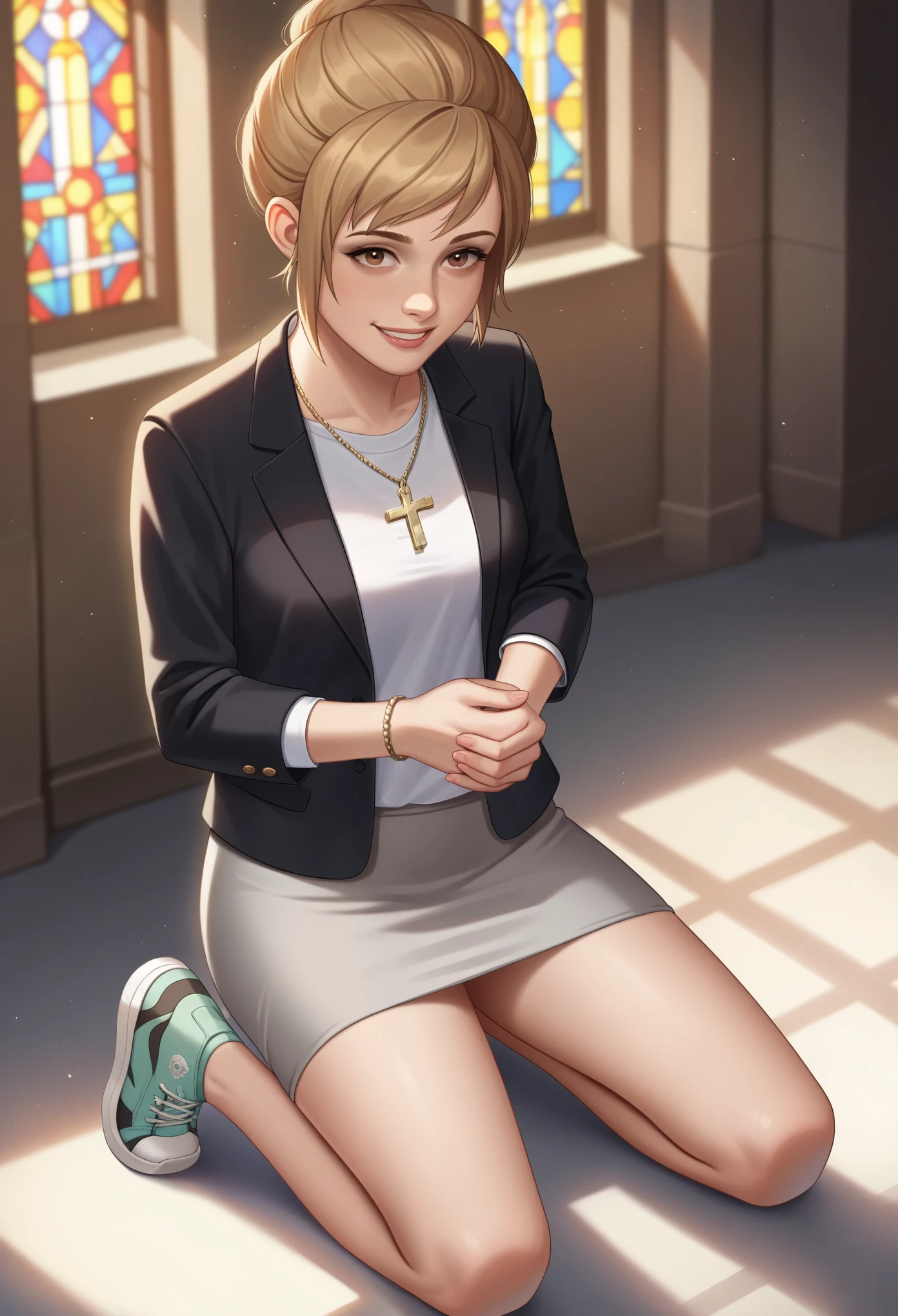 outfit: cross necklace, (dark wool) blazer, blouse, (grey) skirt, (white) sneakers, satchel