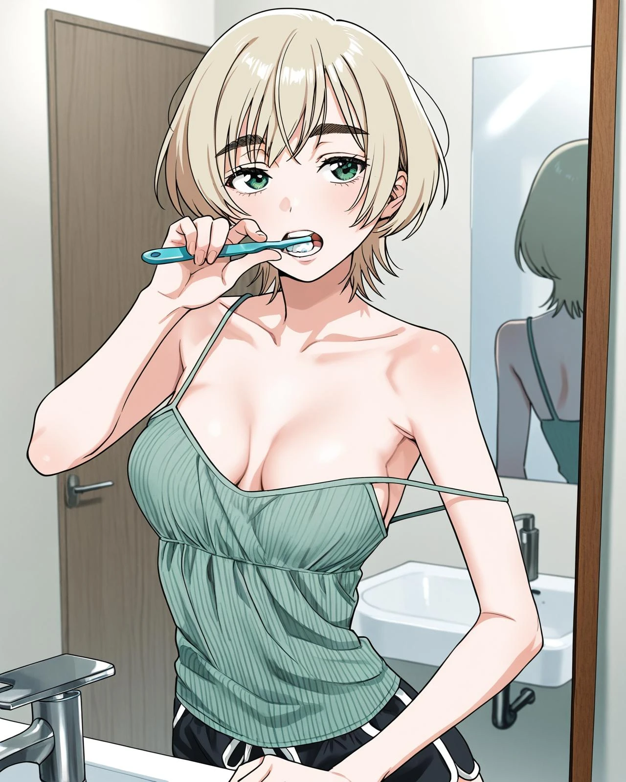 Ekoda Emi (style1) : emi,green eyes,thick eyebrows,ash blonde hair,short hair