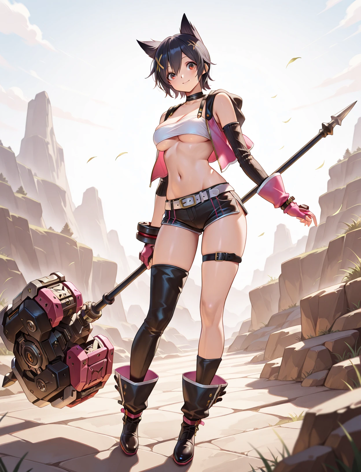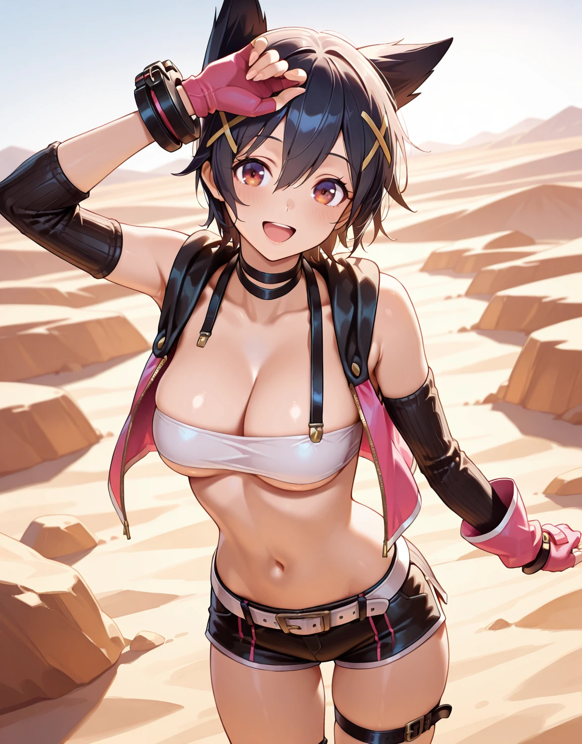 Kouzuki Nana, short hair, choker, bandeau, open vest, arm warmers, fingerless gloves, single bracer, shorts, single thigh strap, asymmetrical legwear,