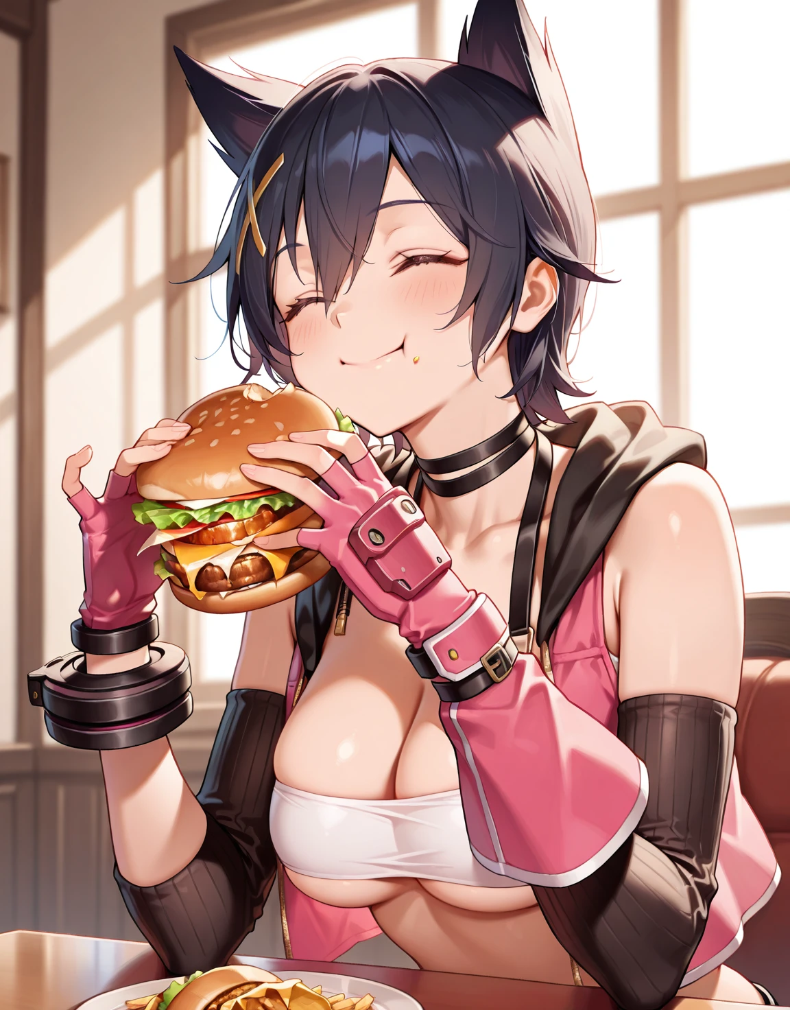 "choker, bandeau, open vest, arm warmers, fingerless gloves, single bracer,