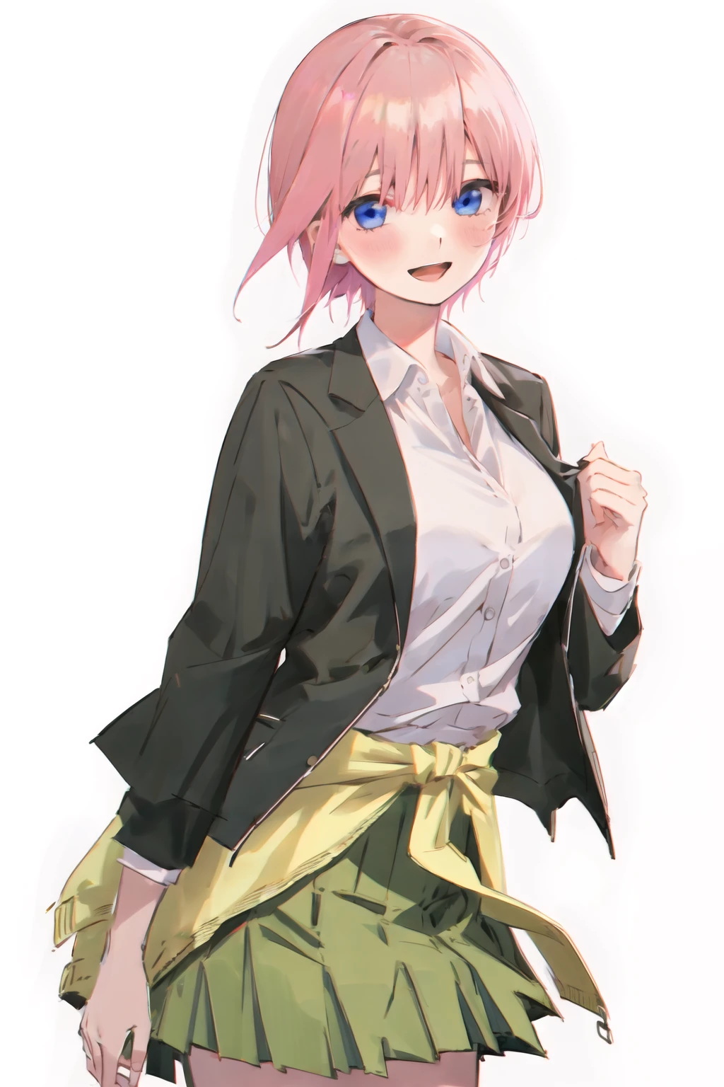 1girl,nakano ichika,short hair,pink hair,solo,bangs,blue eyes,hair between eyes,white shirt,green skirt,school uniform,sweater,cardigan,clothes around waist,black jacket,open jacket,