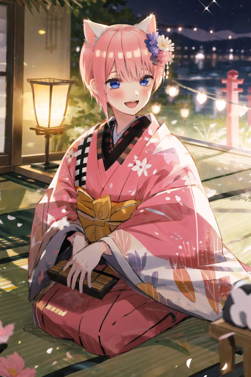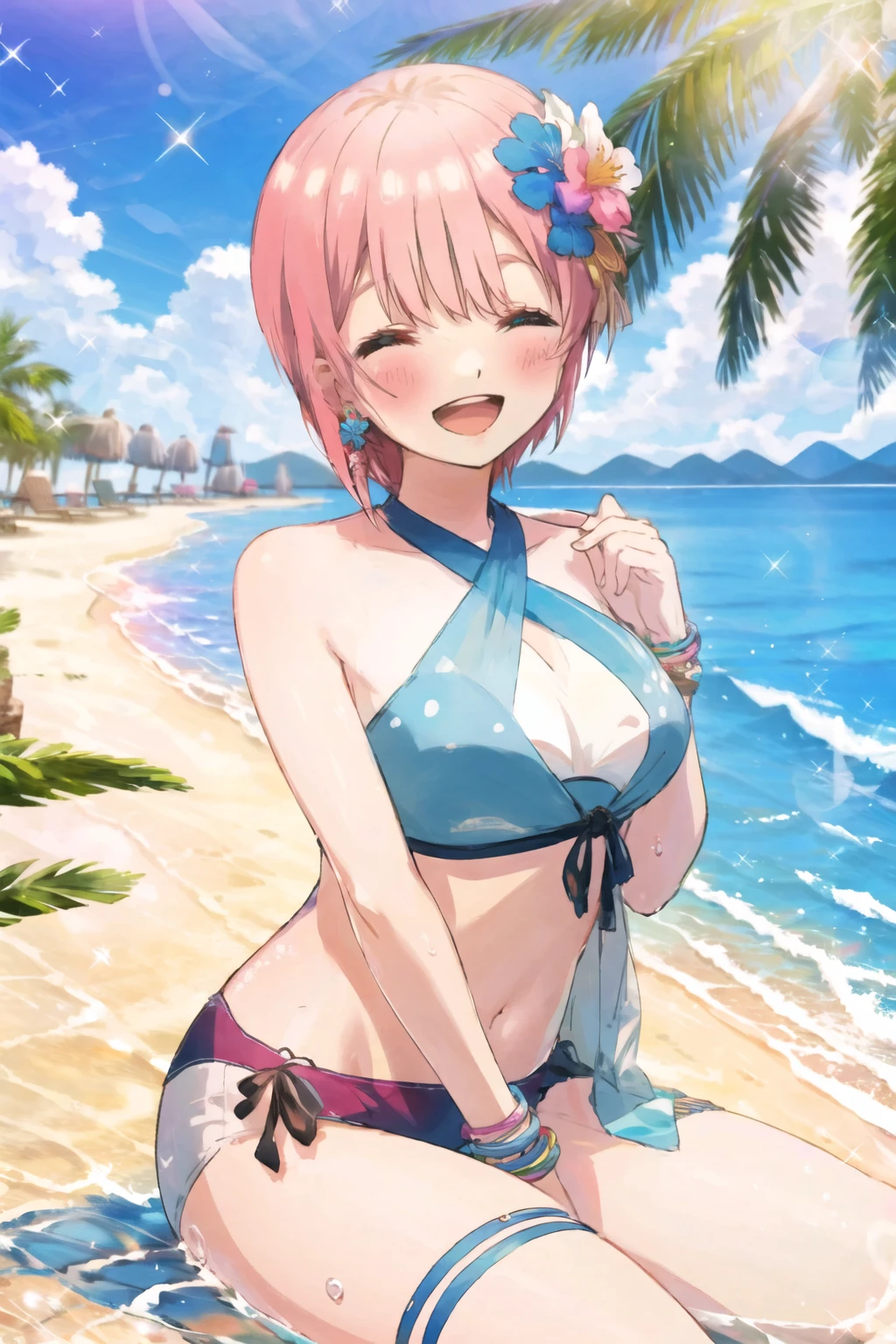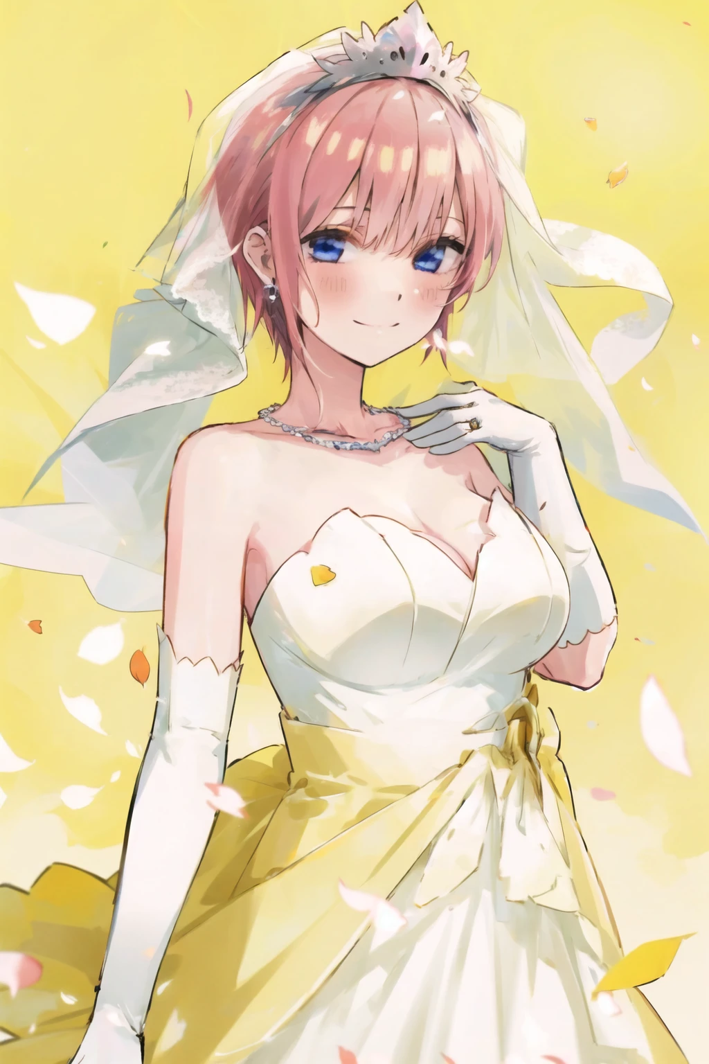 1girl,nakano ichika,short hair,pink hair,solo,bangs,blue eyes,hair between eyes,white dress,bare shoulders,head wreath,wedding dress,white gloves,head wreath,elbow gloves