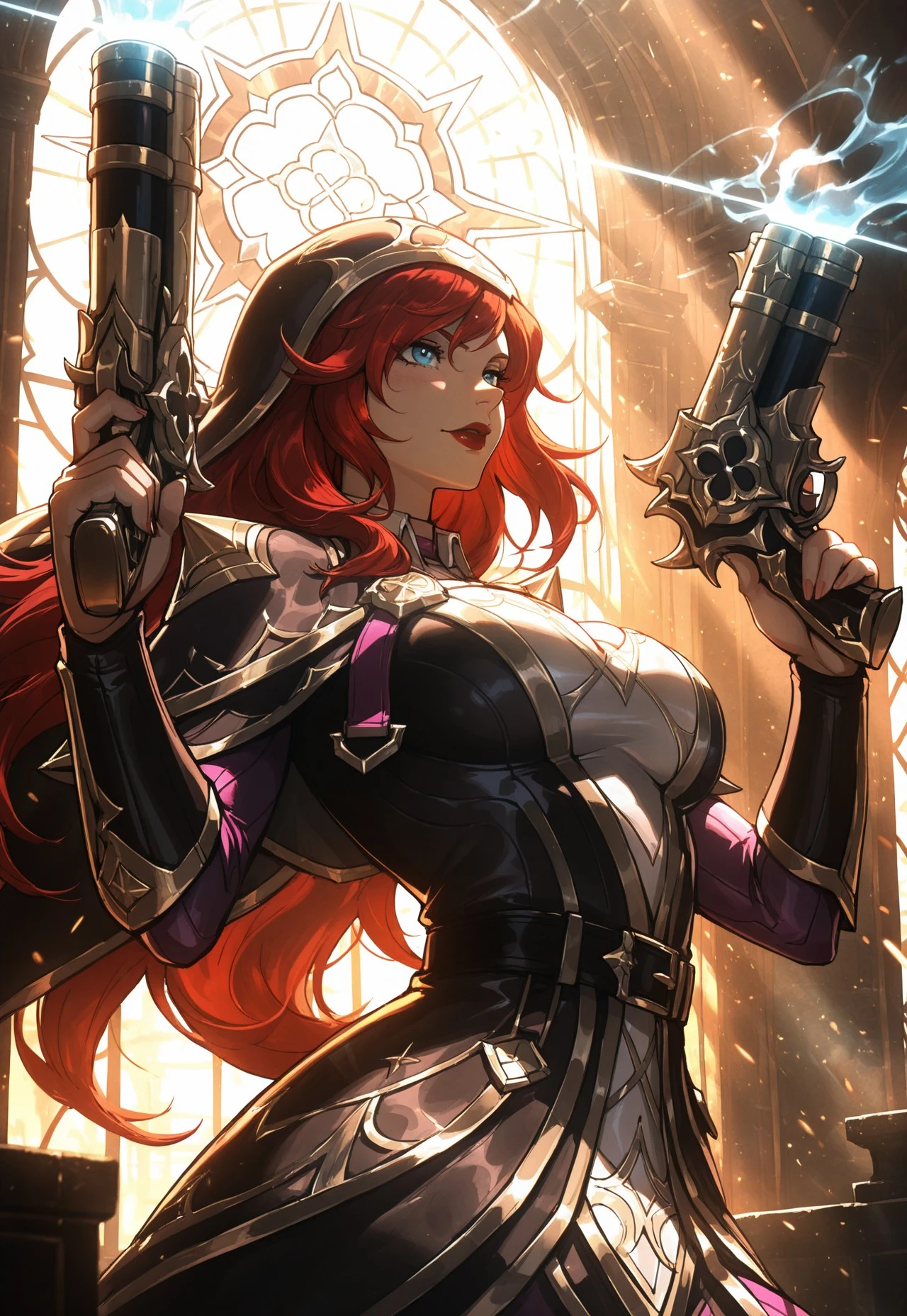 BCmsfortune,red hair,long hair,red lips,blue eyes,multicolored dress,dual wielding,holding guns,cloak,armor,belt,