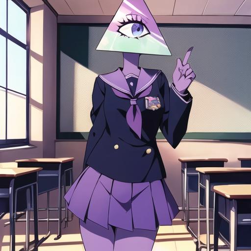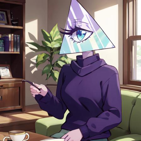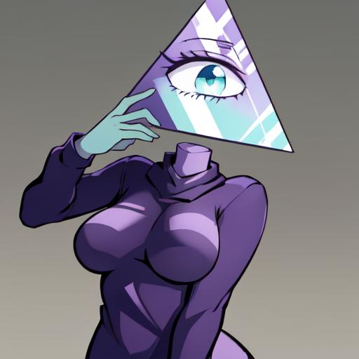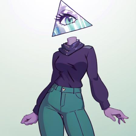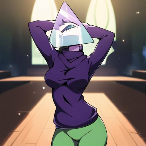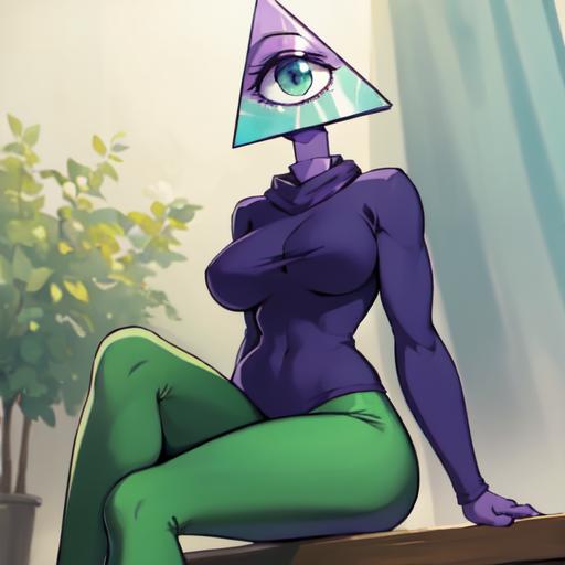 1. Illuminaughtii, 1girl, colored skin, purple sweater, cyclops, turtleneck, light green leggings, purple skin,