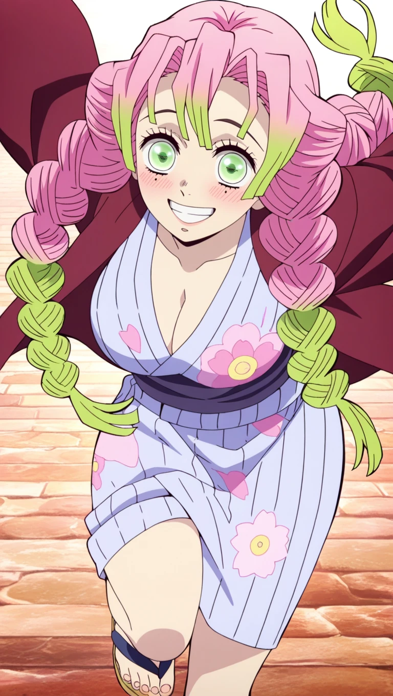 m1tsur1, green eyes, pink and green hair, multicolored hair, gradient hair, long hair, bangs, mole, mole under eye,