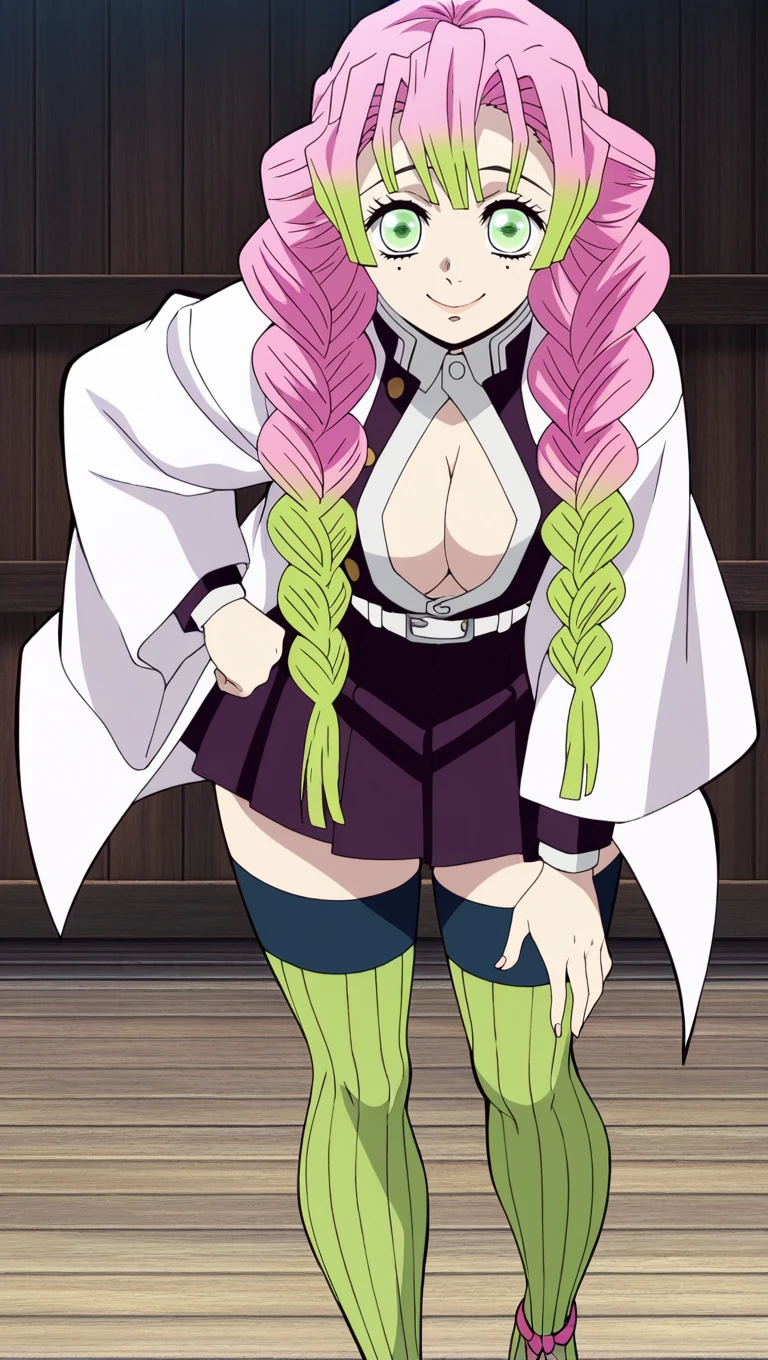 h4sh1r4 outfit, purple haori, white undershirt, white belt, pink sandals, white robe, purple skirt, green thigh socks, ????????????, ???????, ?????????????, cleavage, zettai ryouiki,