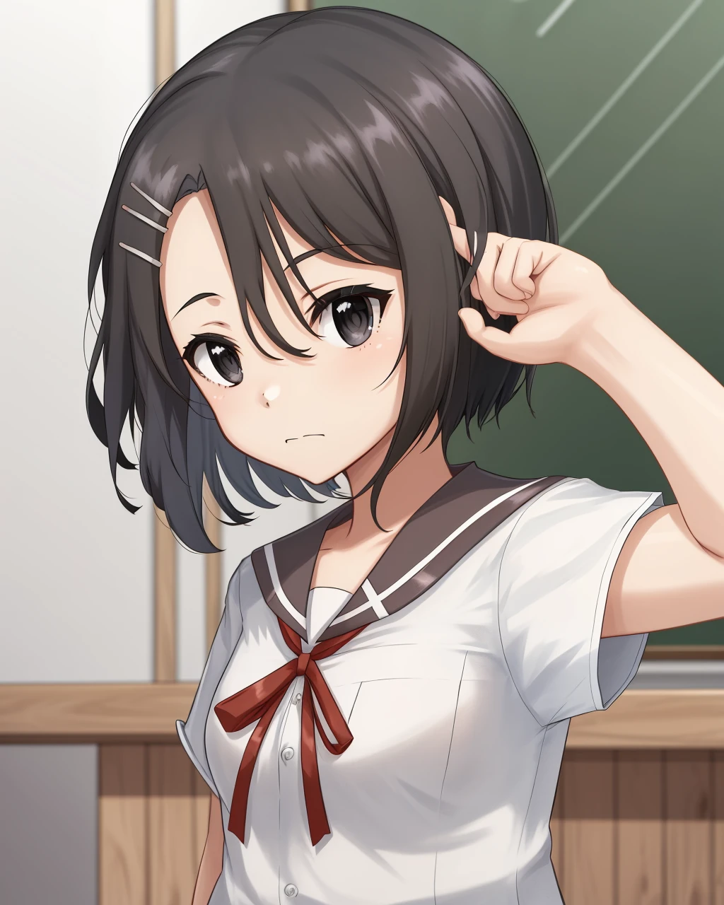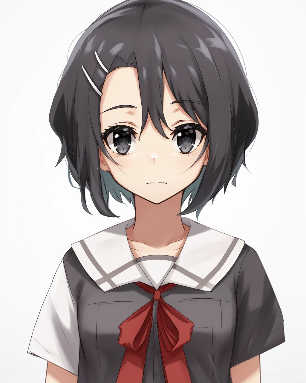 1girl,solo,school uniform, black hair,black eyes,hair ornament,short hair,serafuku,short sleeves, ribbon,
