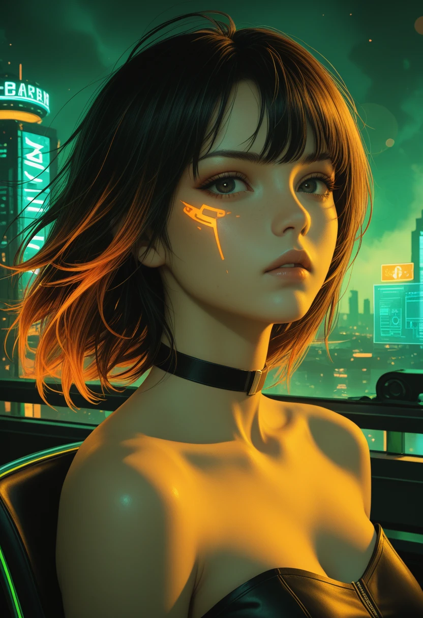 pos: dynamic composition, dynamic action pose, woman with messy punk-styled hair wearing a black choker and strapless black top illuminated by vibrant neon orange and green light streaks across her face and chest. her expression is serious and slightly intense with full lips and dark eyes. the background is a blurred cityscape with tall glowing neon signs in green and orange creating a cyberpunk atmosphere. the light creates dramatic shadows and highlights on her face emphasizing her features. the perspective is close-up focusing on her upper body and face. the overall color palette is dominated by warm oranges and cool greens with a misty foggy effect in the background. the image has a high-contrast moody and futuristic style., scenery, starship bridge, holographic displays, panoramic view of a nebula, captain's chair, sleek metal, lens flare, futuristic, detailed background