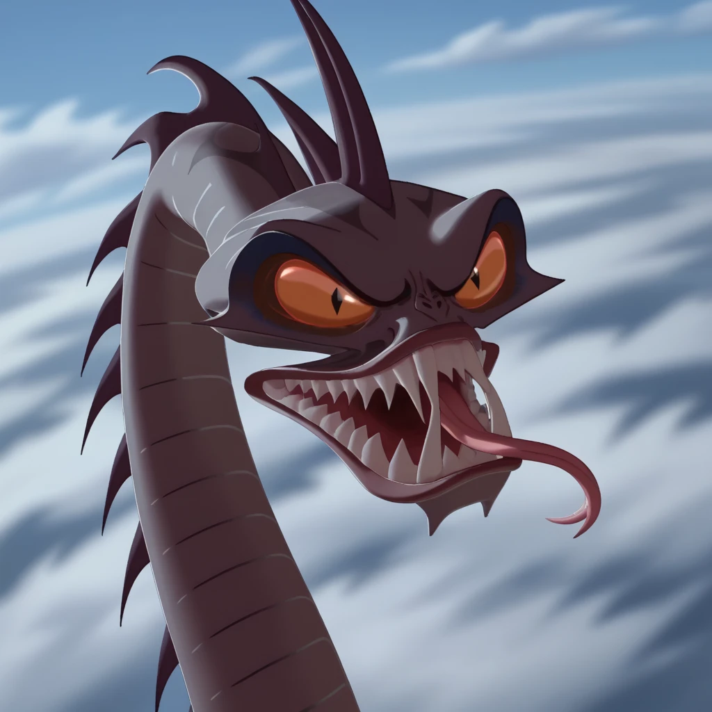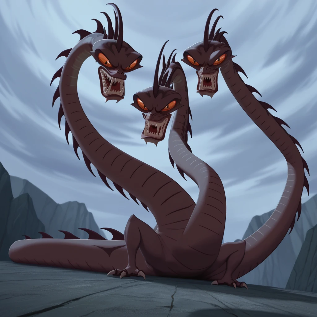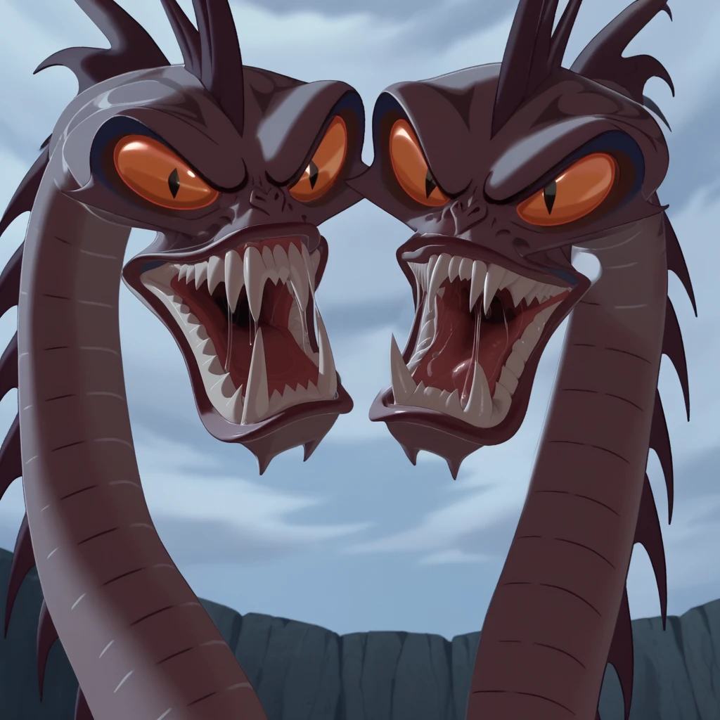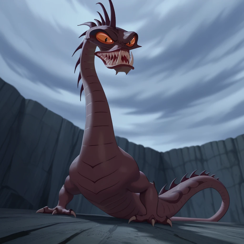 herchyd, hydra, serpent, fangs, sharp teeth, orange sclera, black eyes, slit pupils, 2 legs, toe claws, long neck, armless, tail