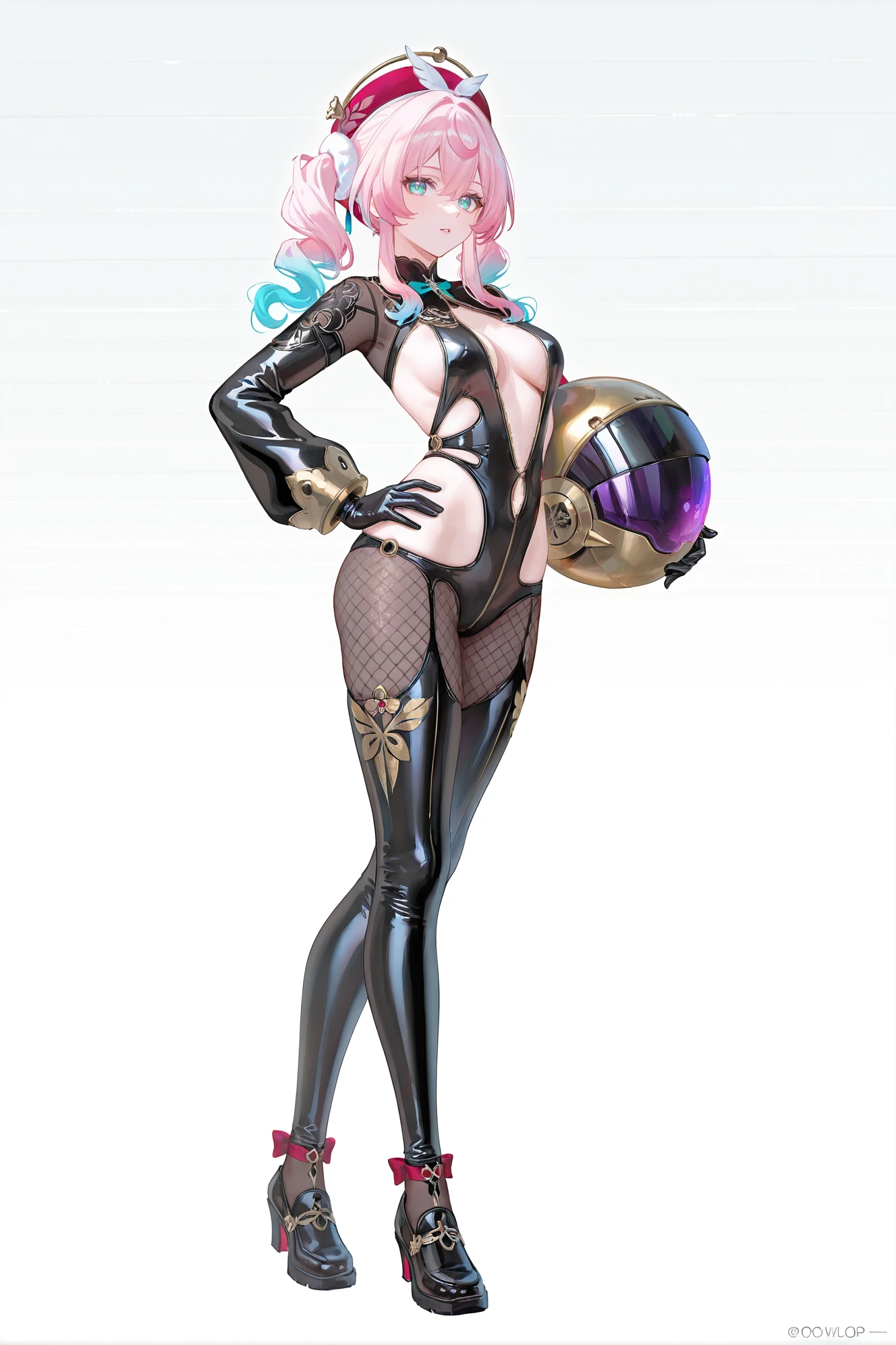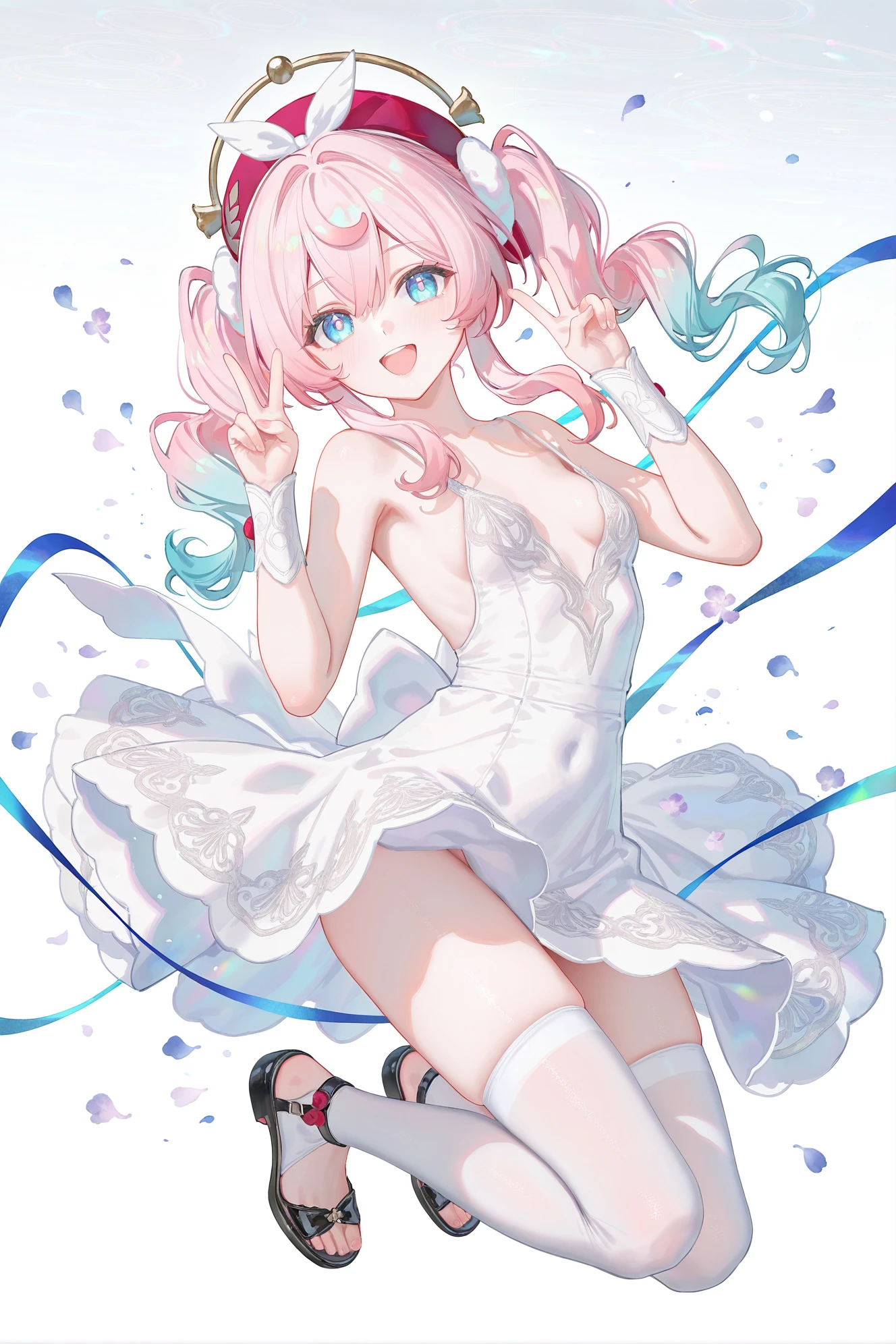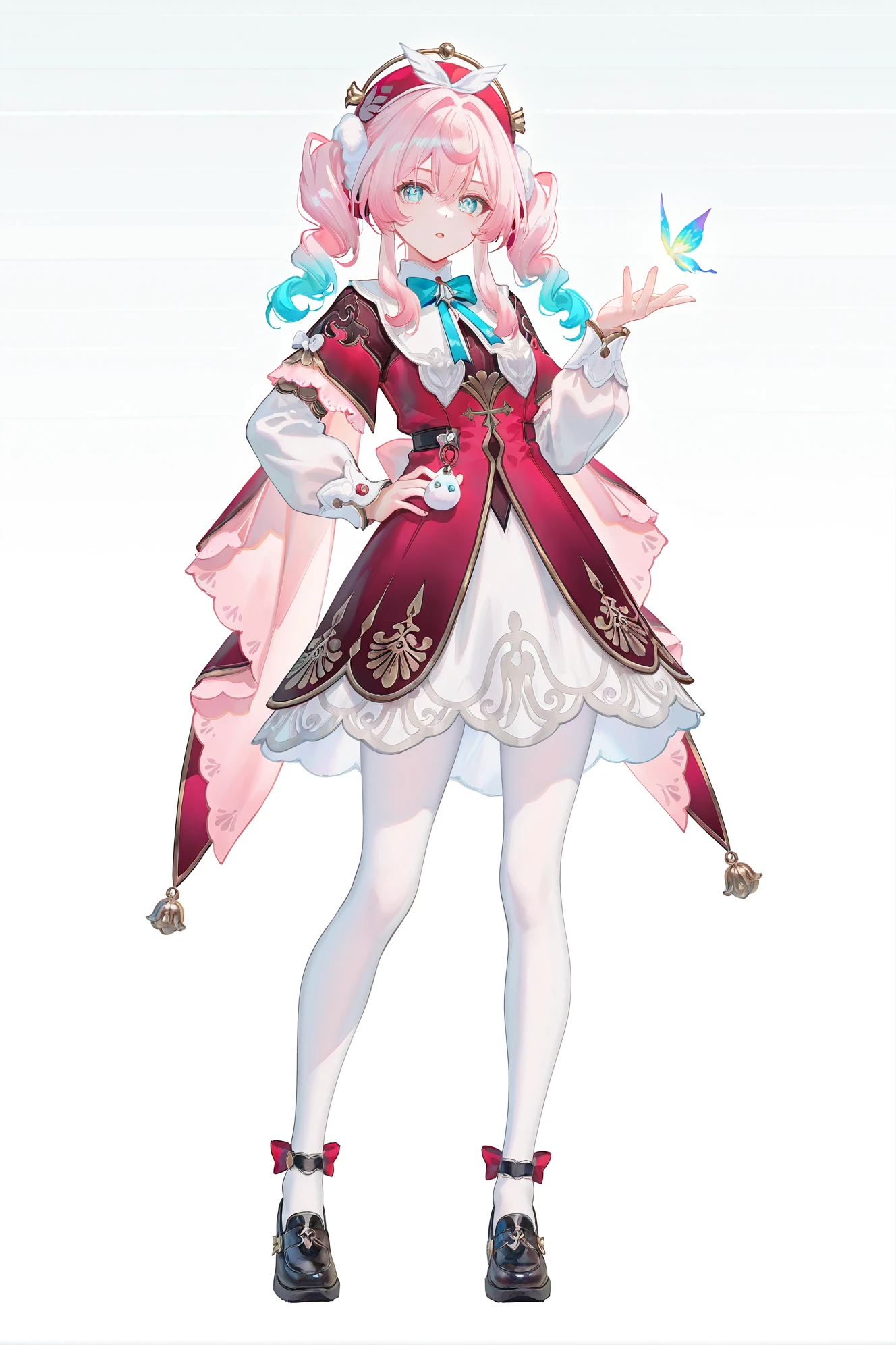 hyacine \(honkai: star rail\), clothes: hyacine def red and white dress, red beret, 1girl, pink hair, black footwear, white pantyhose,
