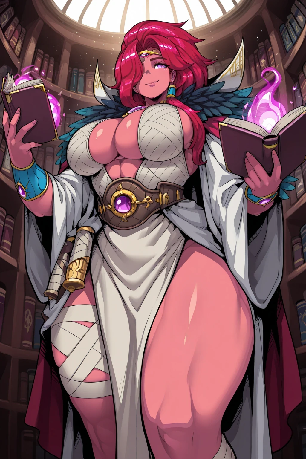magnasdxl, red hair, long hair, colored skin, pink skin, purple eye, single eye, large breasts, muscular female,