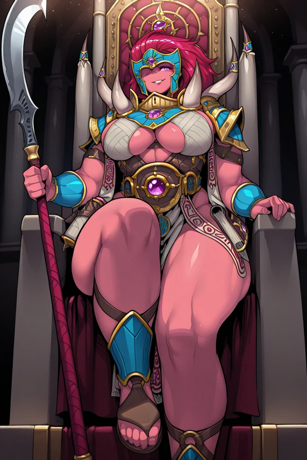 horned_og_armor, side boob, shoulder pads, bracers, sandals