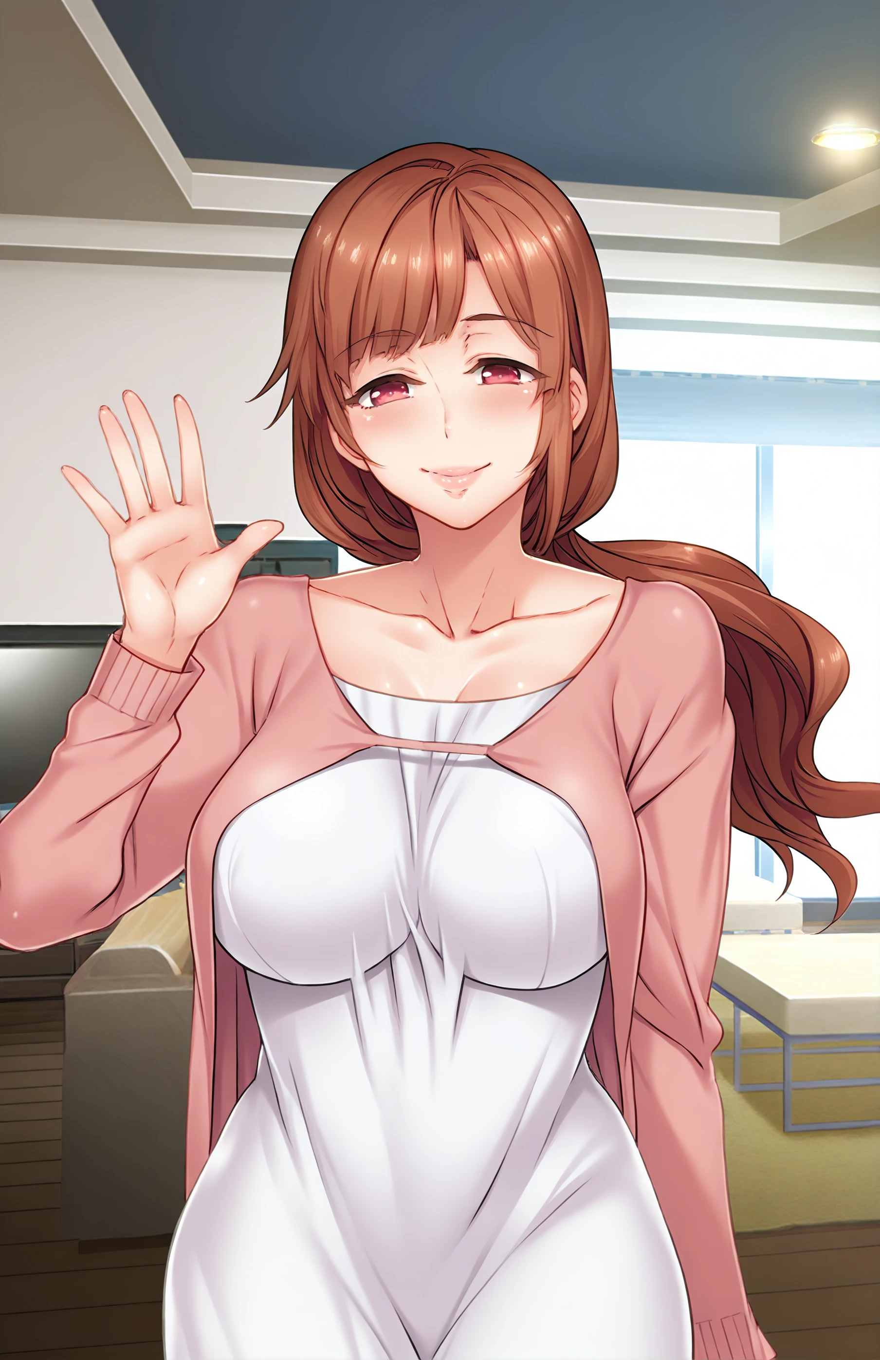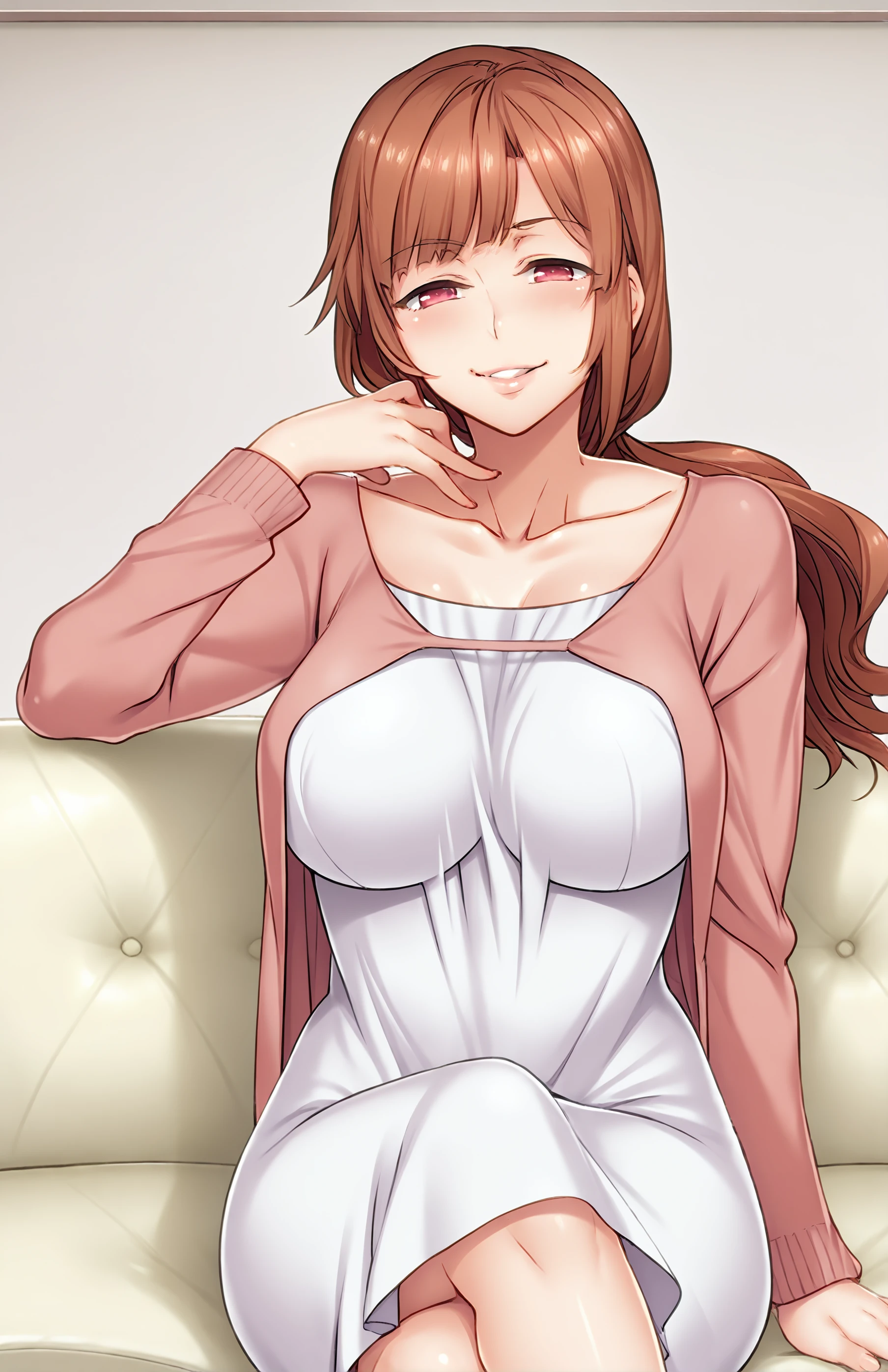 EndouMarie, long hair, breasts, bangs, large breasts, brown hair, red eyes, long sleeves, dress, collarbone, ponytail, white dress, cardigan, mature female