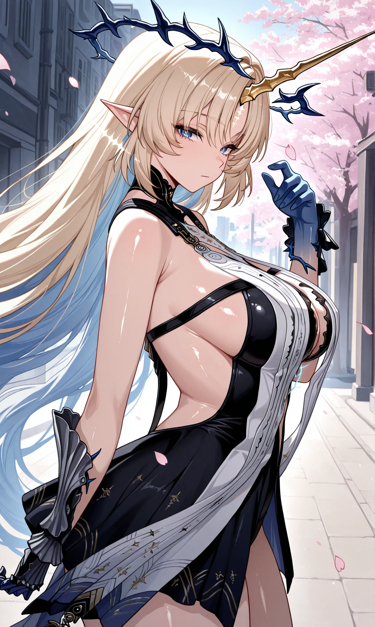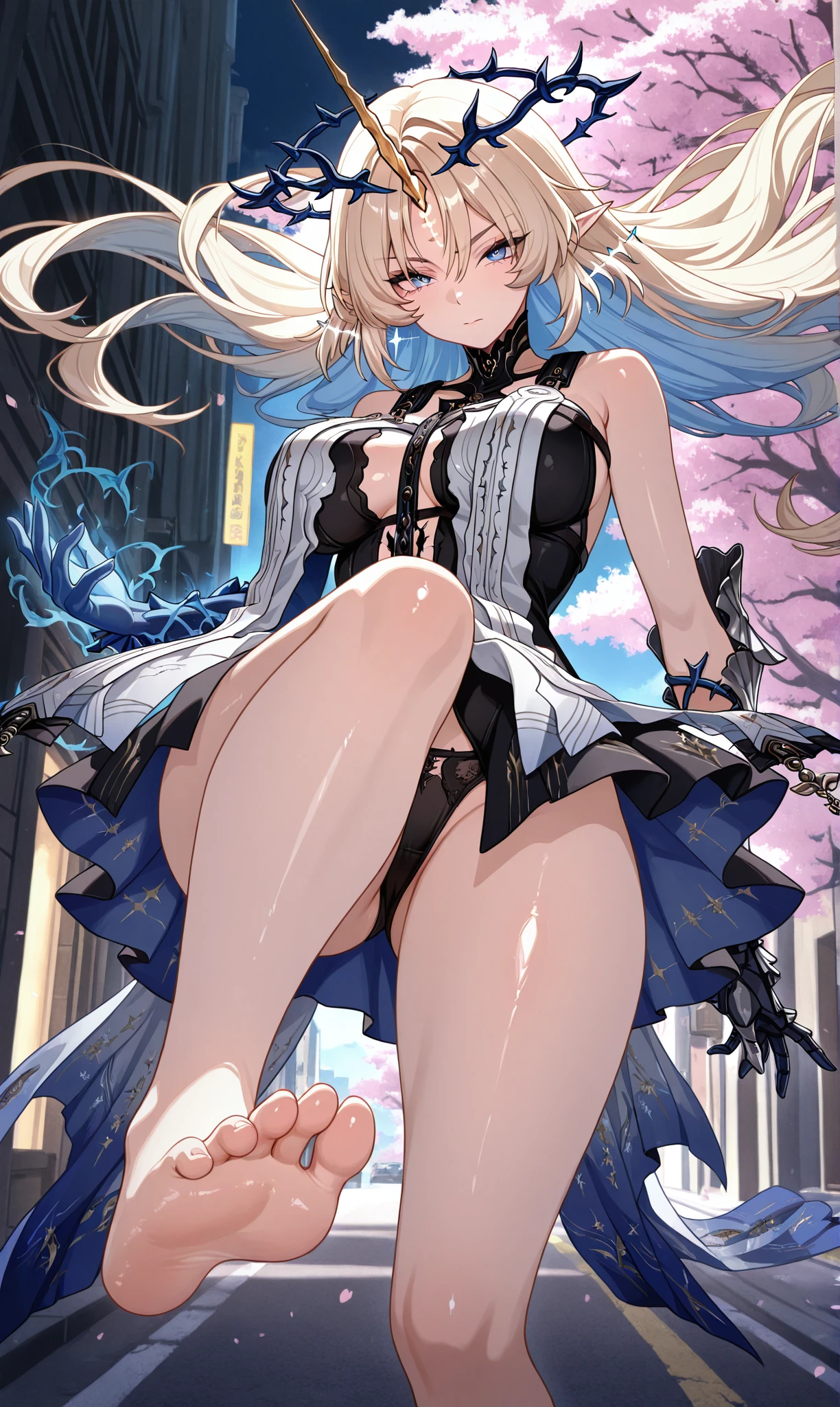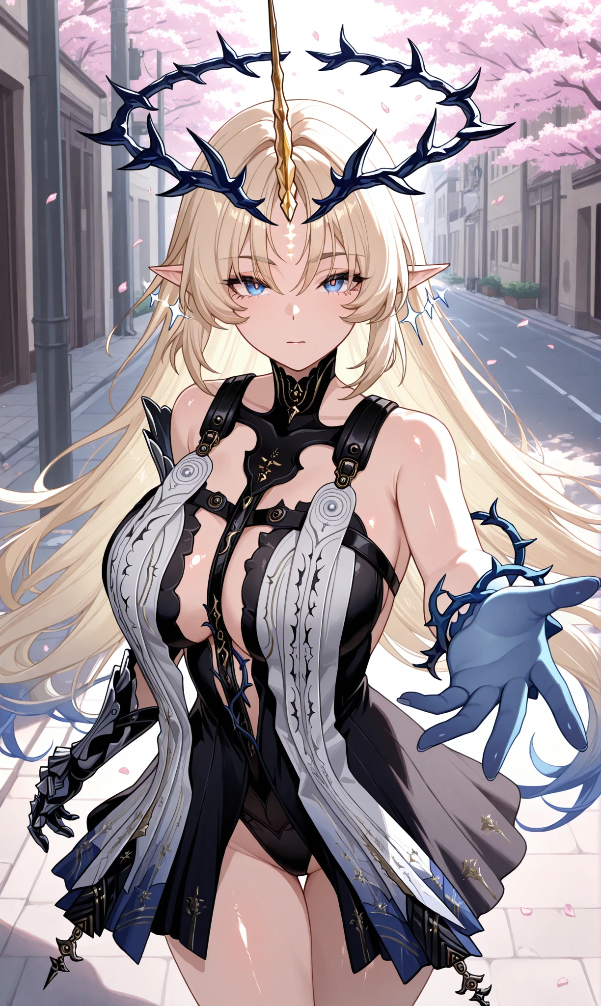 fleurdelys (wuthering waves), blue eyes, blonde hair, very long hair, blue hair, multicolored hair, pointy ears, gradient hair, horns, single horn, crown of thorns, yellow horns ๐ข๐๐๐ณ๐ถ๐: