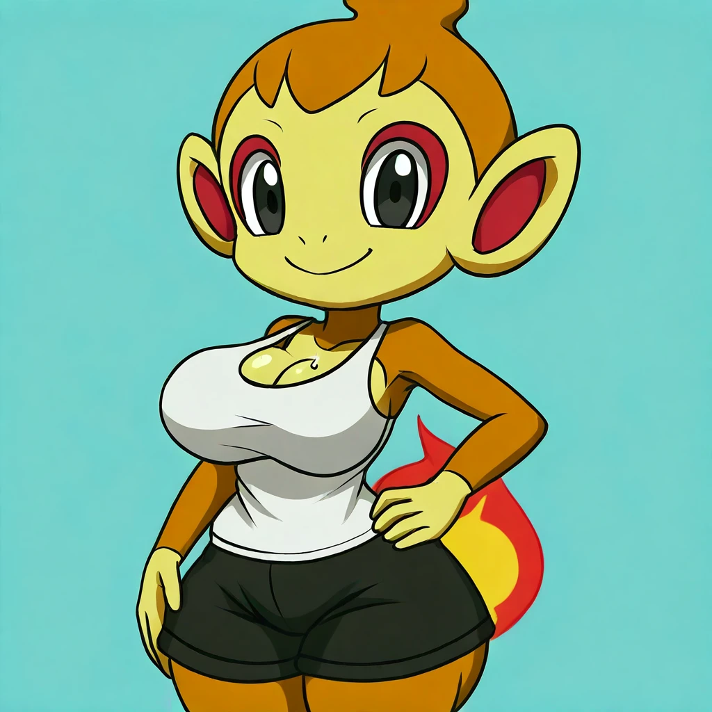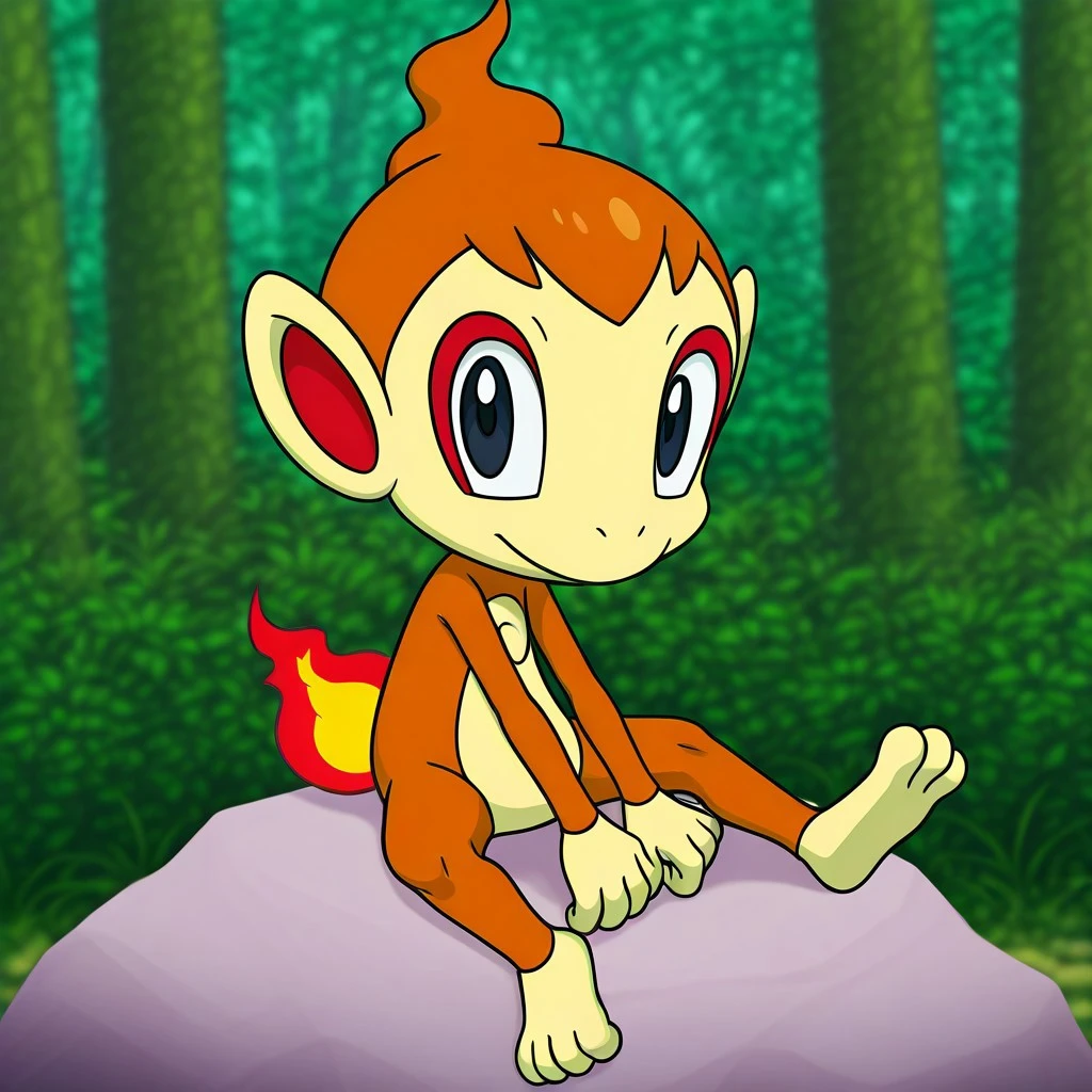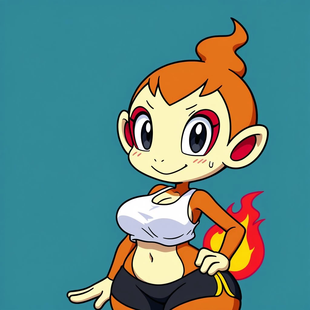 primate, monkey, orange and tan fur, black eyes, red eyeliner, red inner ears, fire tail,