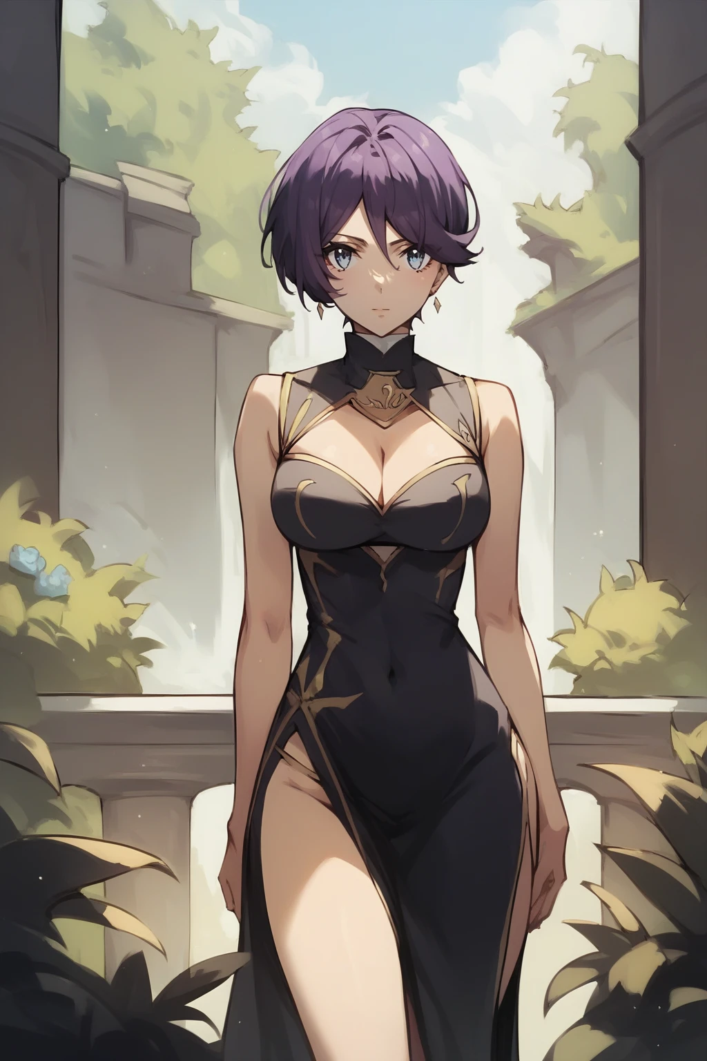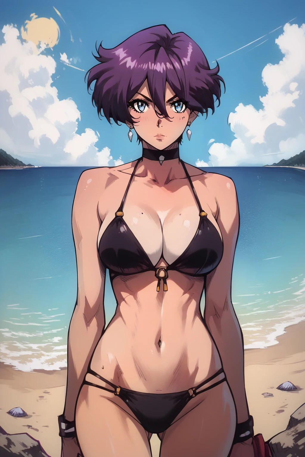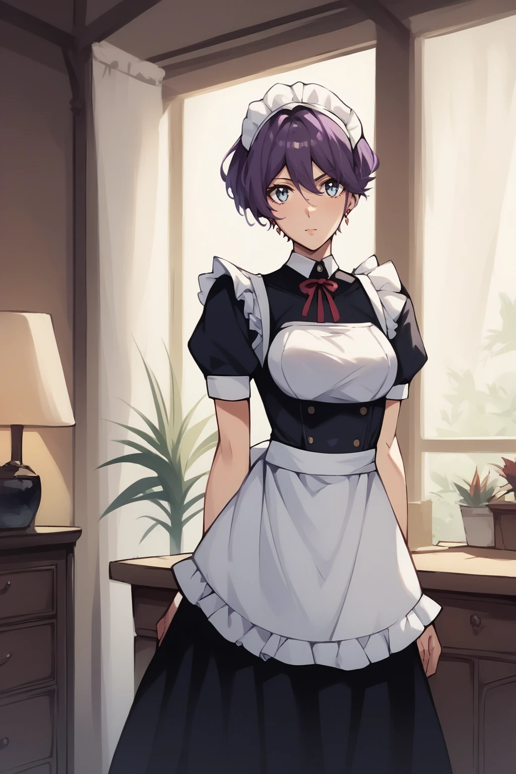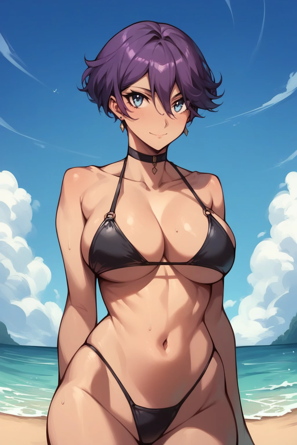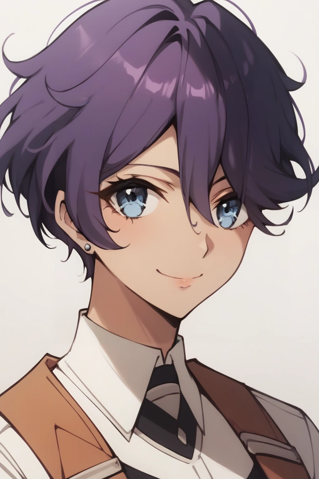 short hair, purple hair, blue eyes