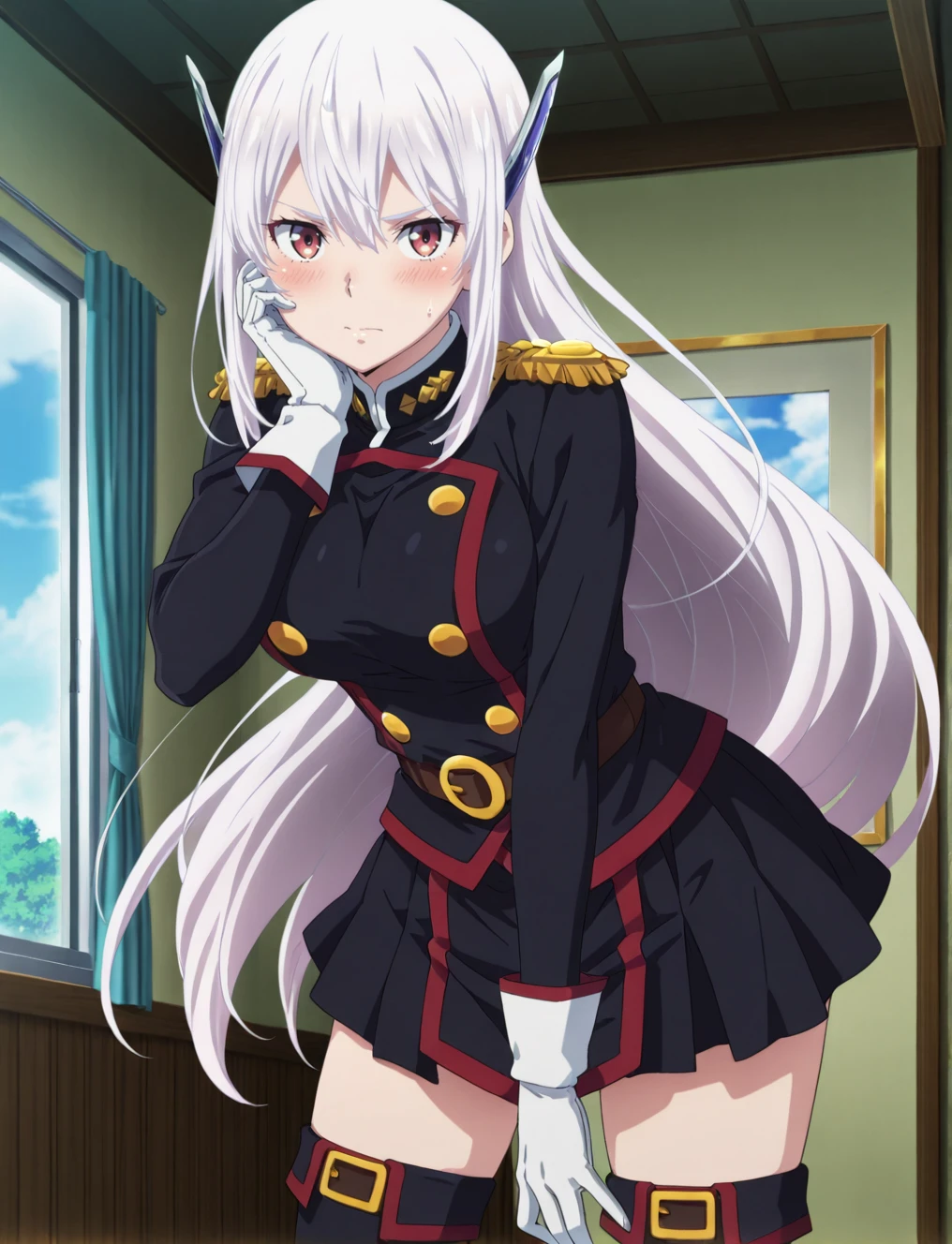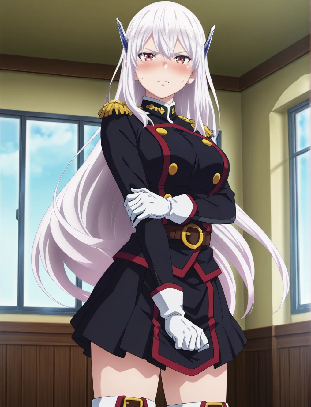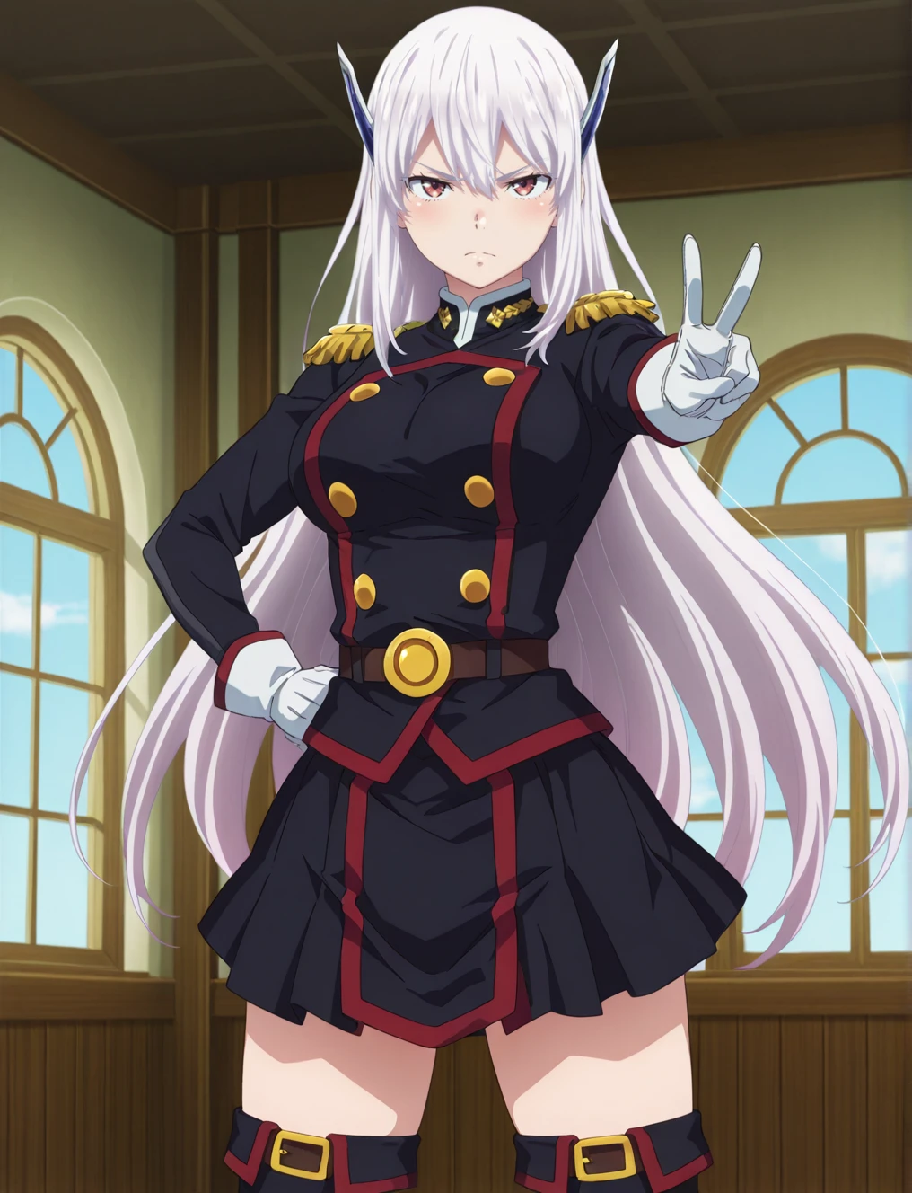 military uniform, white gloves, skirt, thigh boots
