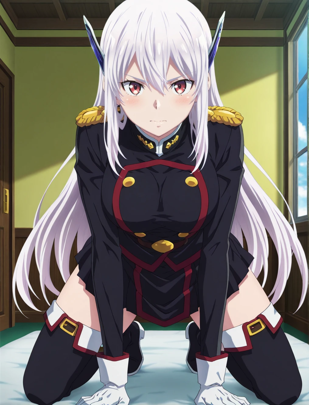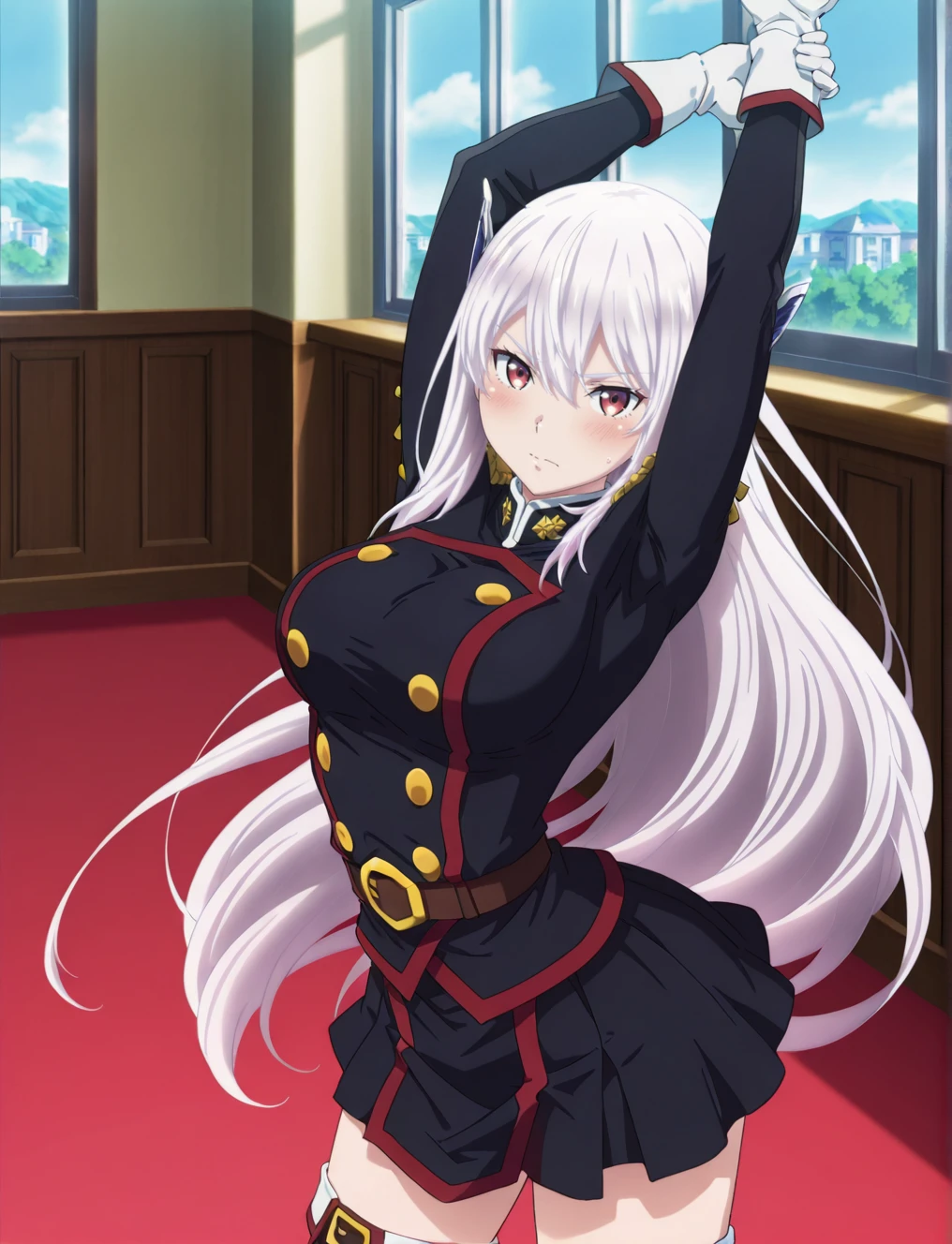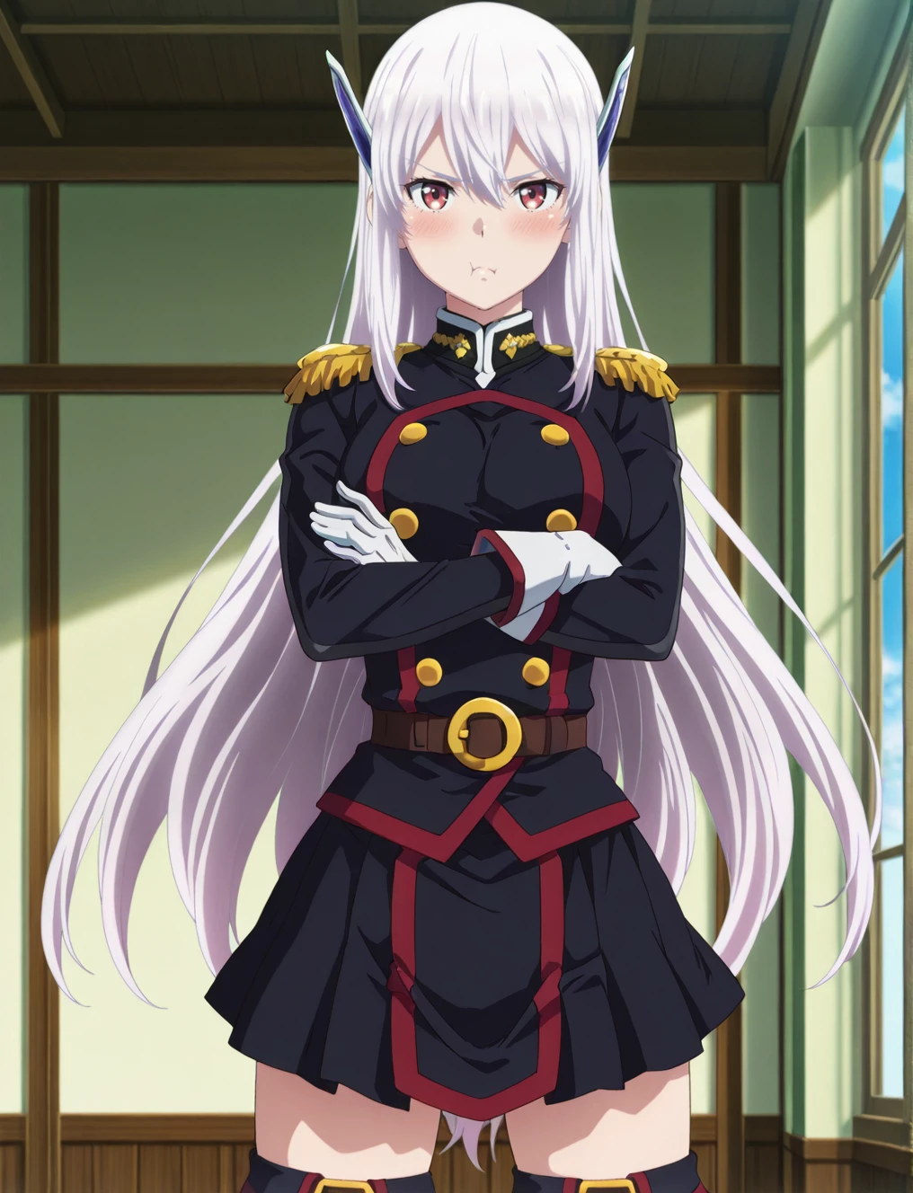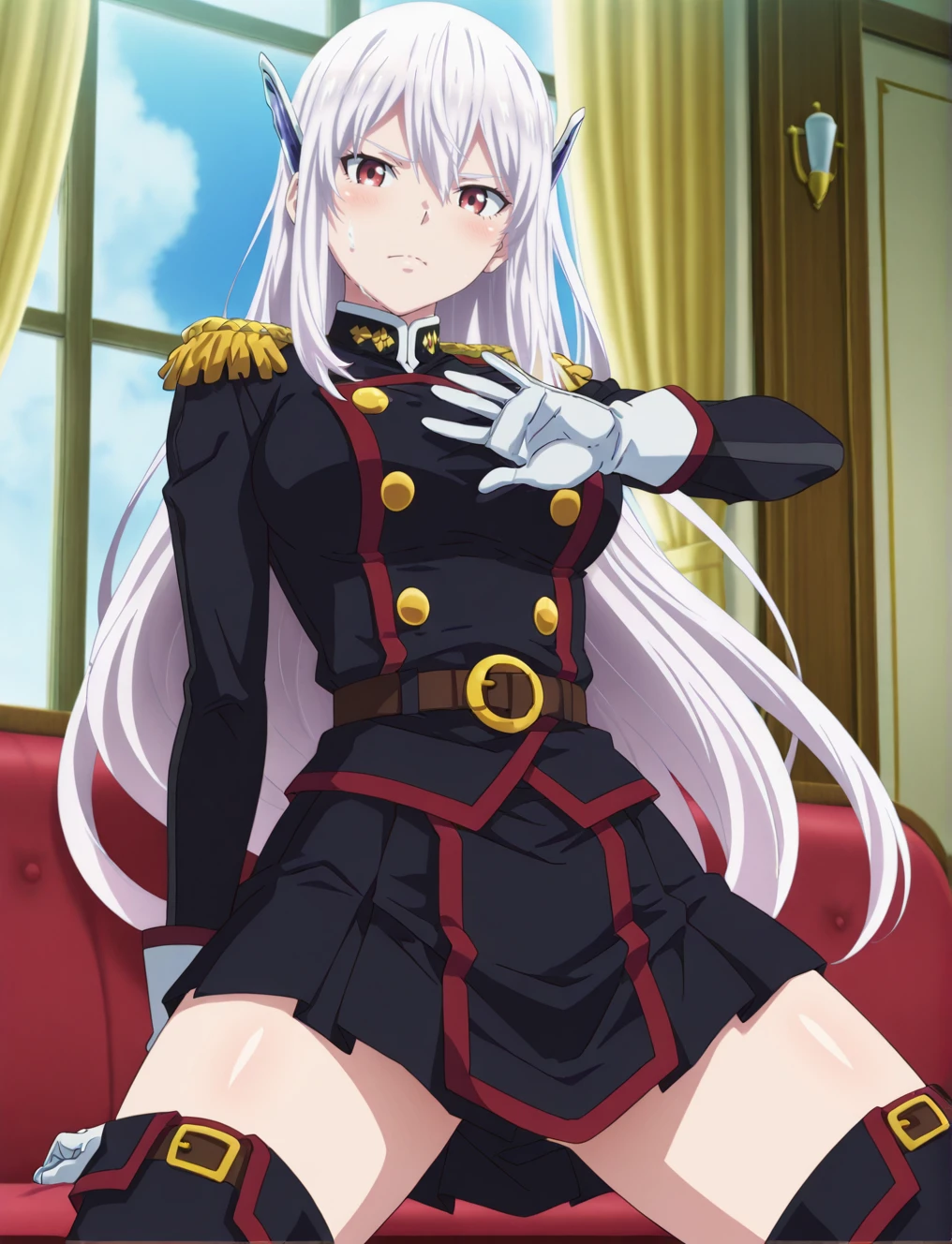 military uniform, white gloves, skirt, thigh boots