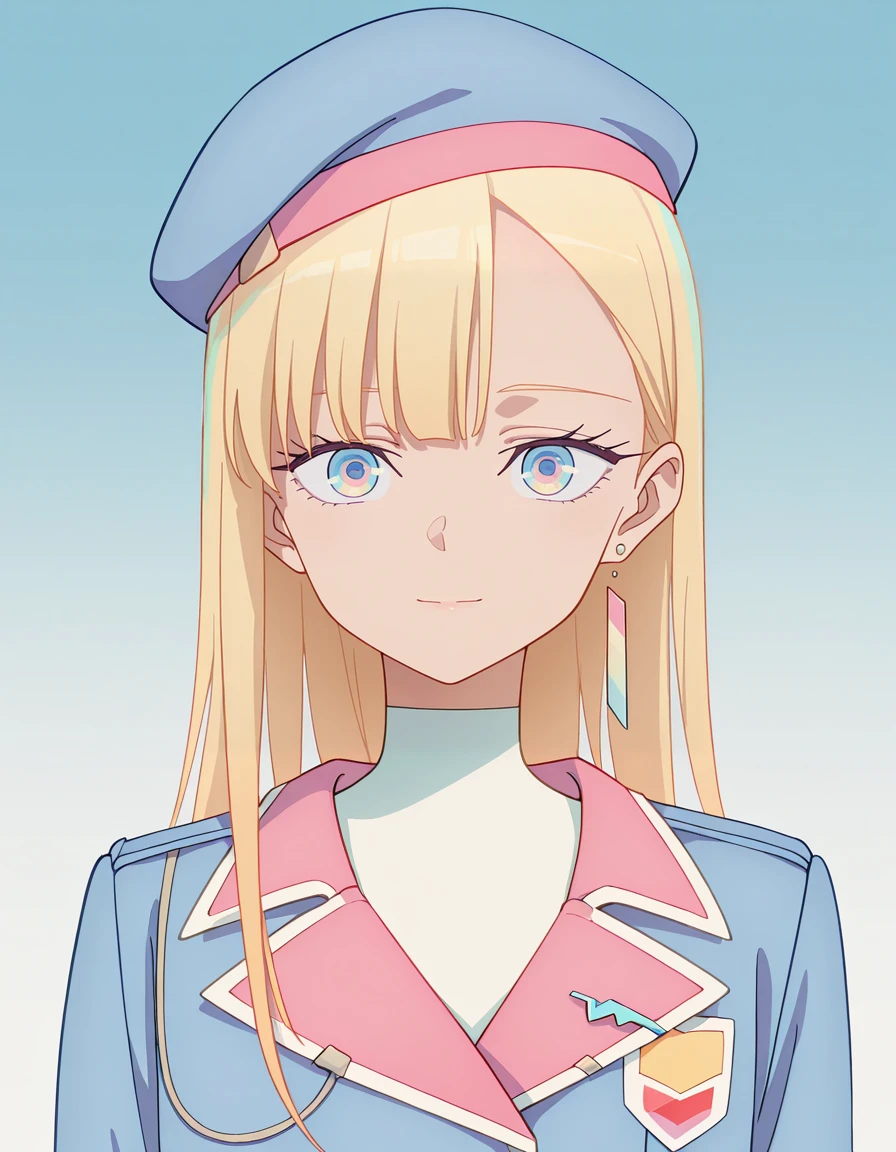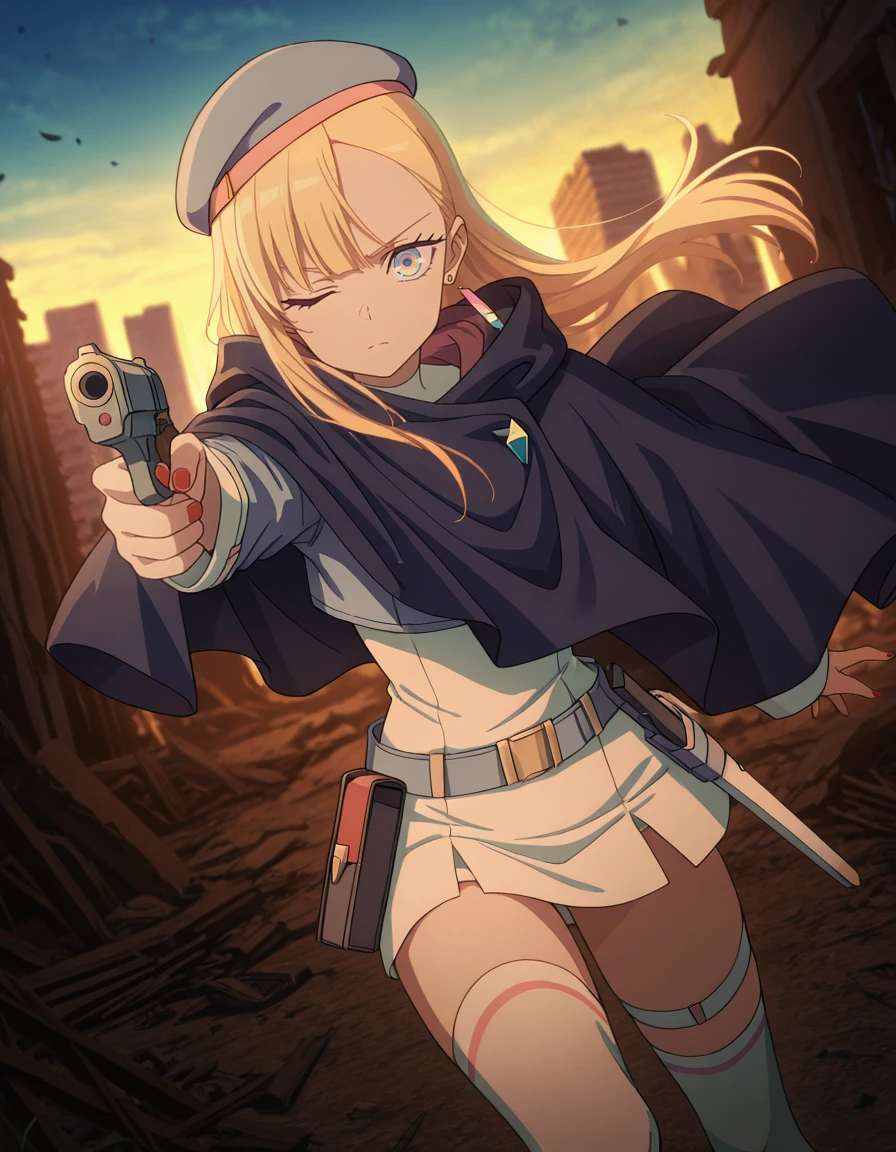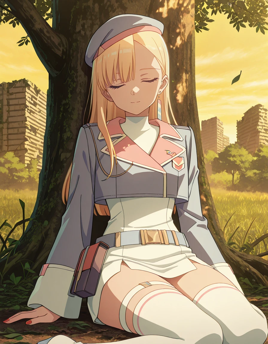 blue beret, single floating earrings, high collar, cropped jacket, aiguillette, badge, white dress, long sleeves, wide sleeves, belt, belt pouch, ??????, thigh strap, white thighbootsOutfit - W/o jacket
