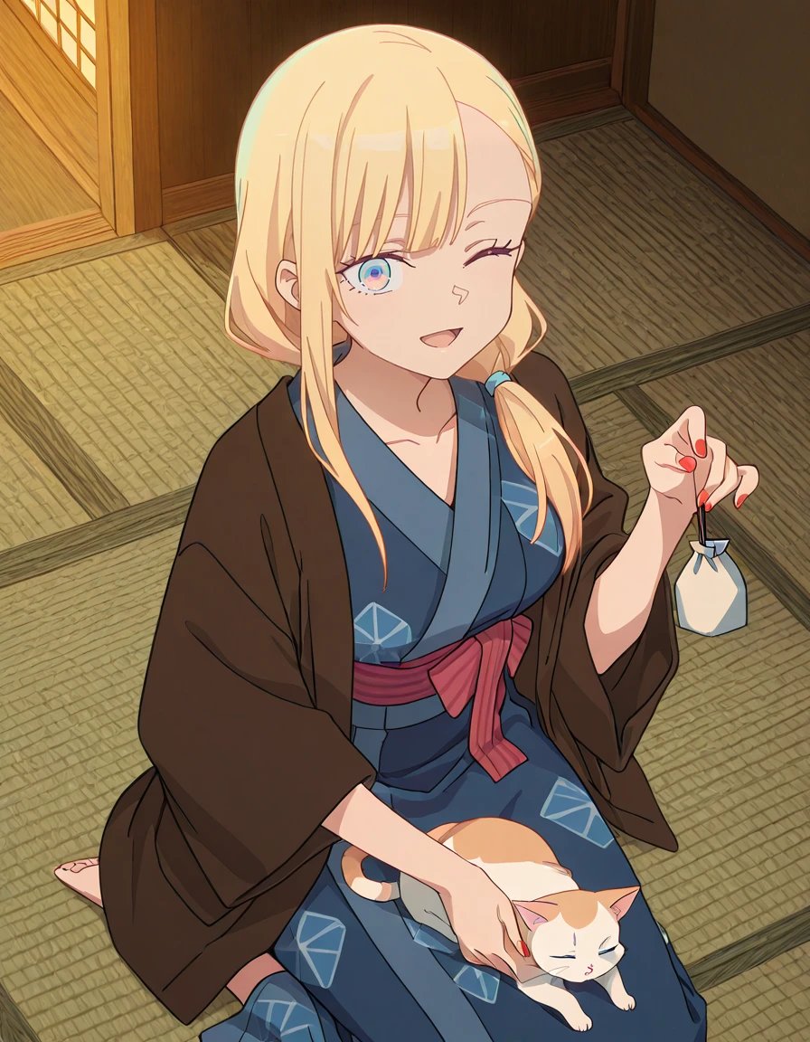<lora:yuugure-towa_no_yuugure_s1-v3-ixl-anime-soralz:1>, yuugure (towa no yuugure), alternate hairstyle 1, long hair, blonde hair, low side ponytail, hair over shoulder, asymmetrical bangs, single sidelock, blue eyes, multicolored eyes, (green eyes:0.6), red nailsOutfit - Yukata