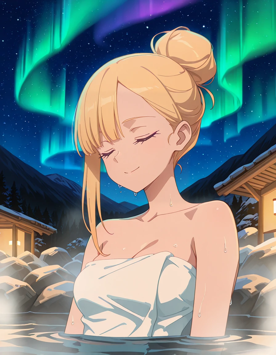<lora:yuugure-towa_no_yuugure_s1-v3-ixl-anime-soralz:1>, yuugure (towa no yuugure), alternate hairstyle 2, long hair, blonde hair, single hair bun, asymmetrical bangs, single sidelock, blue eyes, multicolored eyes, (green eyes:0.6), red nailsOutfit - Towel