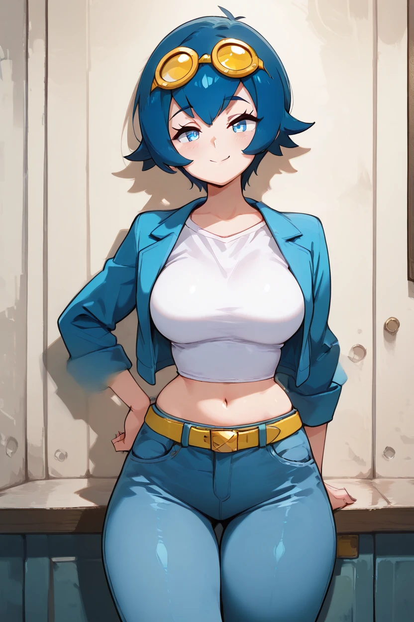 zzCLana, blue eyes, blue hair, short hair, white shirt, open clothes, midriff, denim pants, blue jacket, goggles, yellow belt,