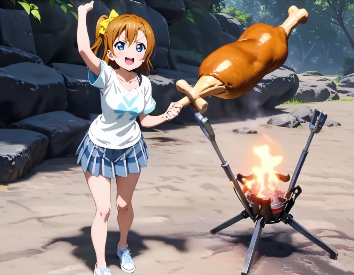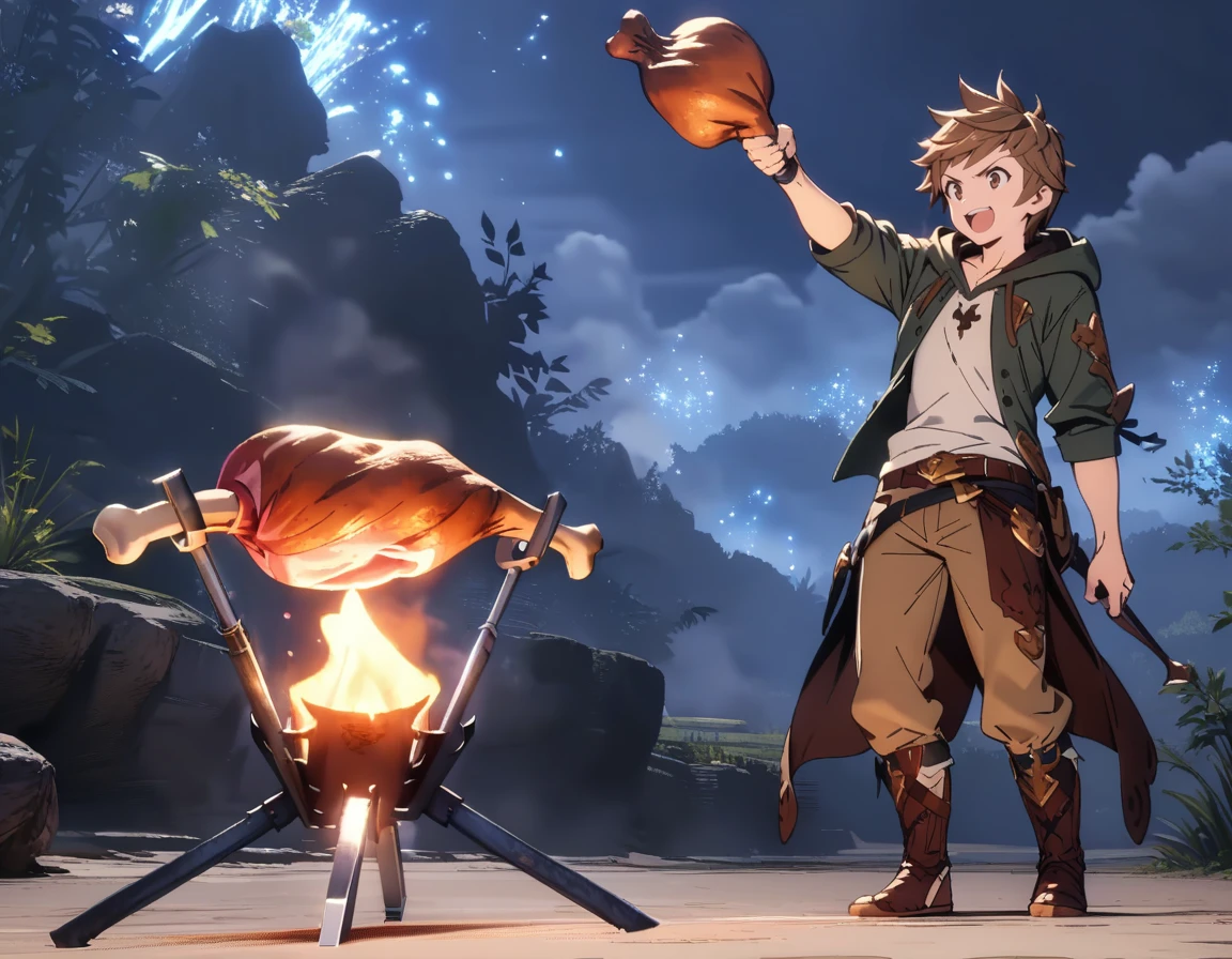 campfire,holding boned meat,standing,arm up,でお肉を持ち上げます。