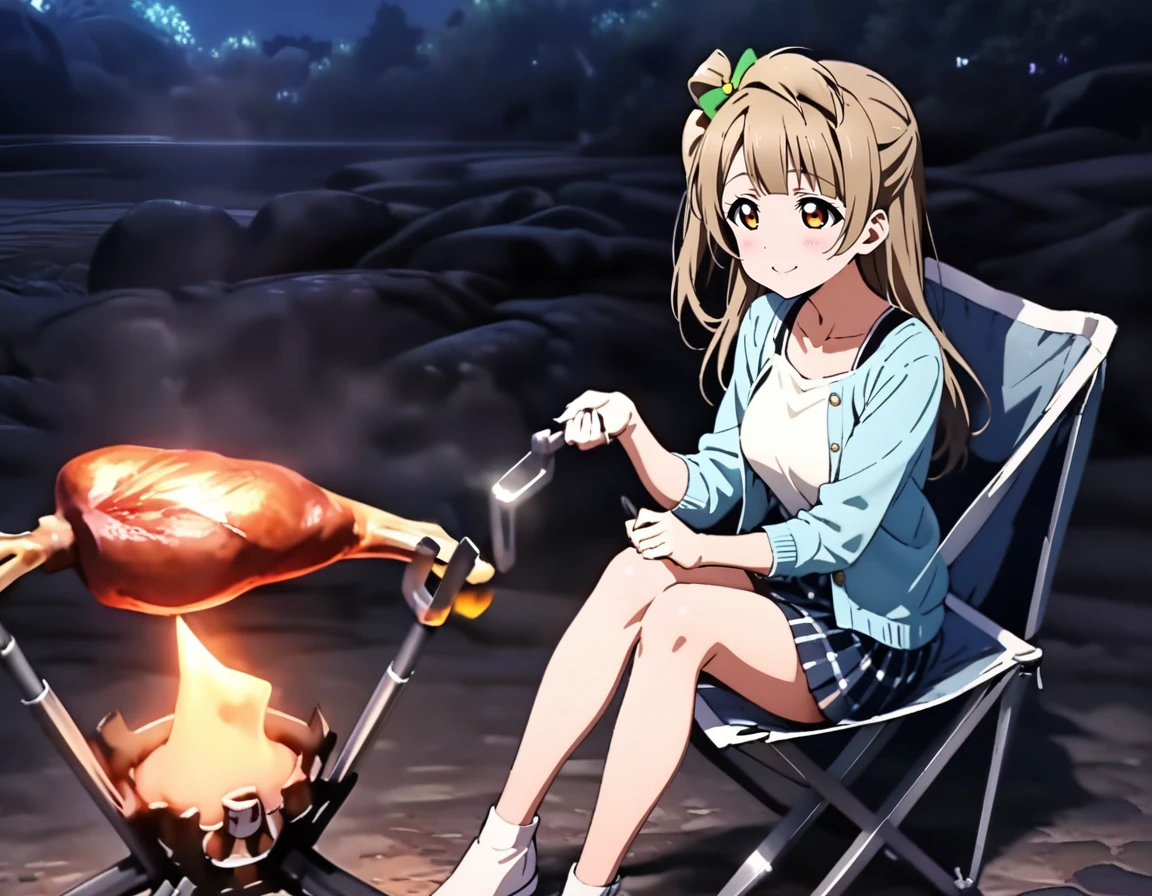 Put campfire,grilling,flame,cooking,boned meat,sitting,folding chair, to grill the meat.