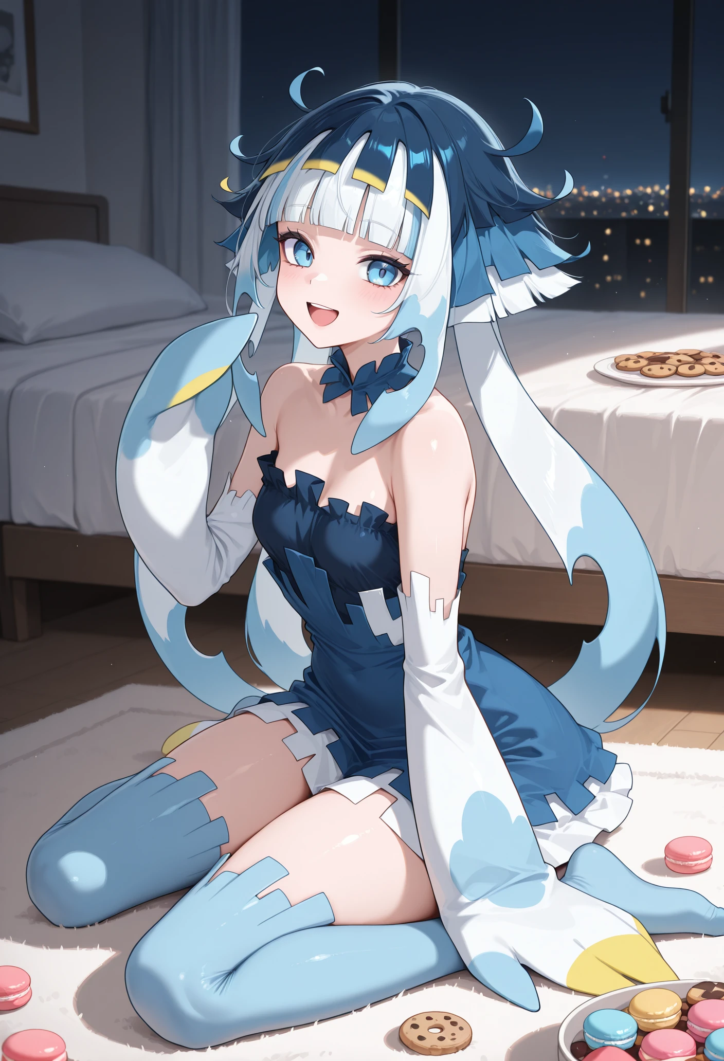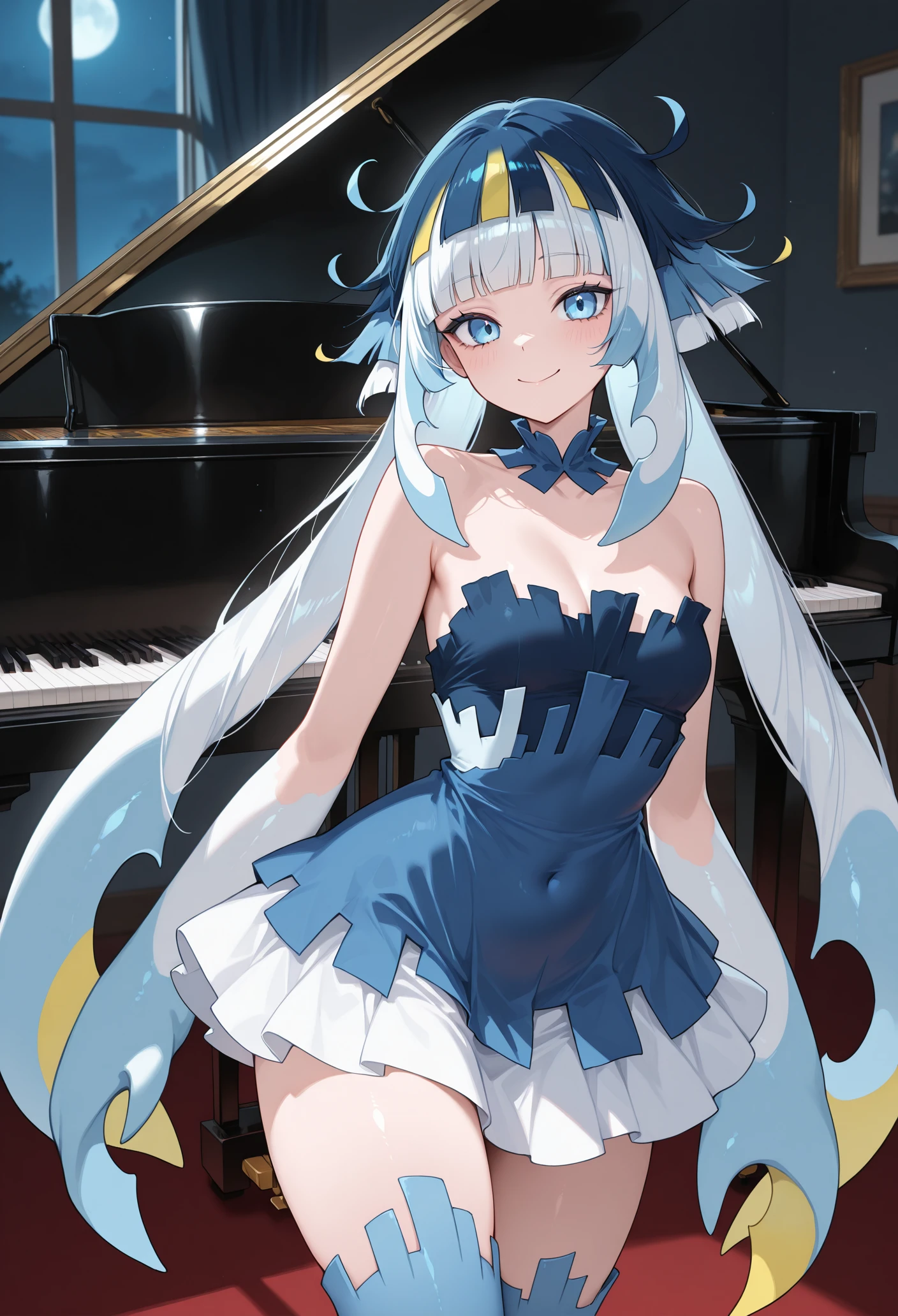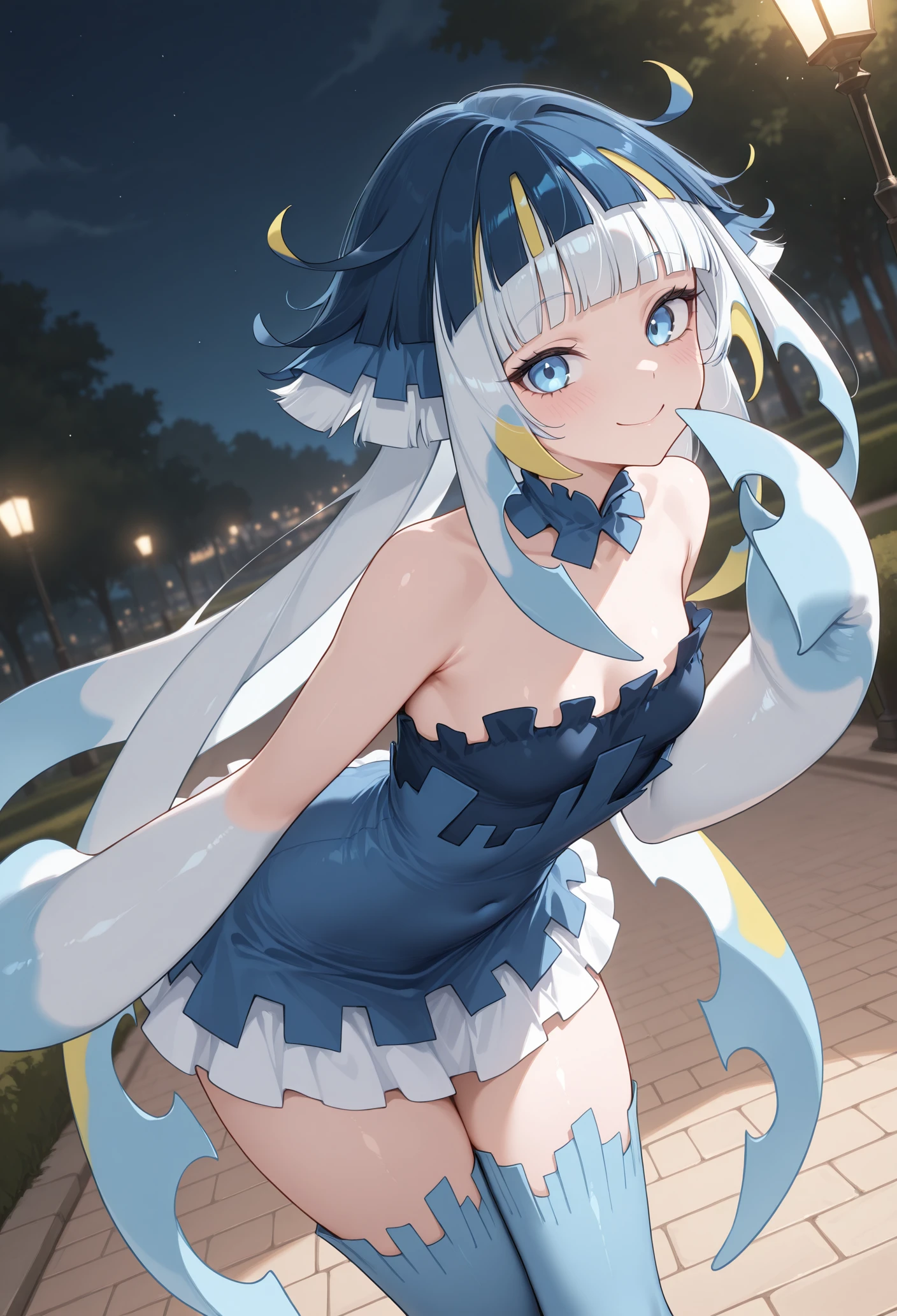 dress,bare shoulders,blue thighhighs,
